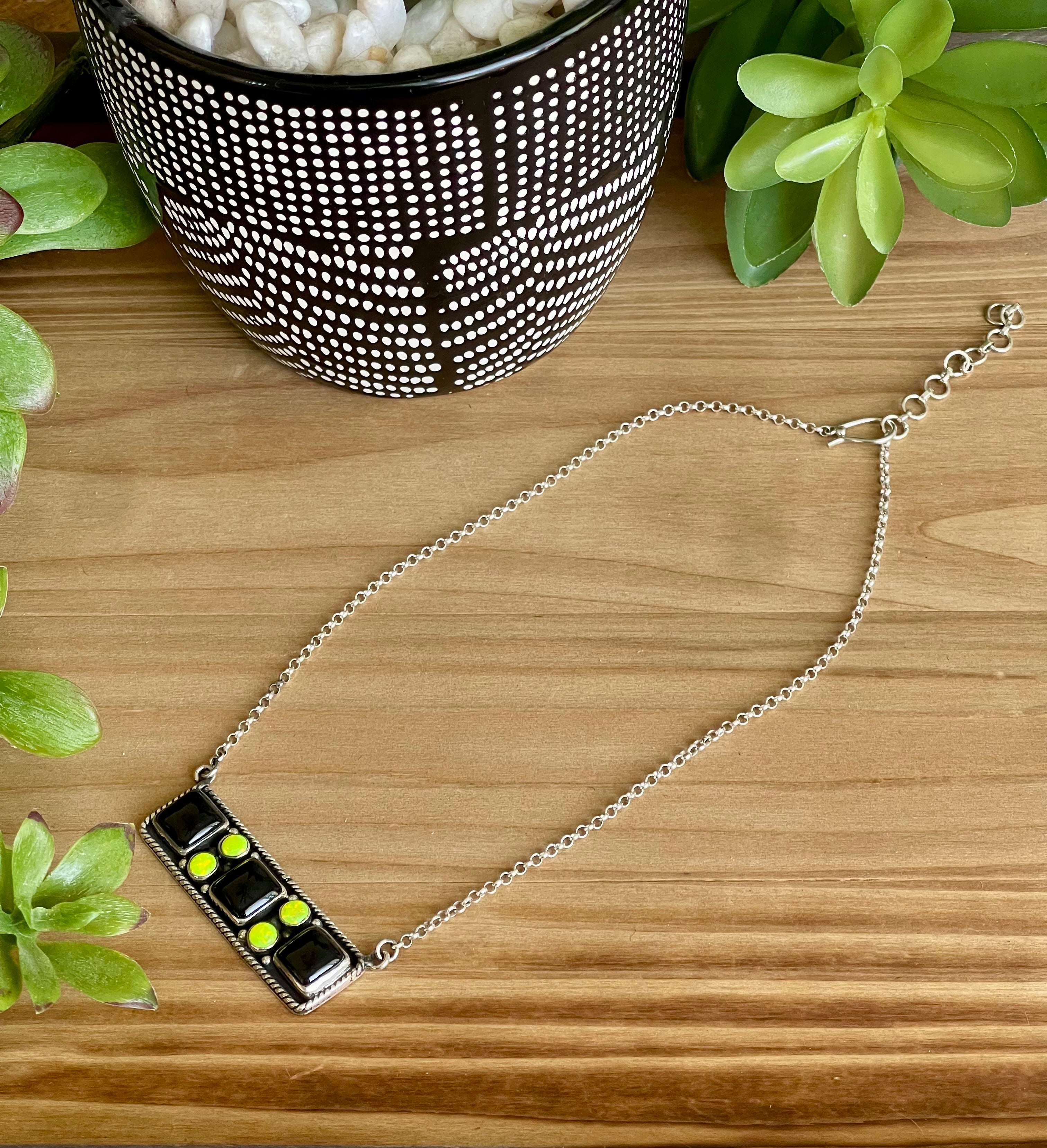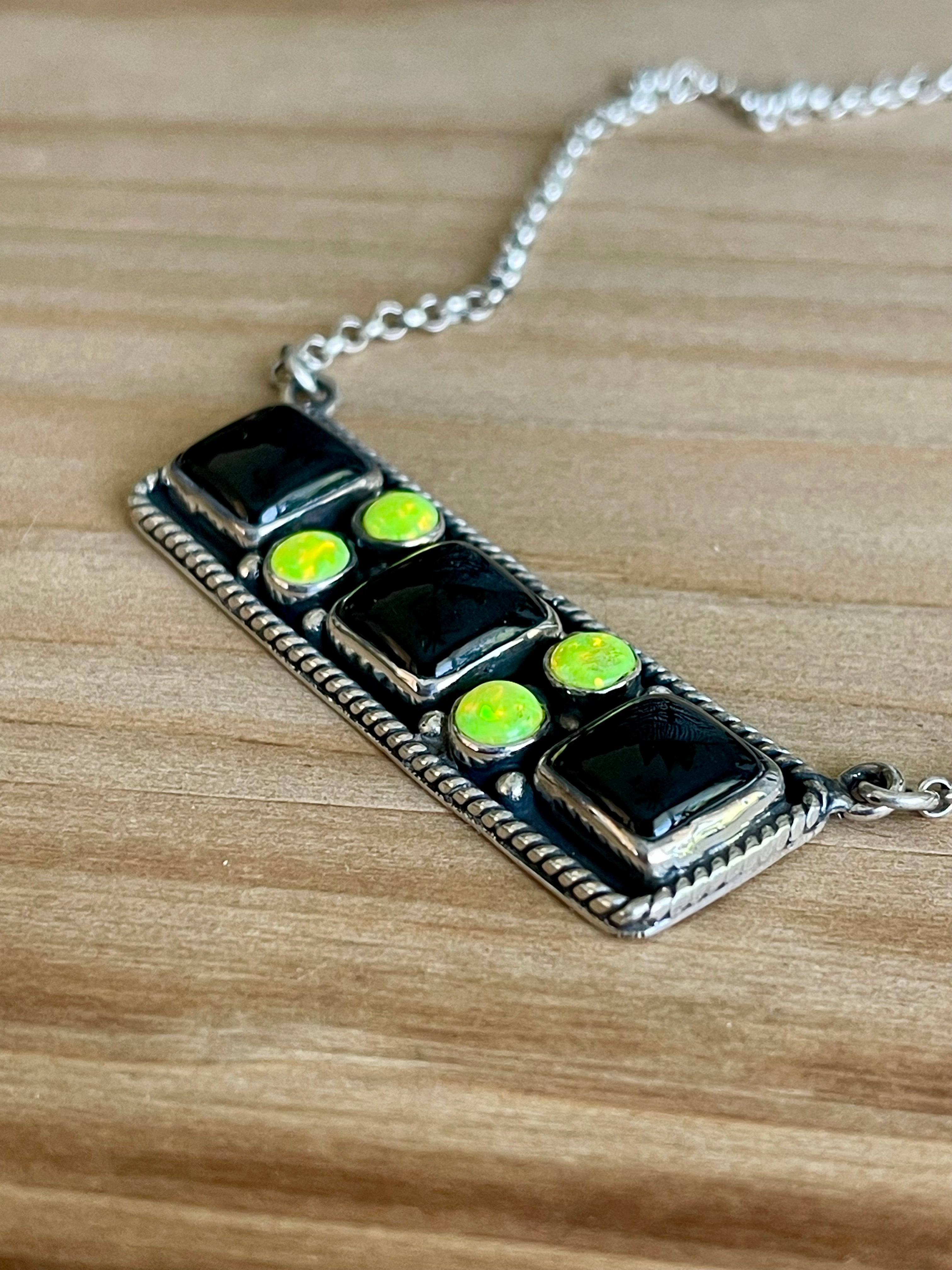 - Beautiful necklace. Southwest Handmade Multi Stone & Sterling Silver Bar Necklace. Stones include ; Black Onyx & Neon Opal (man made) It measures 15 1/2 inches long with hang while the chain by itself measures 16 inches long but can be adjusted down. Signed by the artist and stamped sterling silver.