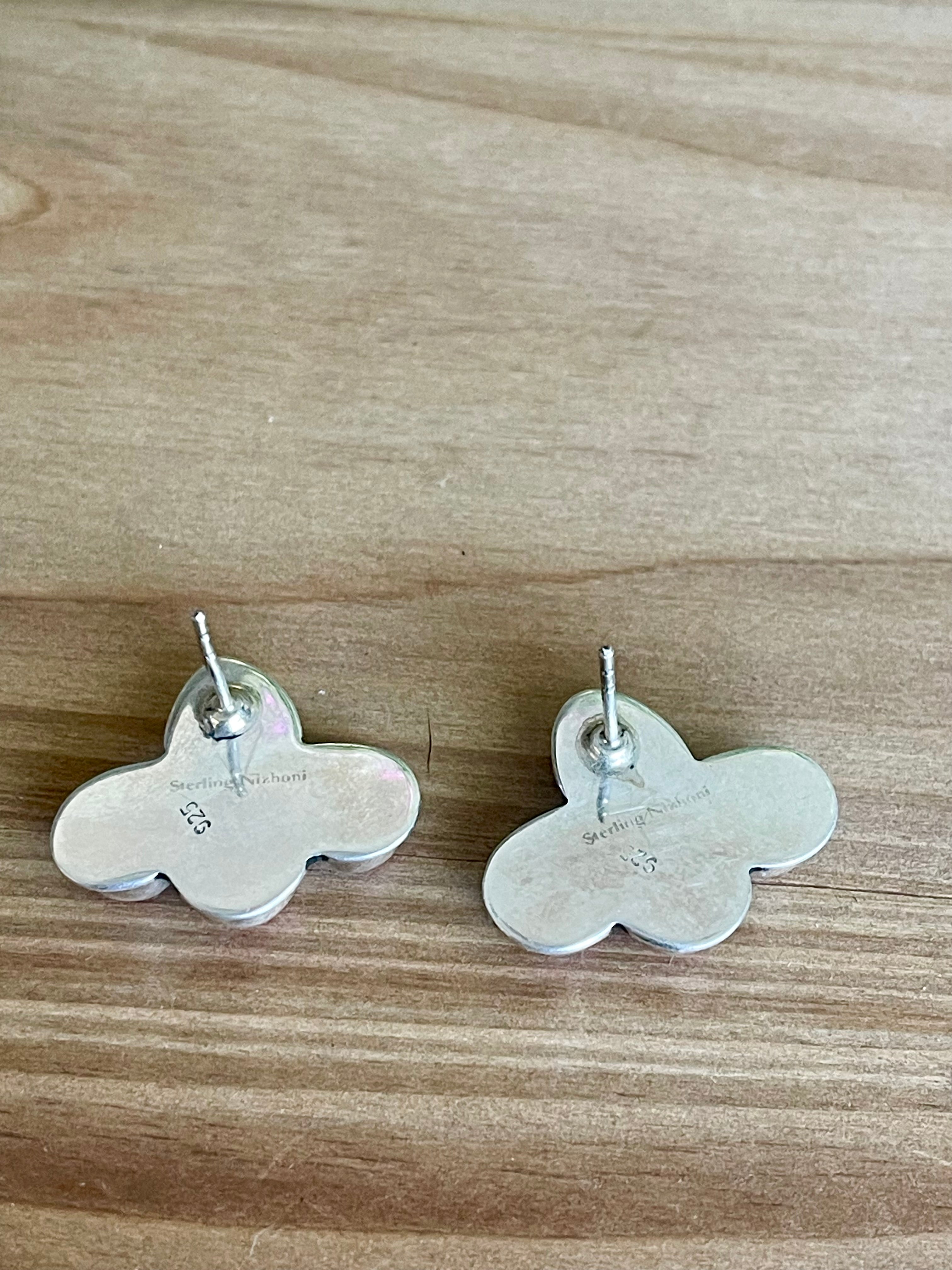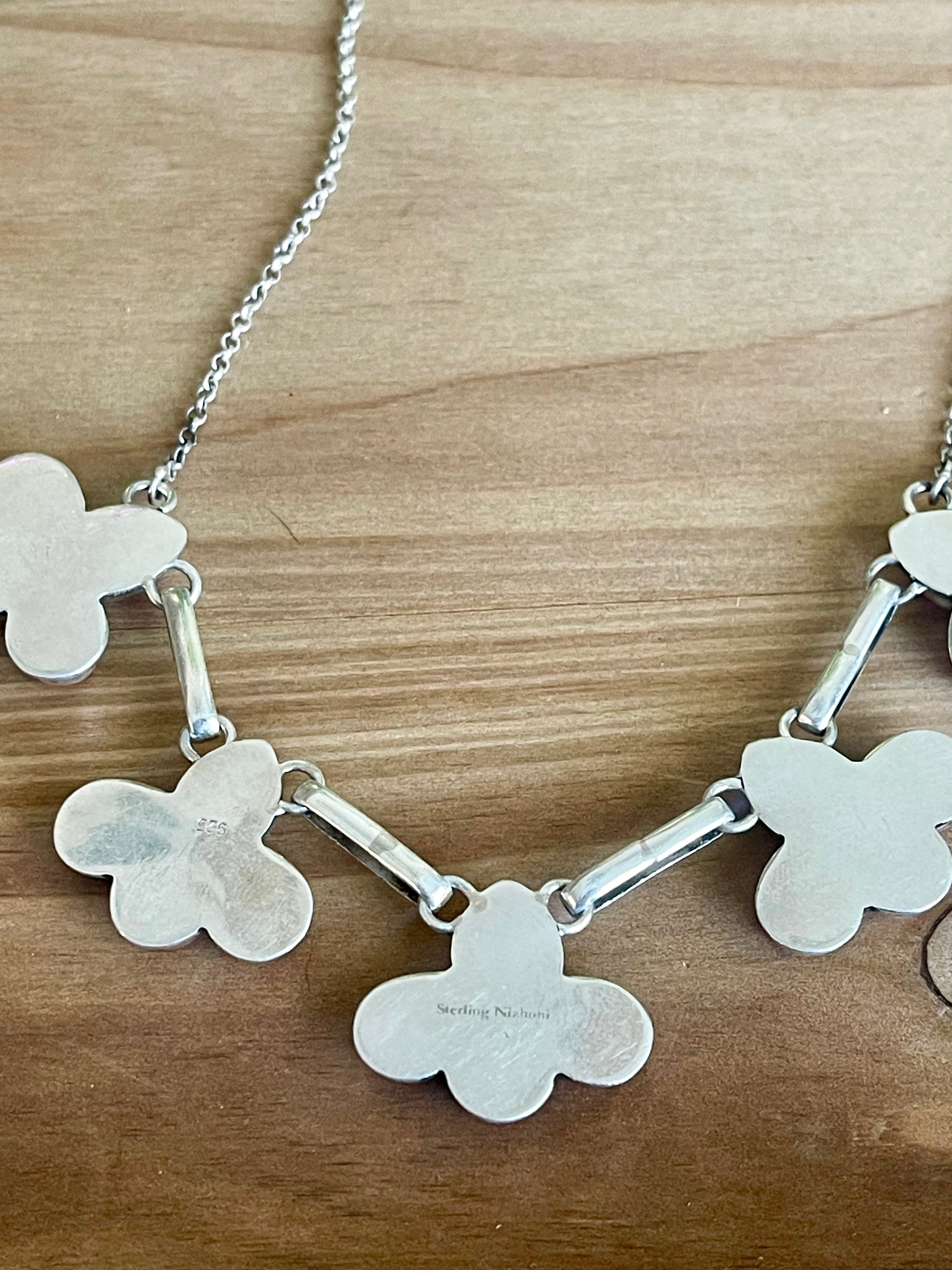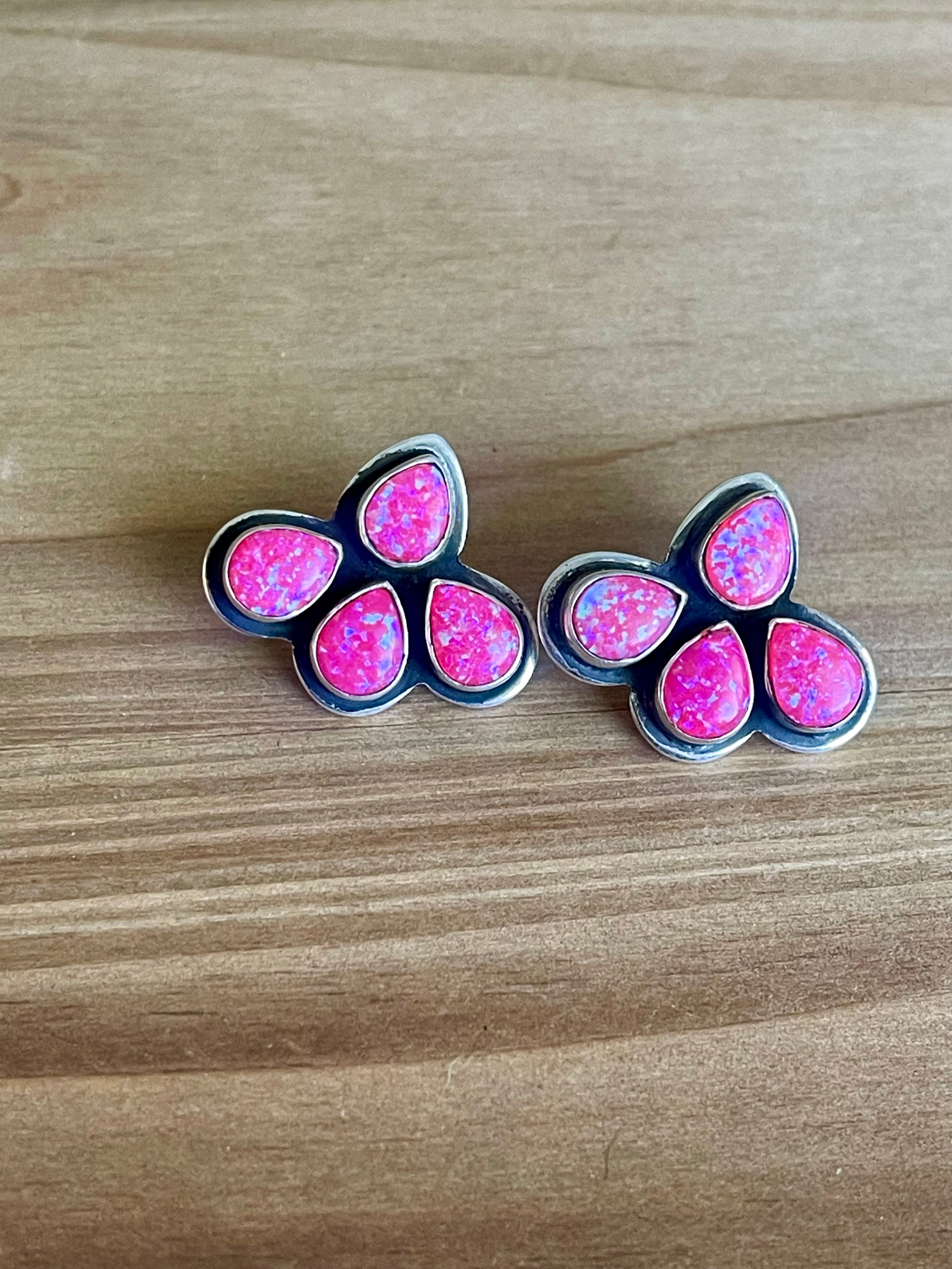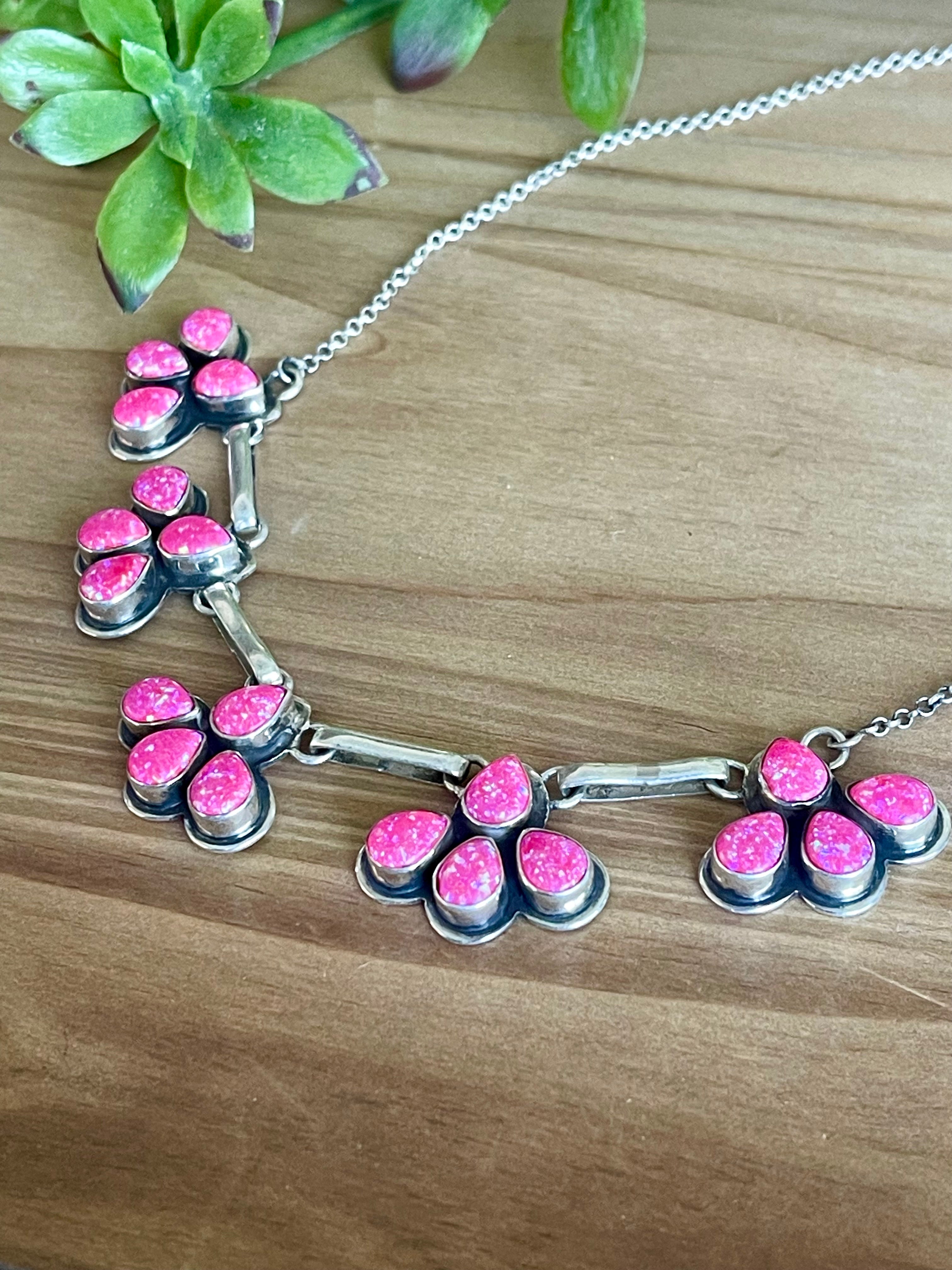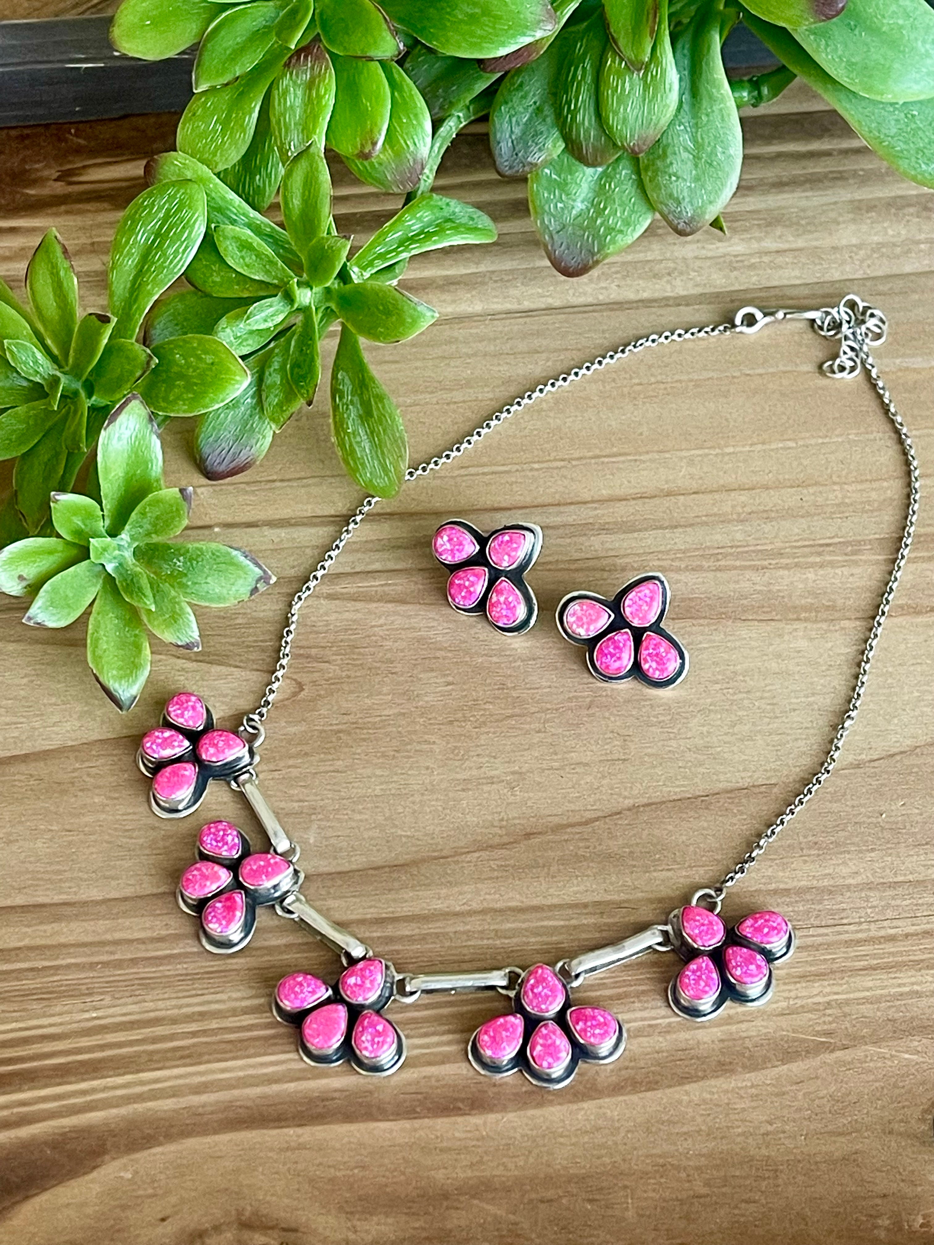 Beautiful necklace & earring set. Southwest Handmade Pink Fire Opal & Sterling Silver Necklace and Post Earrings. The necklace measures 17 3/4 inches long with hang while the chain by itself measures 16 inches long but can be adjusted down. The earrings measure just over 3/4 of an inch long and 1” wide. Signed by the artist and stamped sterling silver.