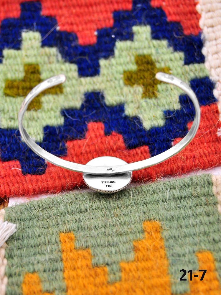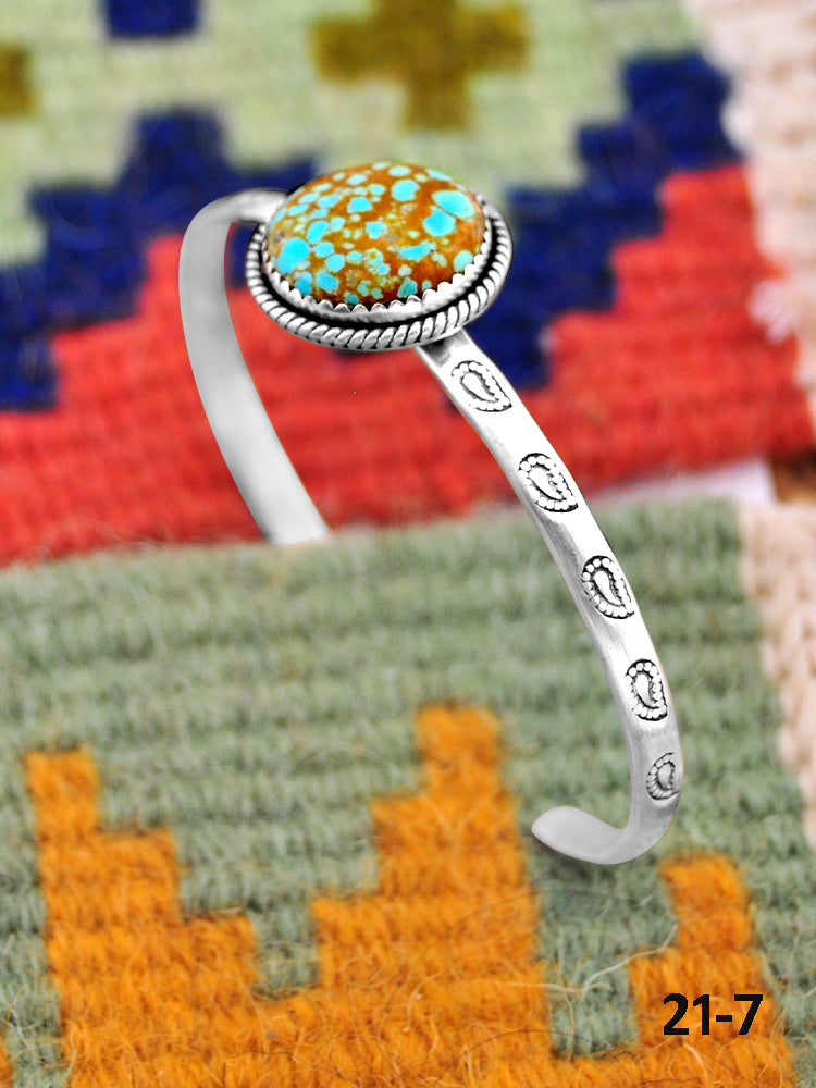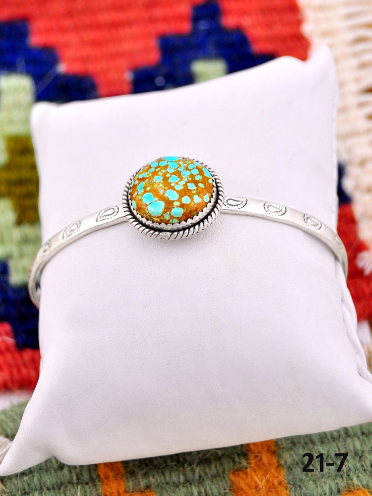 Southwest Handmade No.8 Turquoise & Sterling Silver Bangle Bracelet. It measures 3/8 of an inch wide with an inside circumference of 5 5/8 inches and a gap of 1 inch. Signed by the artist and stamped sterling silver.