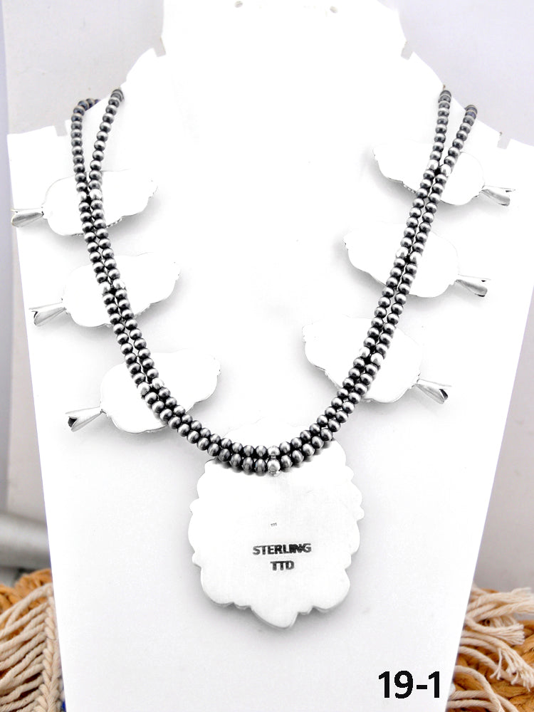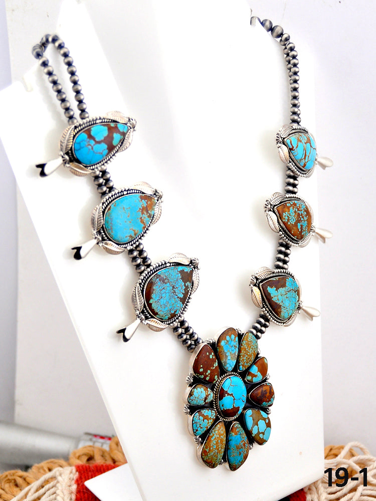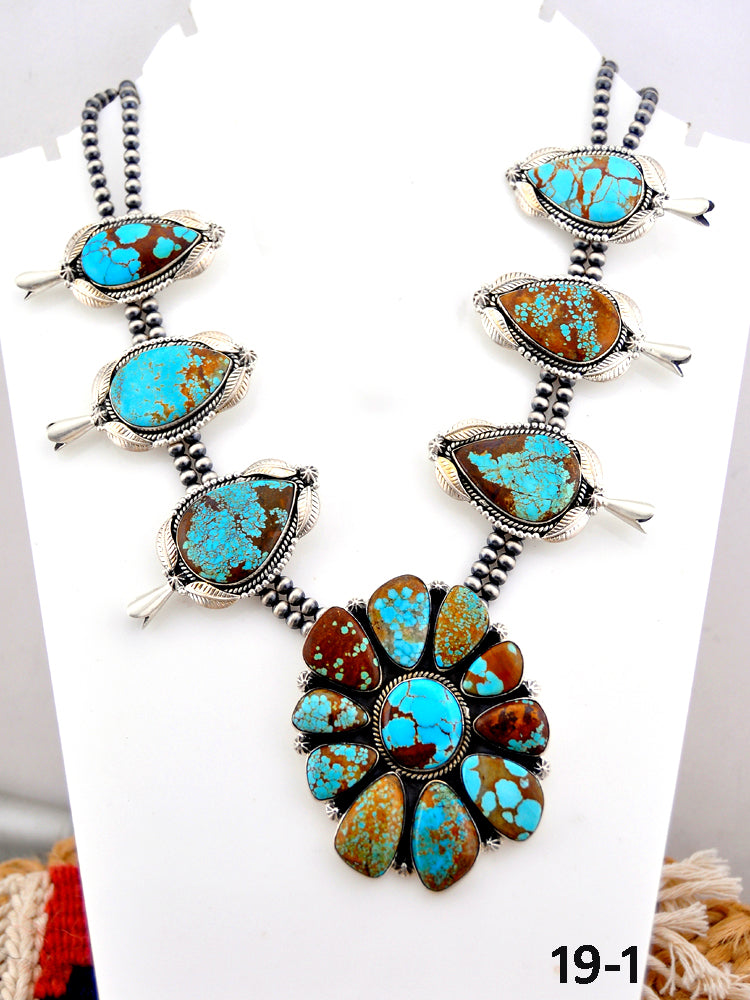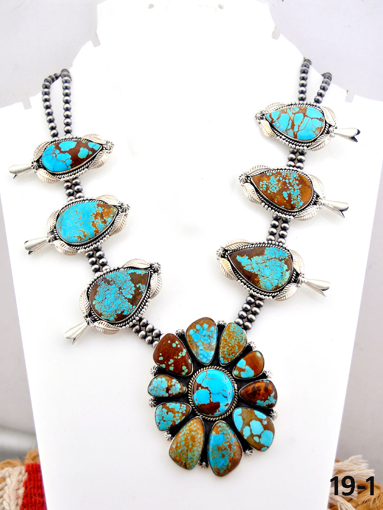 Beautiful necklace. Southwest Handmade Number 8 Turquoise Beaded Necklace. It measures 18 to 20 inches long. Main pendant is 2 1/2 by 2 inches, while complimentary ones are 2 by 1 inches. Beads measures 4mm to 6mm in size. Stones are natural and will vary. Signed by the artist and stamped sterling silver.