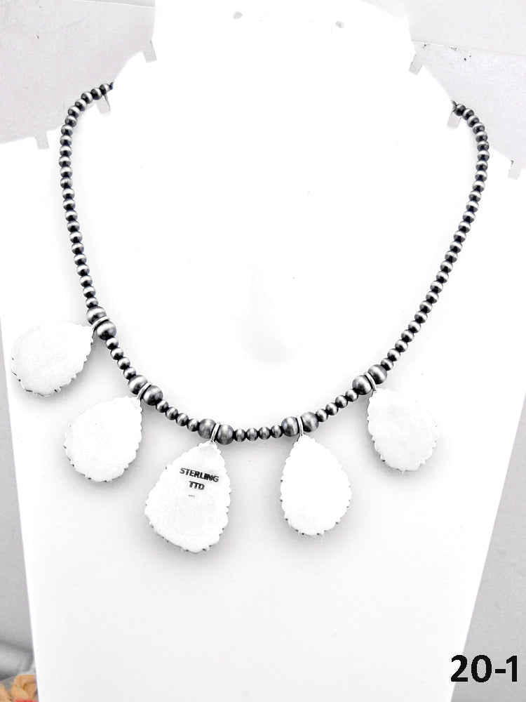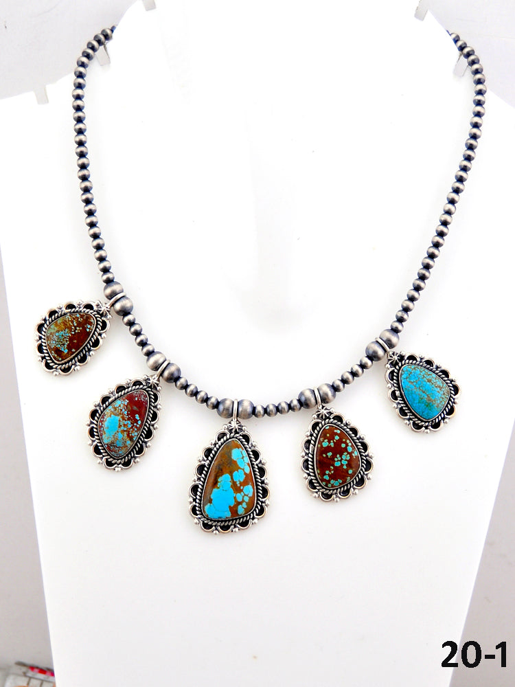 Beautiful necklace. Southwest Handmade Number 8 Turquoise Beaded Necklace. It measures 16 to 18 inches long. Pendants are 1 to 1 3/8 inches wide and the Beads measures 4mm to 6mm in size. Stones are natural and will vary. Signed by the artist and stamped sterling silver.