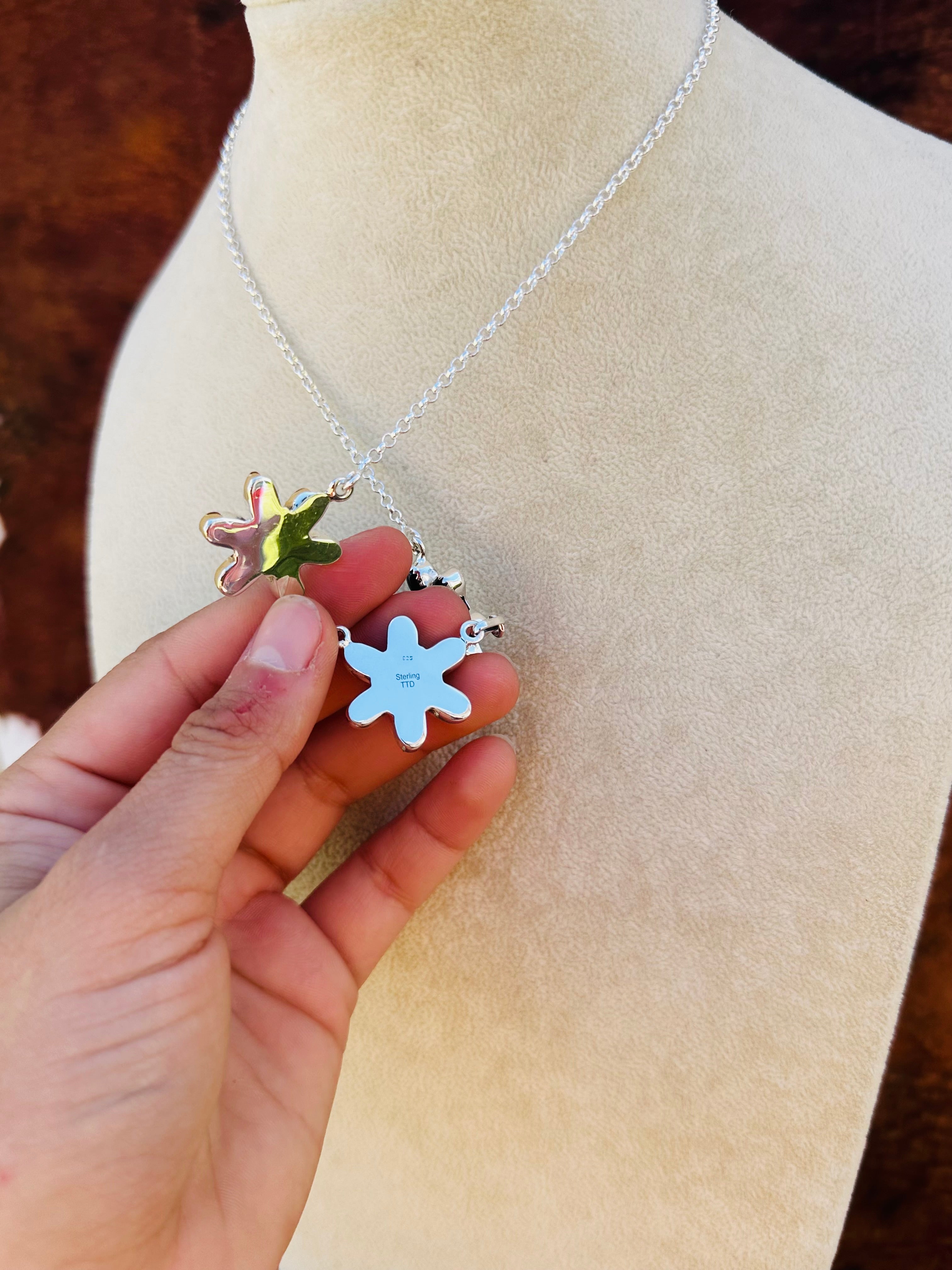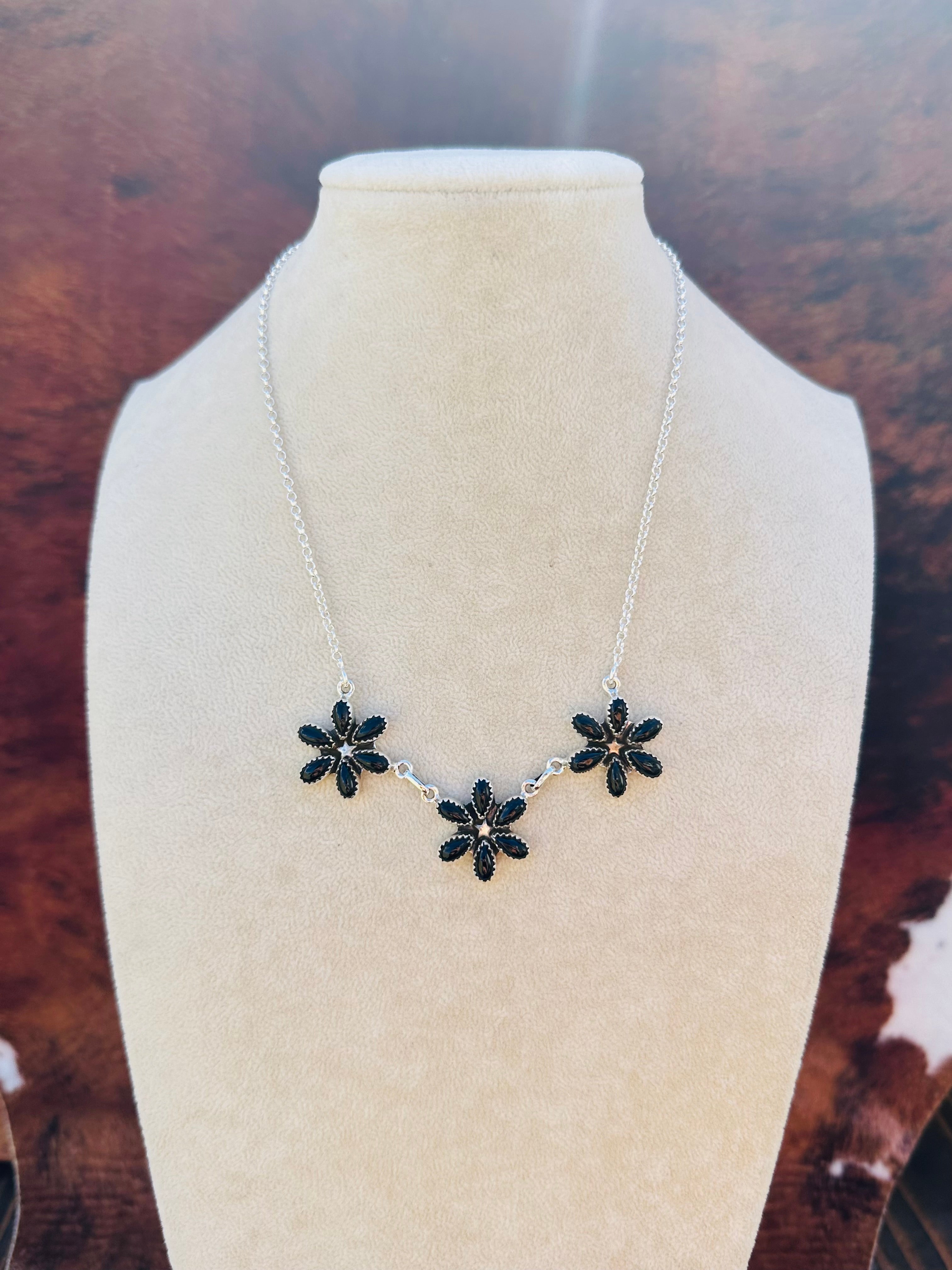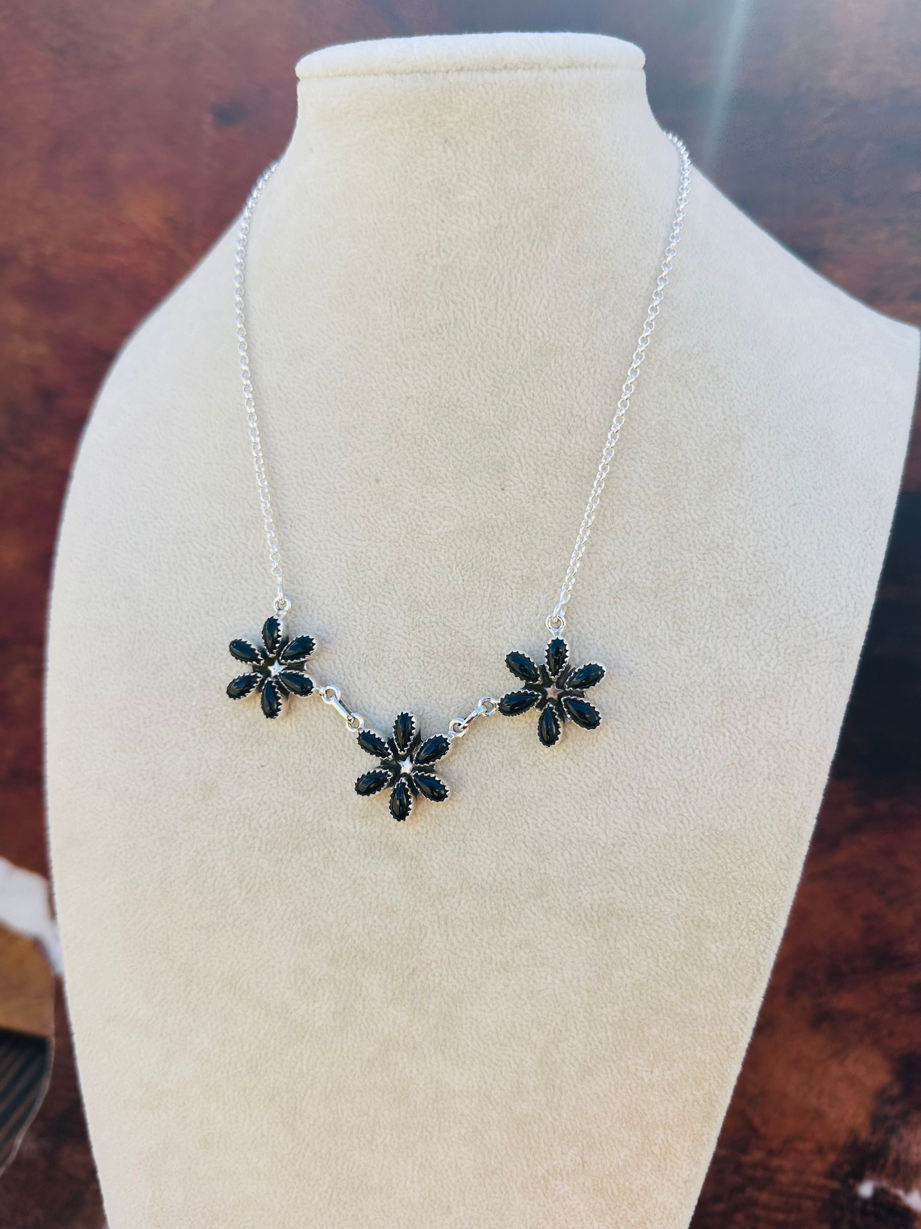 Beautiful necklace. Southwest Handmade Onyx & Sterling Silver Cluster Necklace. It measures 19 inches long with hang while the chain by itself measures 15 inches long but can be adjusted down. Signed by the artist and stamped sterling silver.