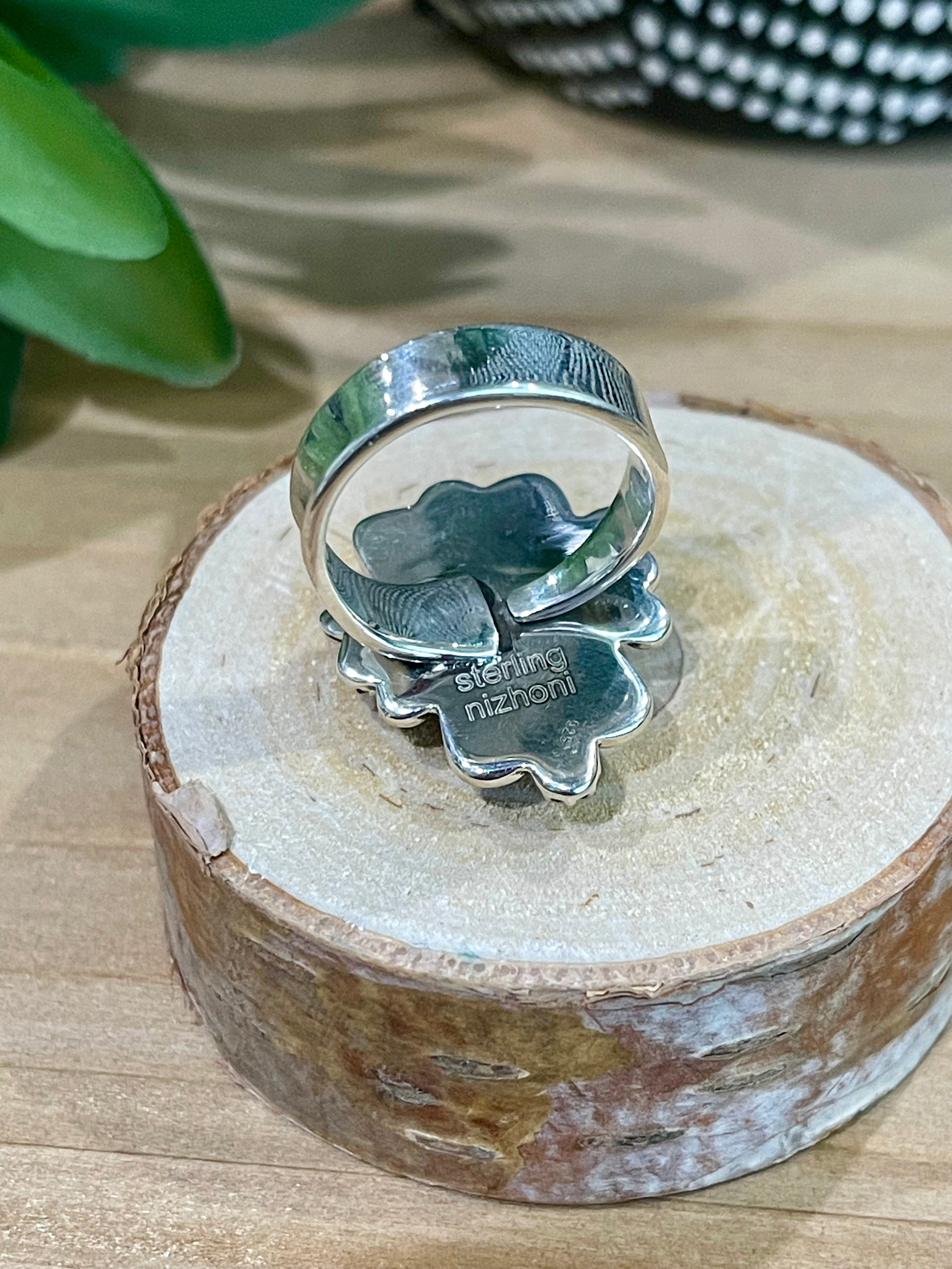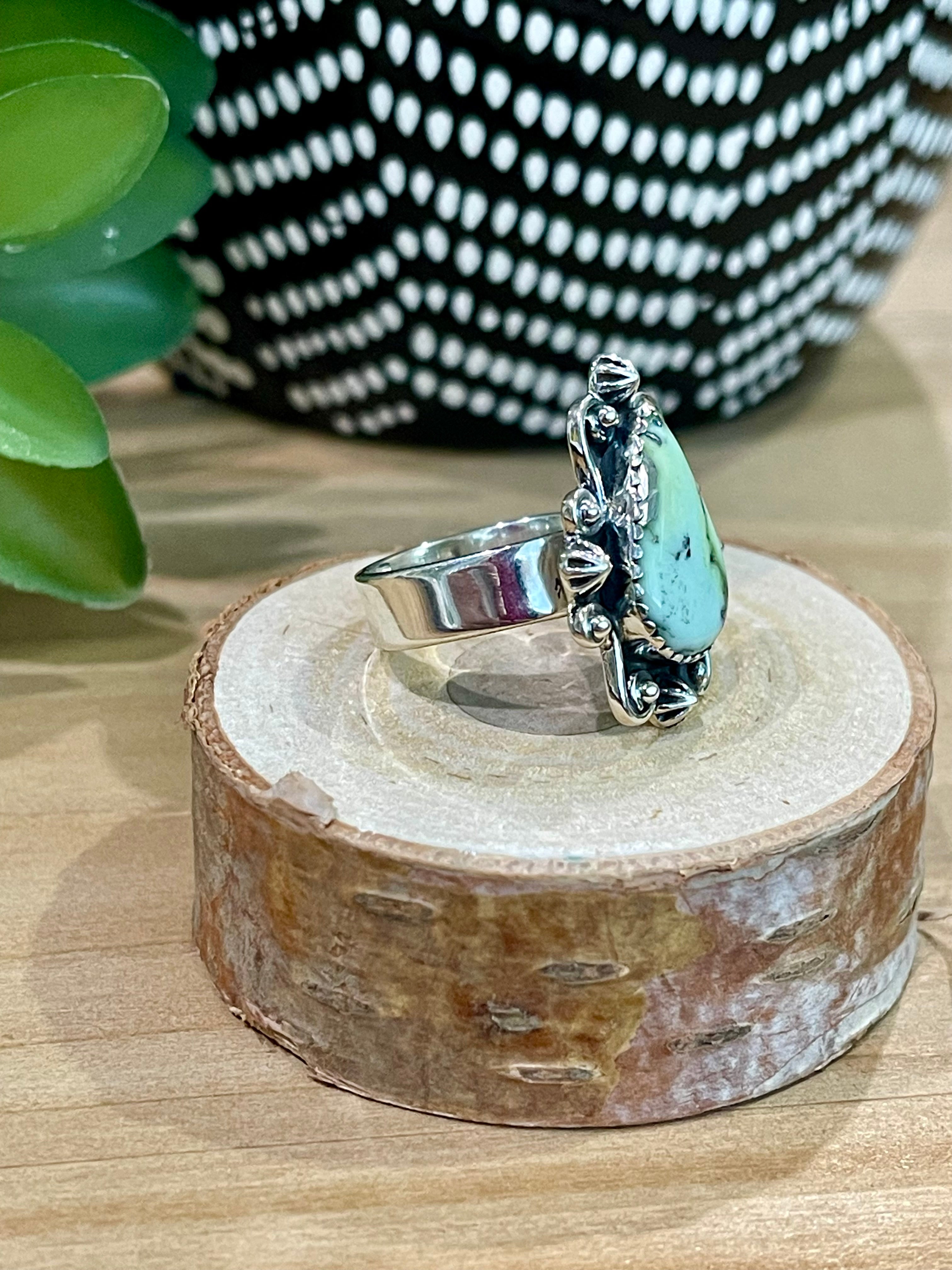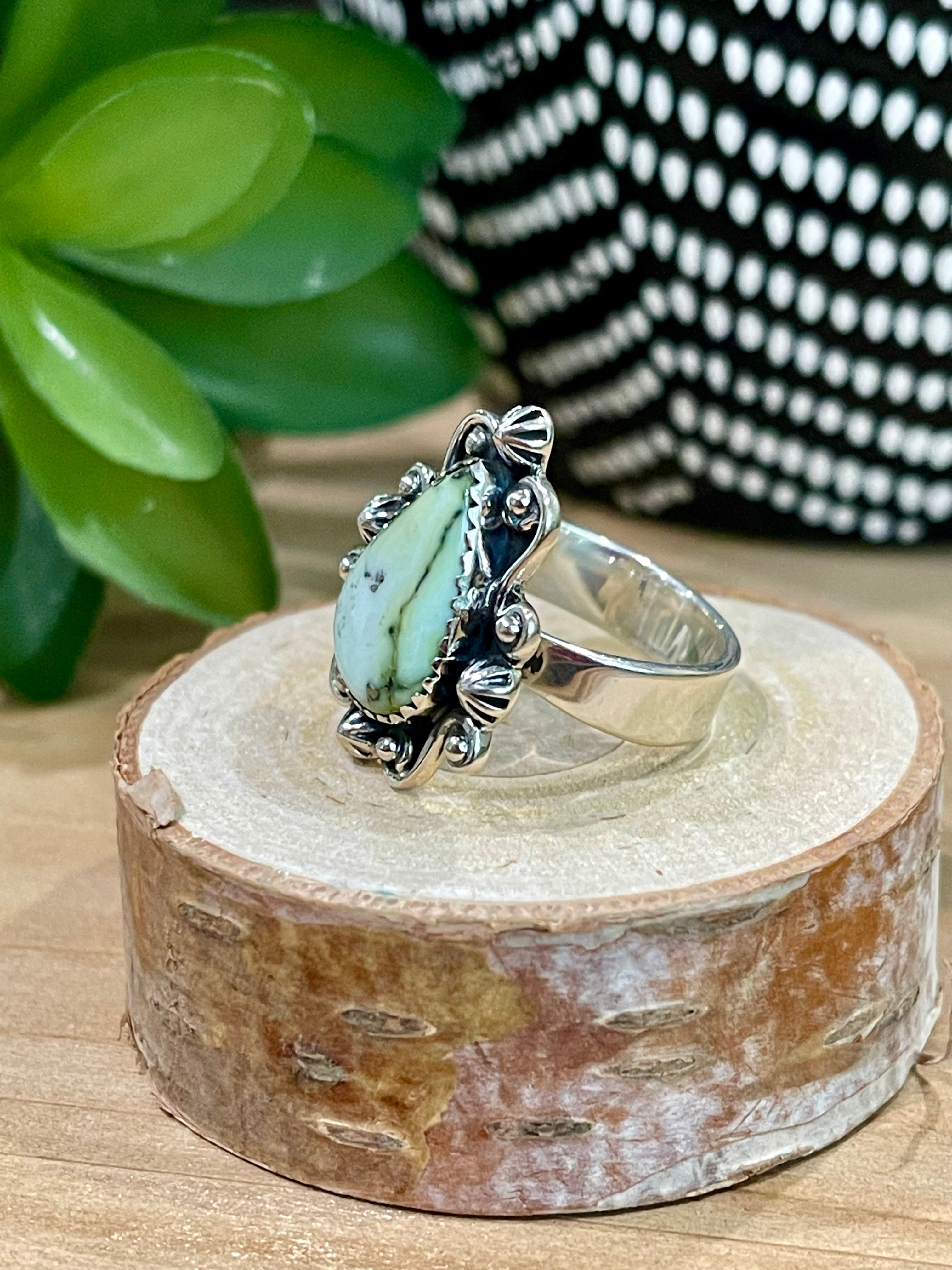 Amazing ring. Southwest Handmade Palomino Variscite & Sterling Silver Adjustable Ring. It measures 1 inch long and just under 7/8 of an inch wide. Signed by the artist and stamped sterling silver.