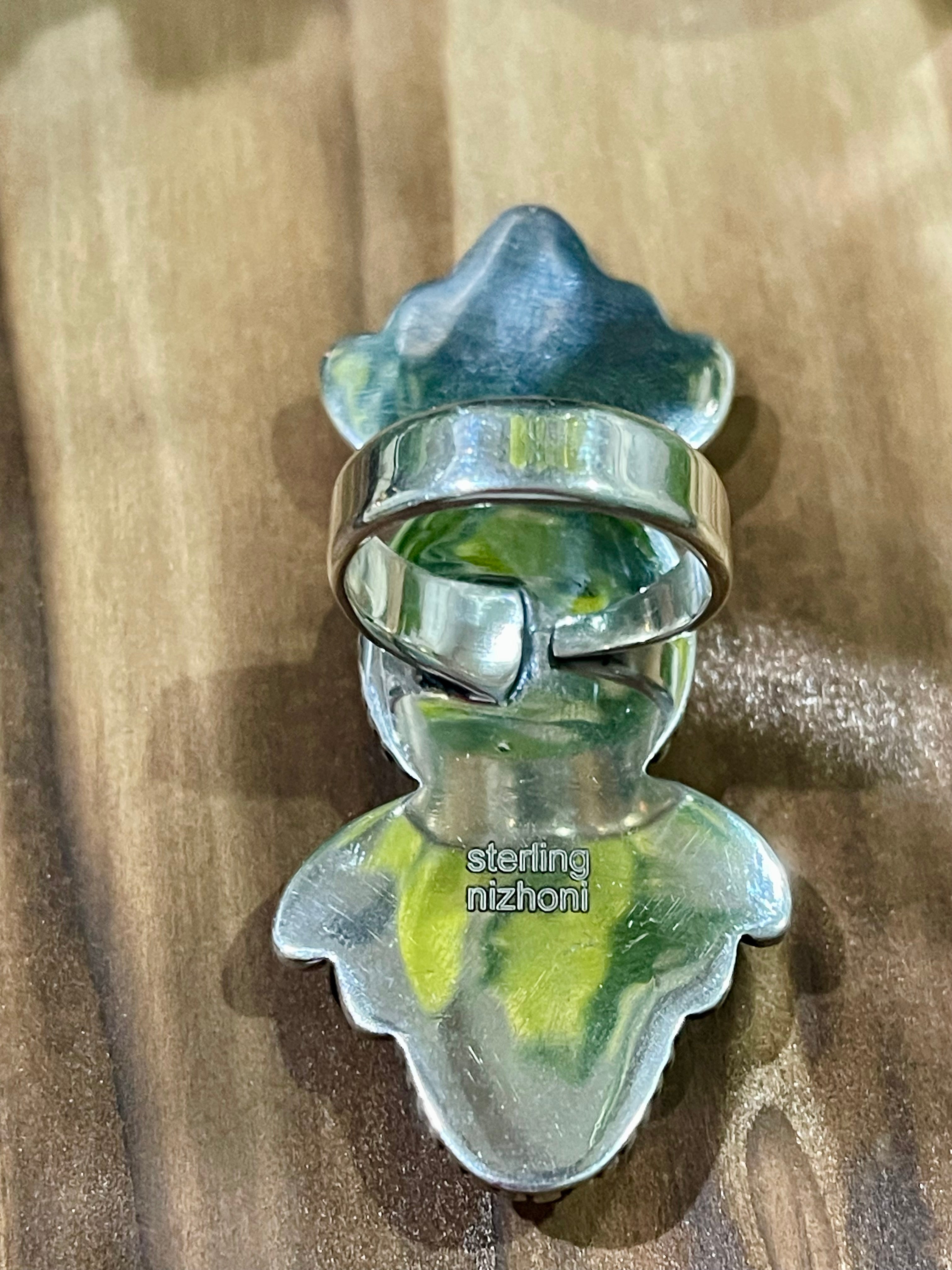 Amazing cluster ring. Southwest Handmade Palomino Variscite & Sterling Silver Adjustable 3 Stone Ring. It measures 2 1/3 inches long and 1 1/8 inches wide. Signed by the artist and stamped sterling silver.