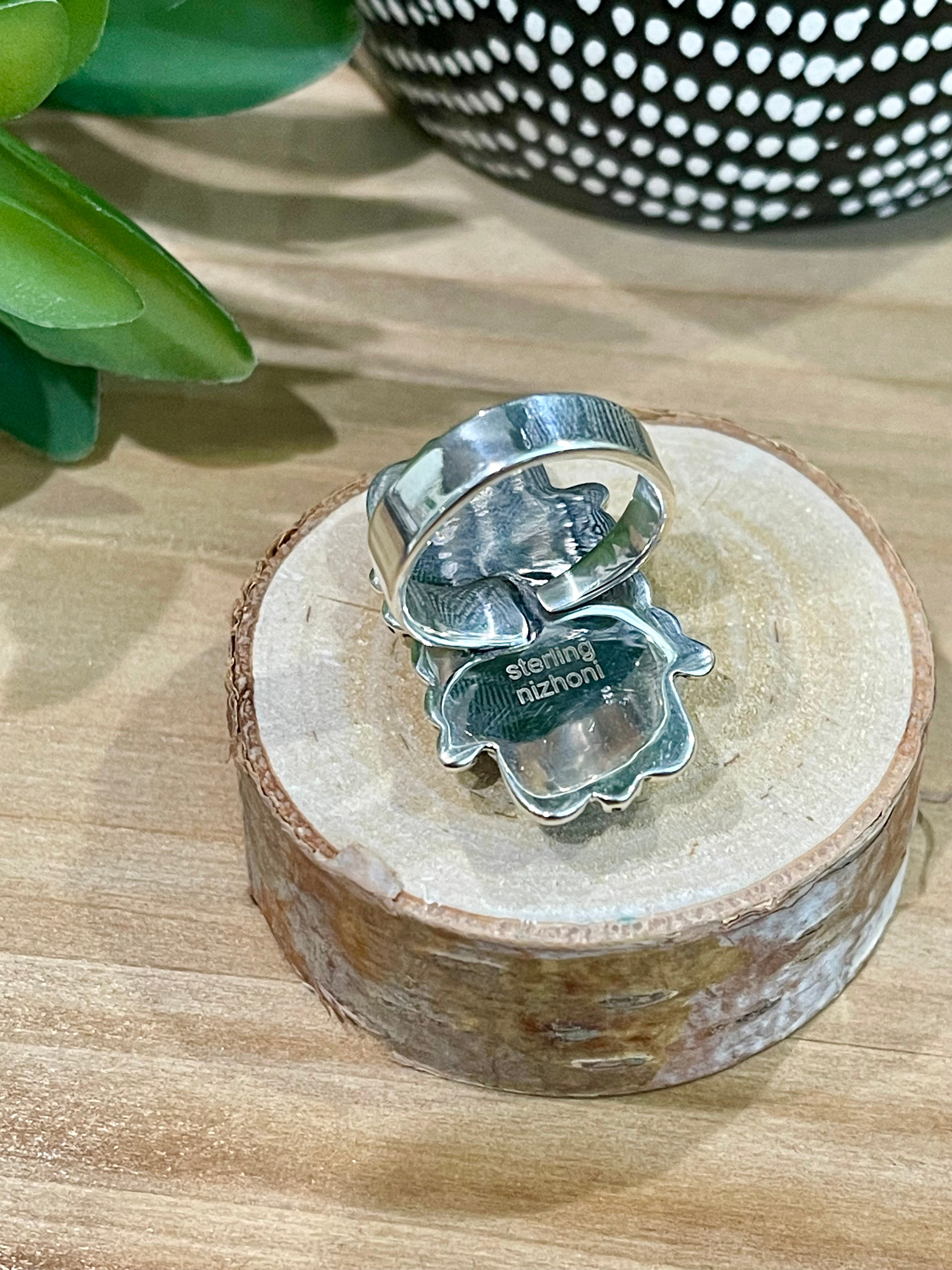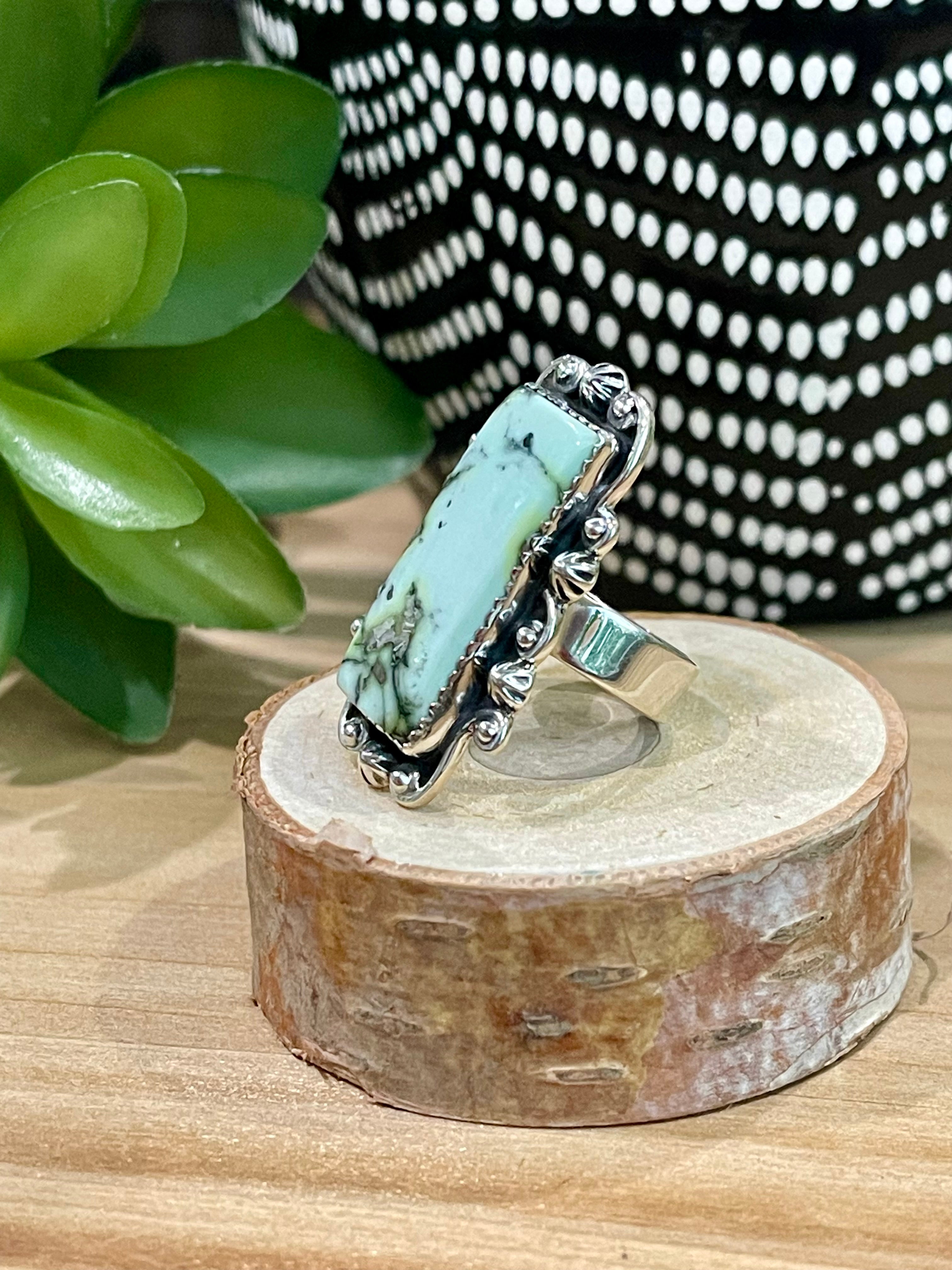 Amazing ring. Southwest Handmade Palomino Variscite & Sterling Silver Adjustable Ring. It measures 1 1/2 inches long and just under 7/8 of an inch wide. Signed by the artist and stamped sterling silver.