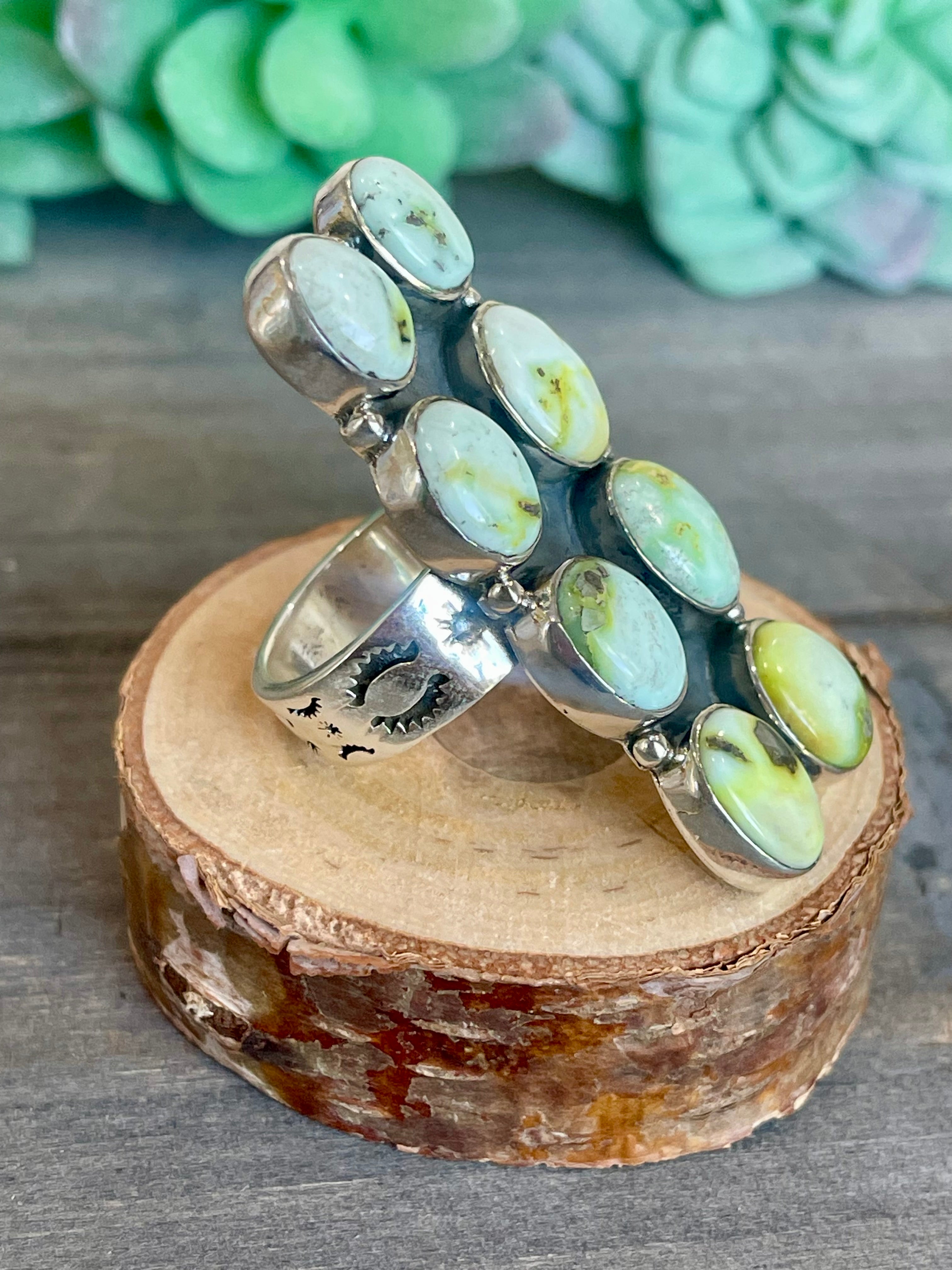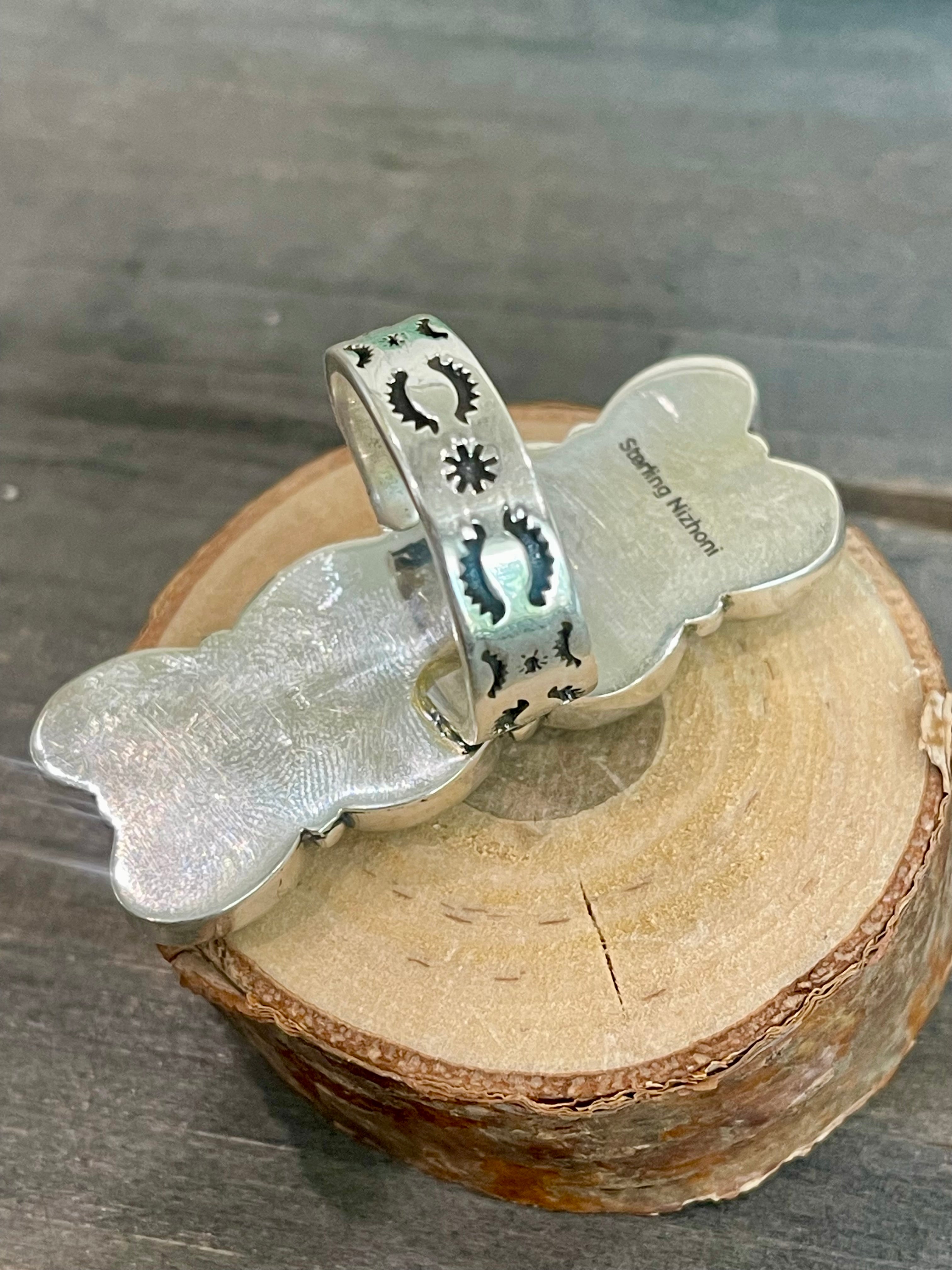 Amazing ring. Southwest Handmade Palomino Variscite & Sterling Silver Adjustable Ring. It measures 2 inches long and just over 3/4 of an inch wide. Signed by the artist and stamped sterling silver.
