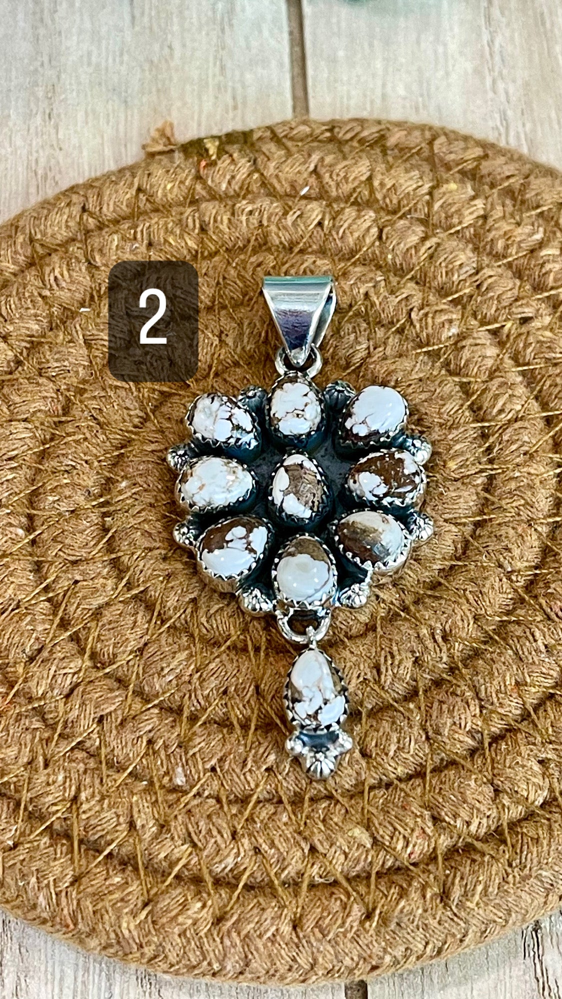 Beautiful craftsmanship. Southwest Handmade Wild Horse & Sterling Silver Cluster Pendant. It measures 2 1/2 inches long and 1 1/8 inches wide. Pendant Only. Signed by the artist and stamped sterling silver.