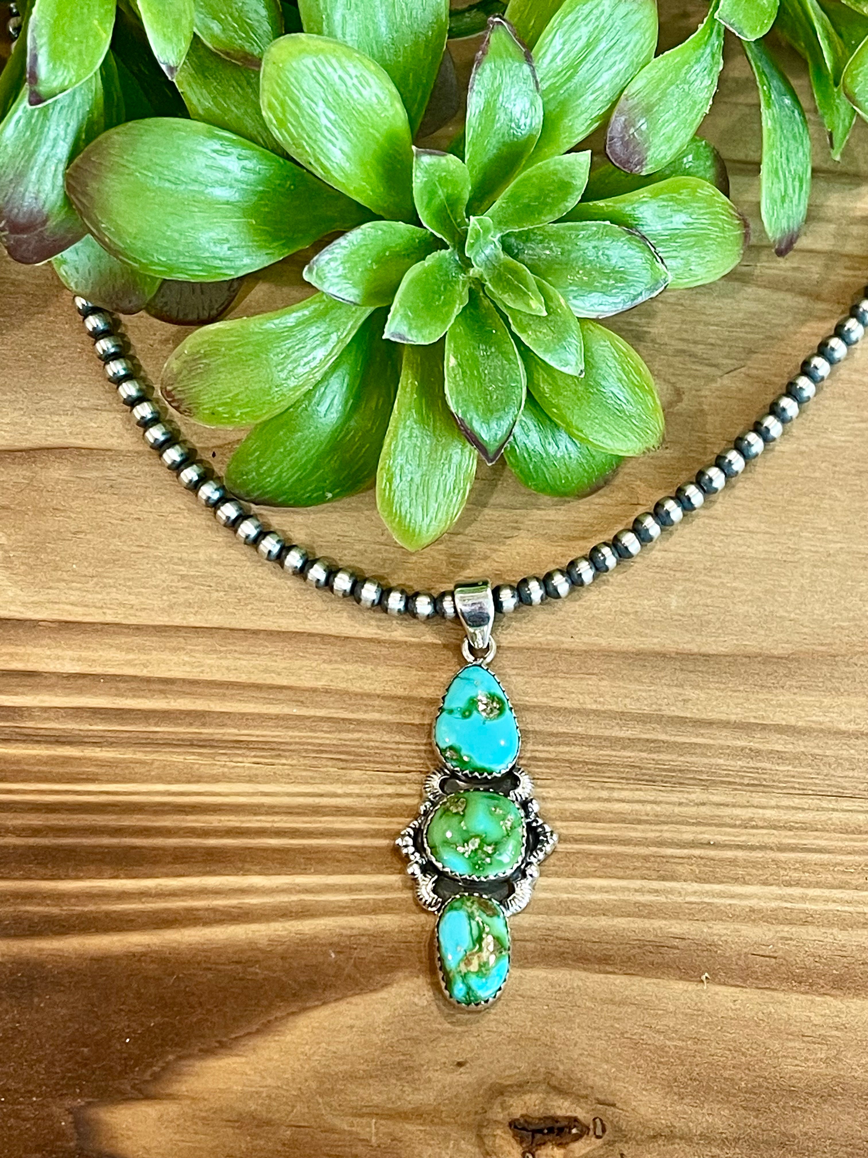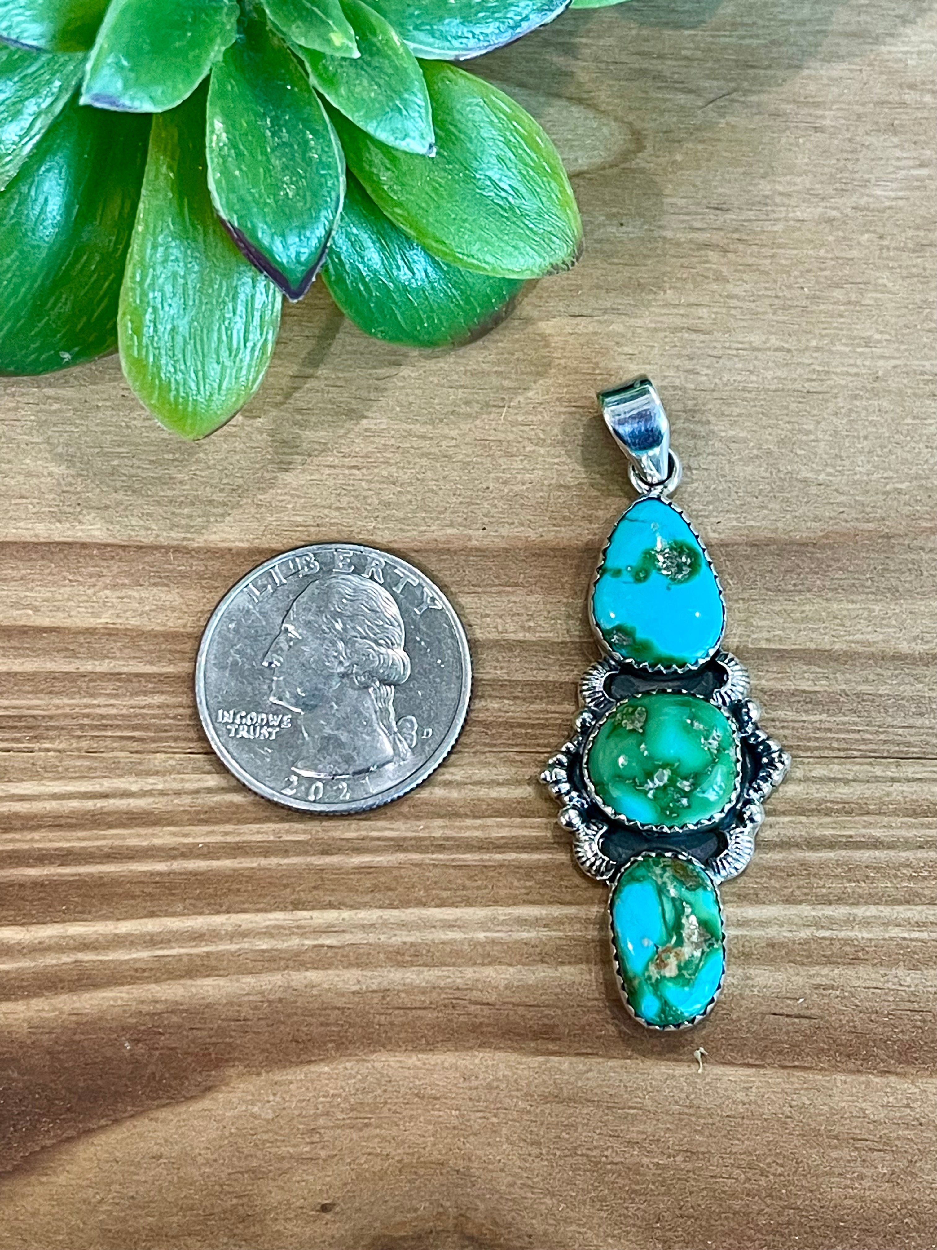 Beautiful craftsmanship. Southwest Handmade Sonoran Mountain Turquoise & Sterling Silver Cluster Pendant. It measures 2 1/8 inches long and 7/8 of an inch wide. Pendant Only. Signed by the artist and stamped sterling silver.