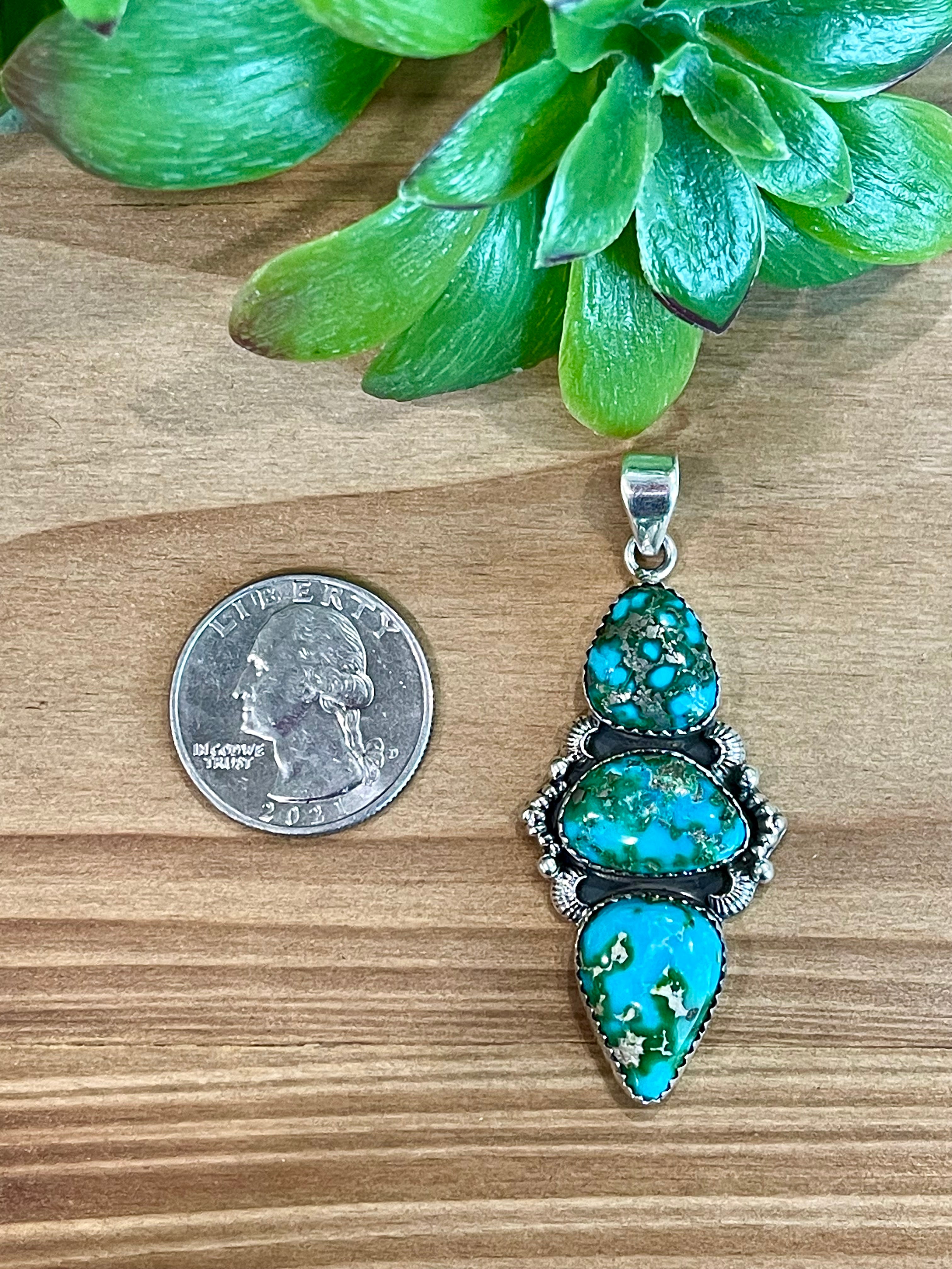 Beautiful craftsmanship. Southwest Handmade Sonoran Mountain Turquoise & Sterling Silver Cluster Pendant. It measures 2 1/4 inches long and 1 inch wide. Pendant Only. Signed by the artist and stamped sterling silver.