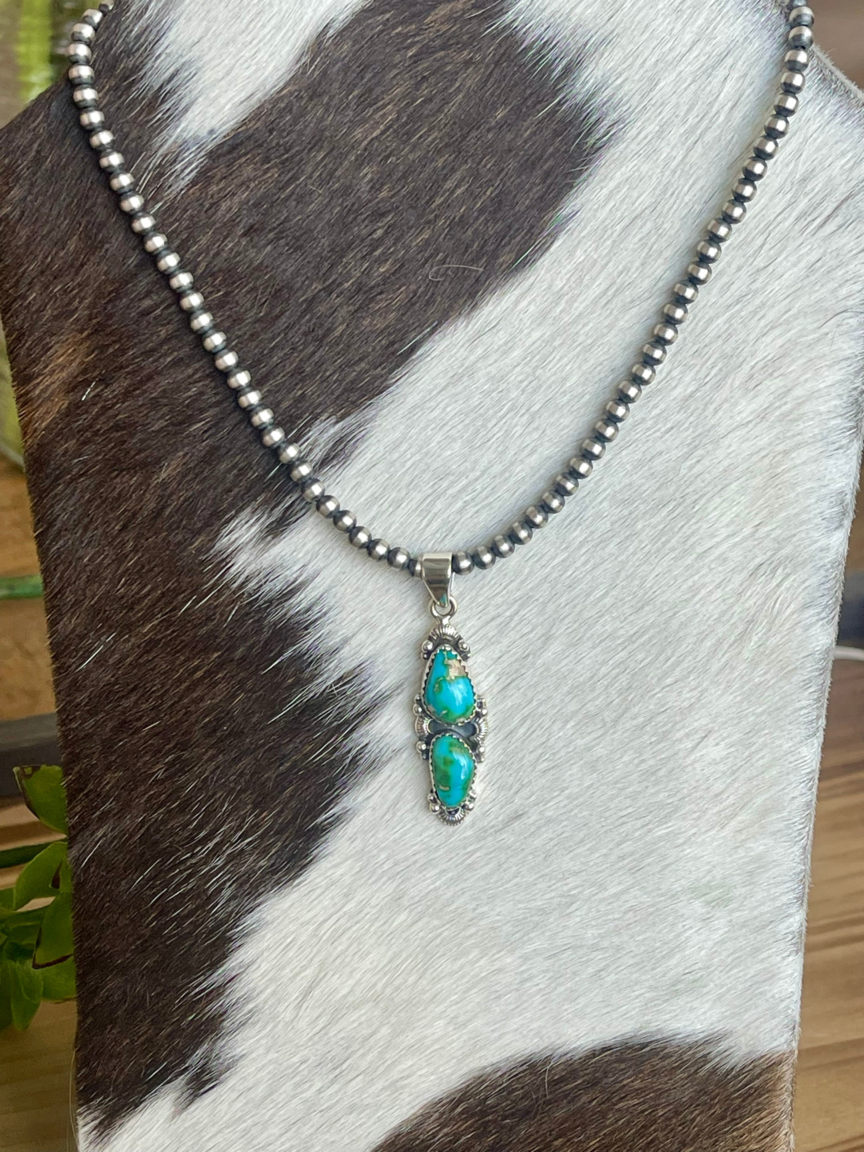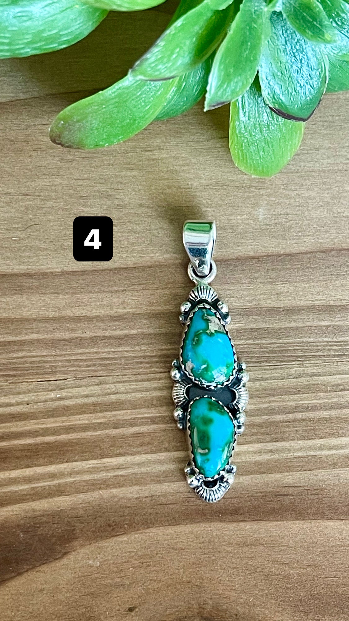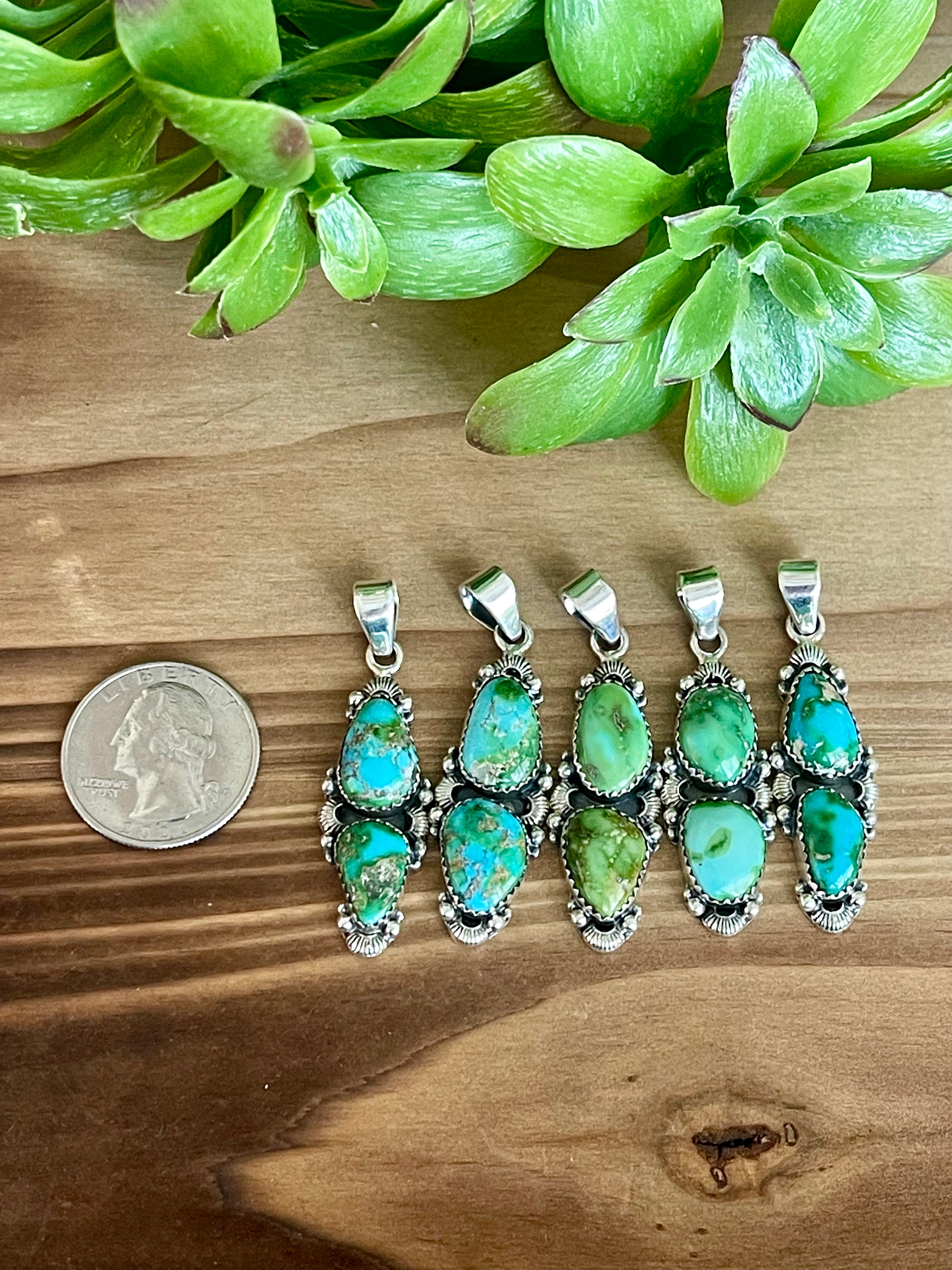 Beautiful craftsmanship. Southwest Handmade Sonoran Mountain Turquoise & Sterling Silver Cluster Pendant. It measures 1 3/4 inches long and 1/2 of an inch wide. Pendant Only. Signed by the artist and stamped sterling silver.