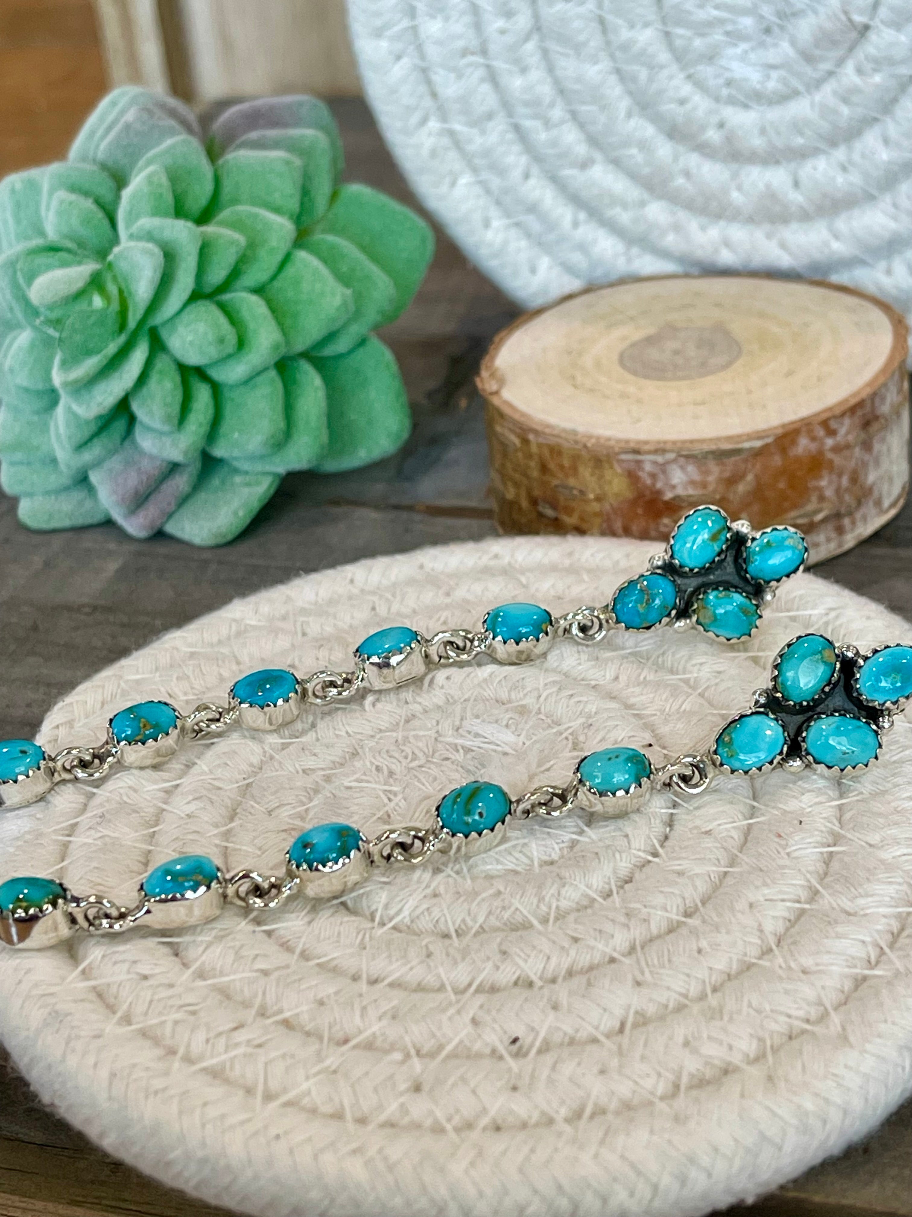 Breathtaking earrings. Southwest Handmade Sonoran Mountain Turquoise & Sterling Silver Post Dangle Earrings. It measures 3 1/2 inches long and 1/2 of an inch wide. Signed by the artist and stamped sterling silver.