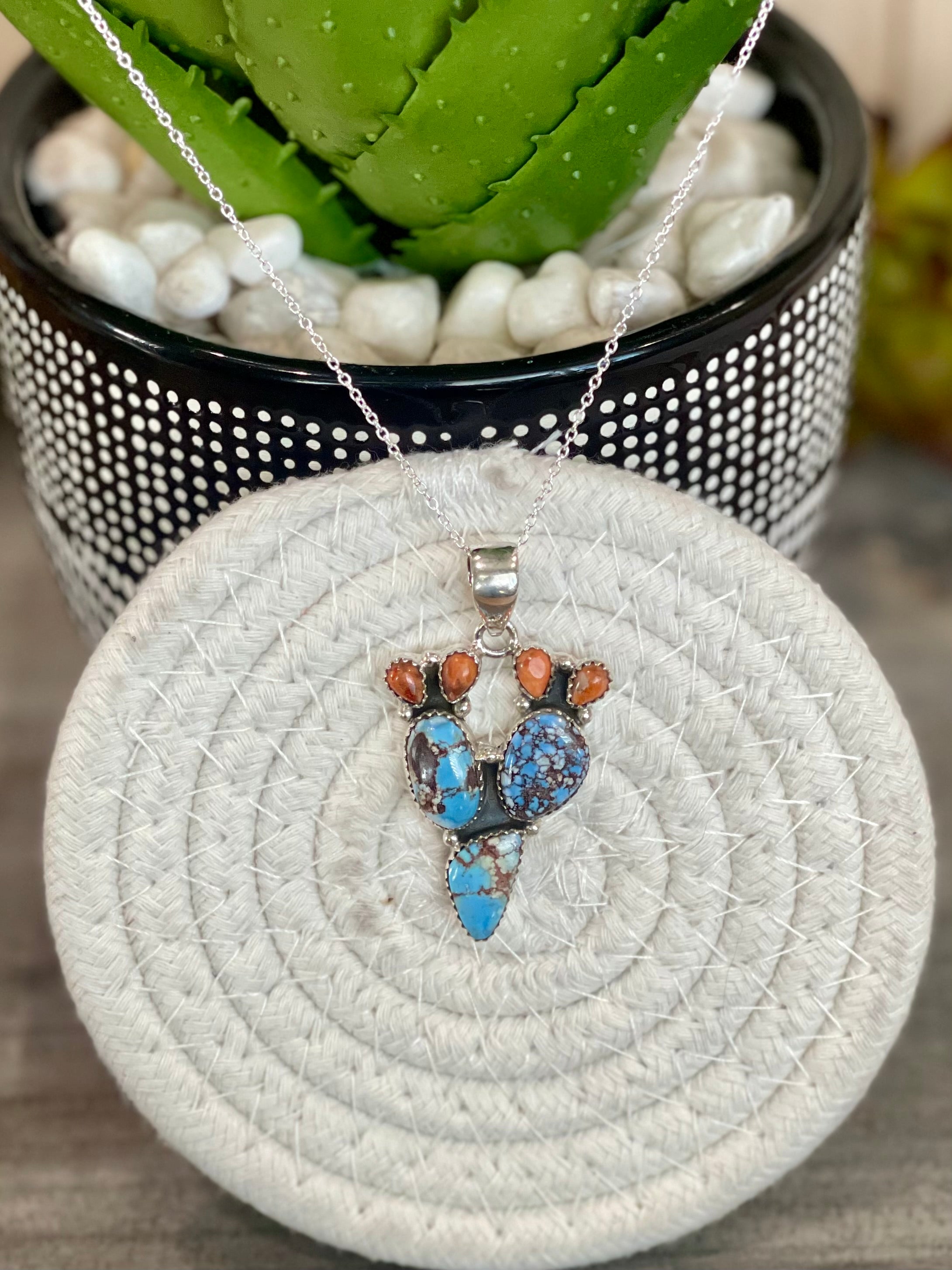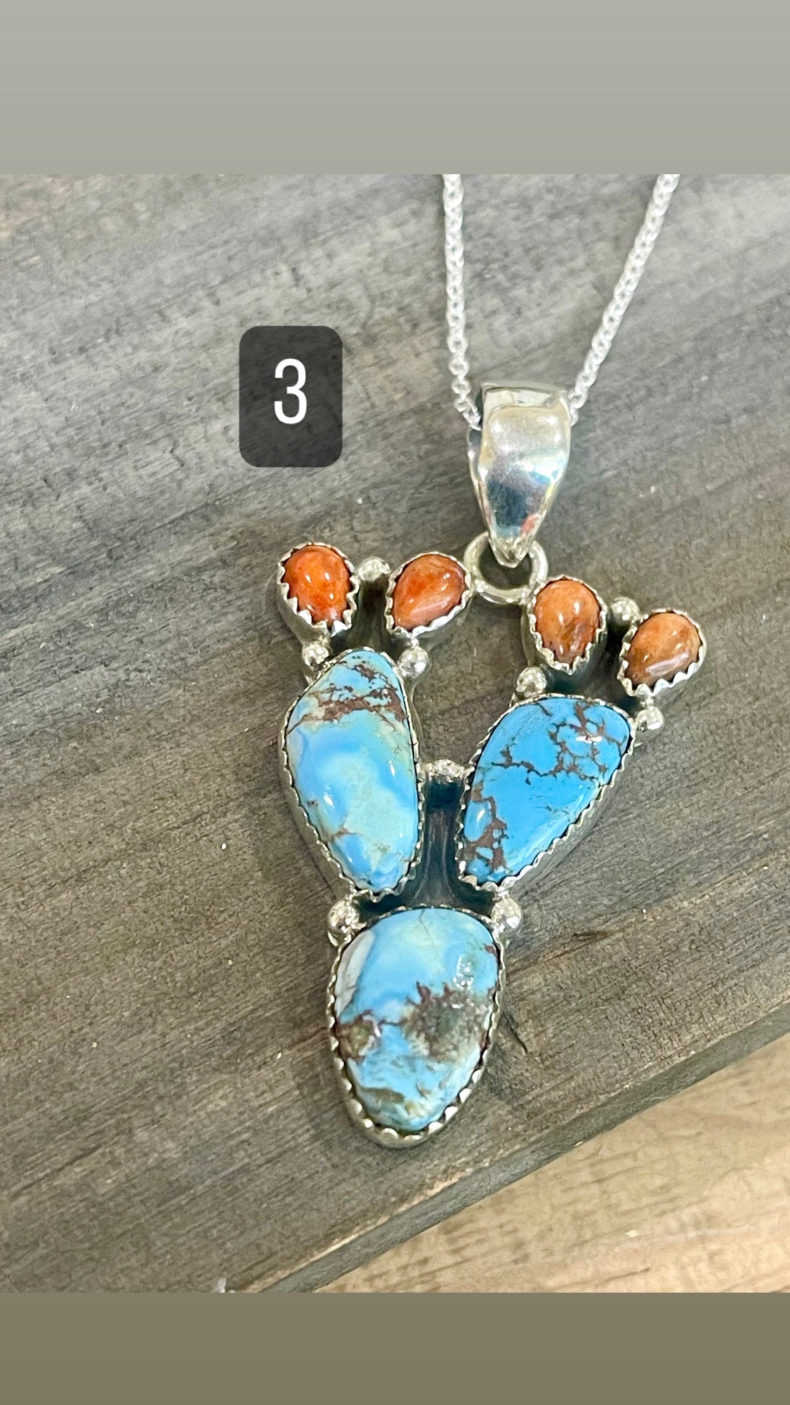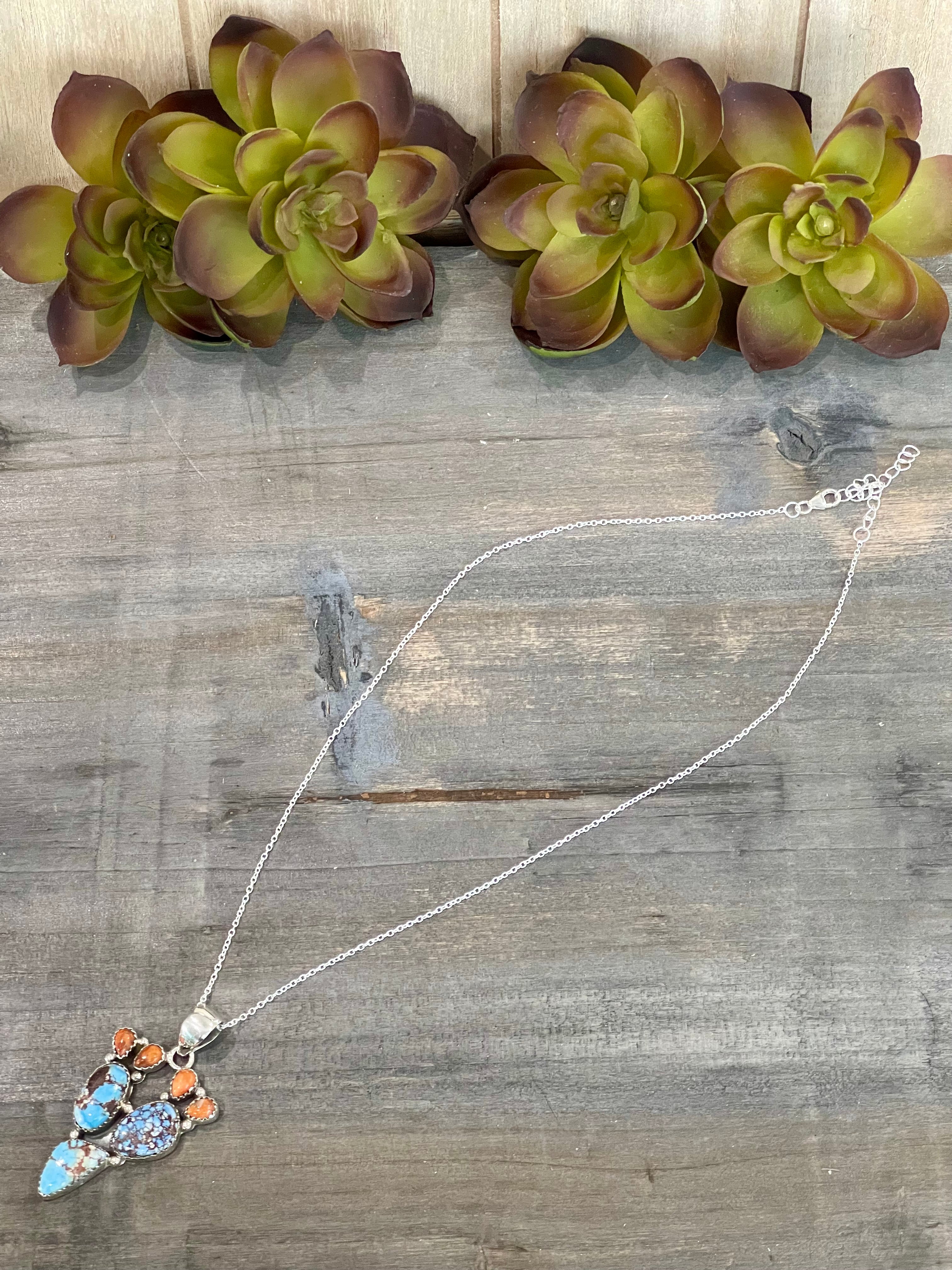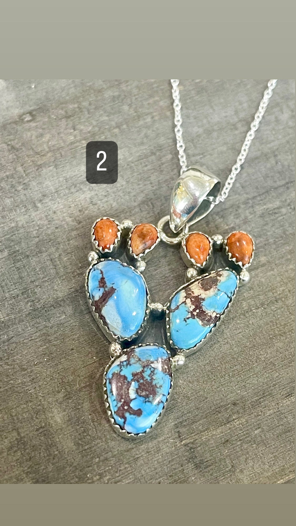 Beautiful necklace. Southwest Handmade Golden Hills & Sterling Silver Prickly Pear Necklace. It measures 19 1/4 inches long with hang while the chain by itself measures 18 inches long but can be adjusted down. Signed by the artist and stamped sterling silver.