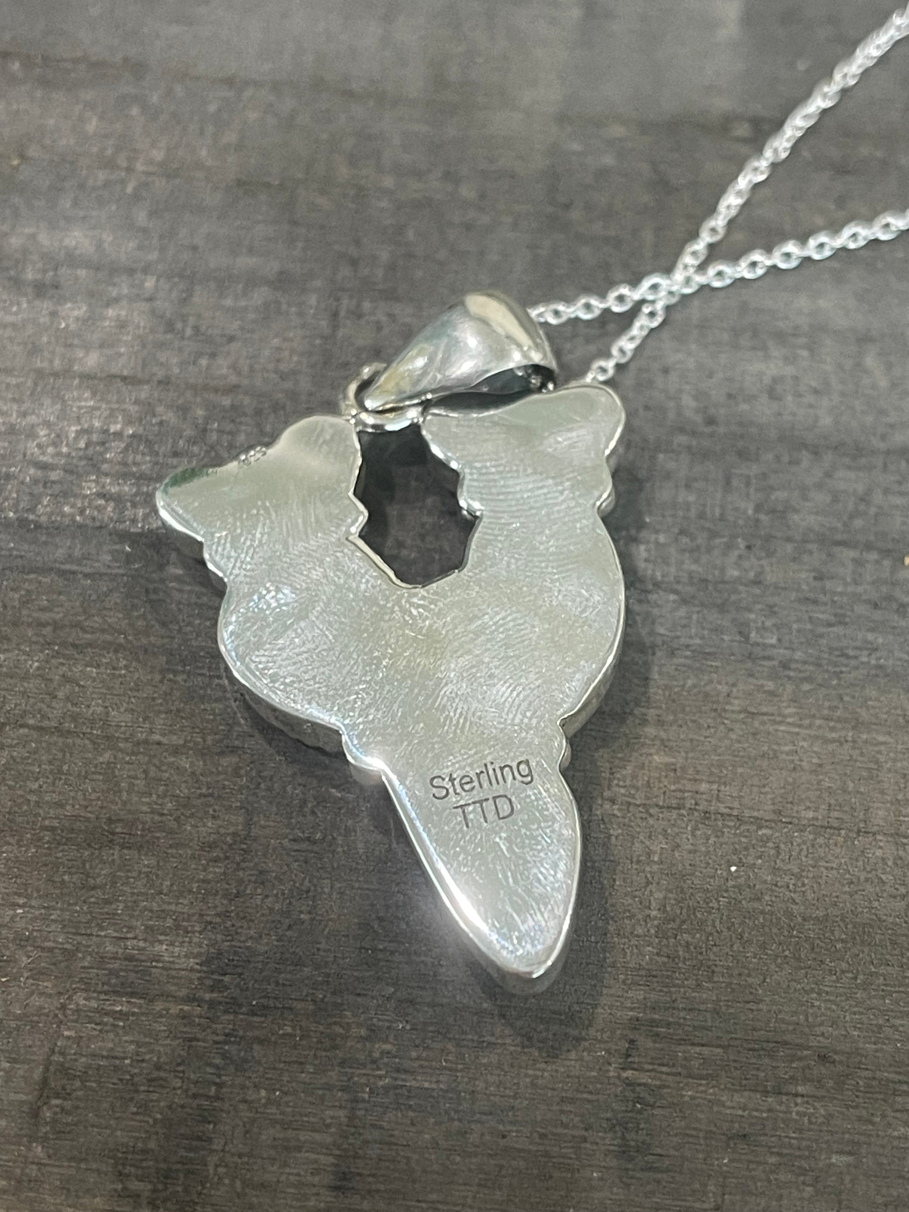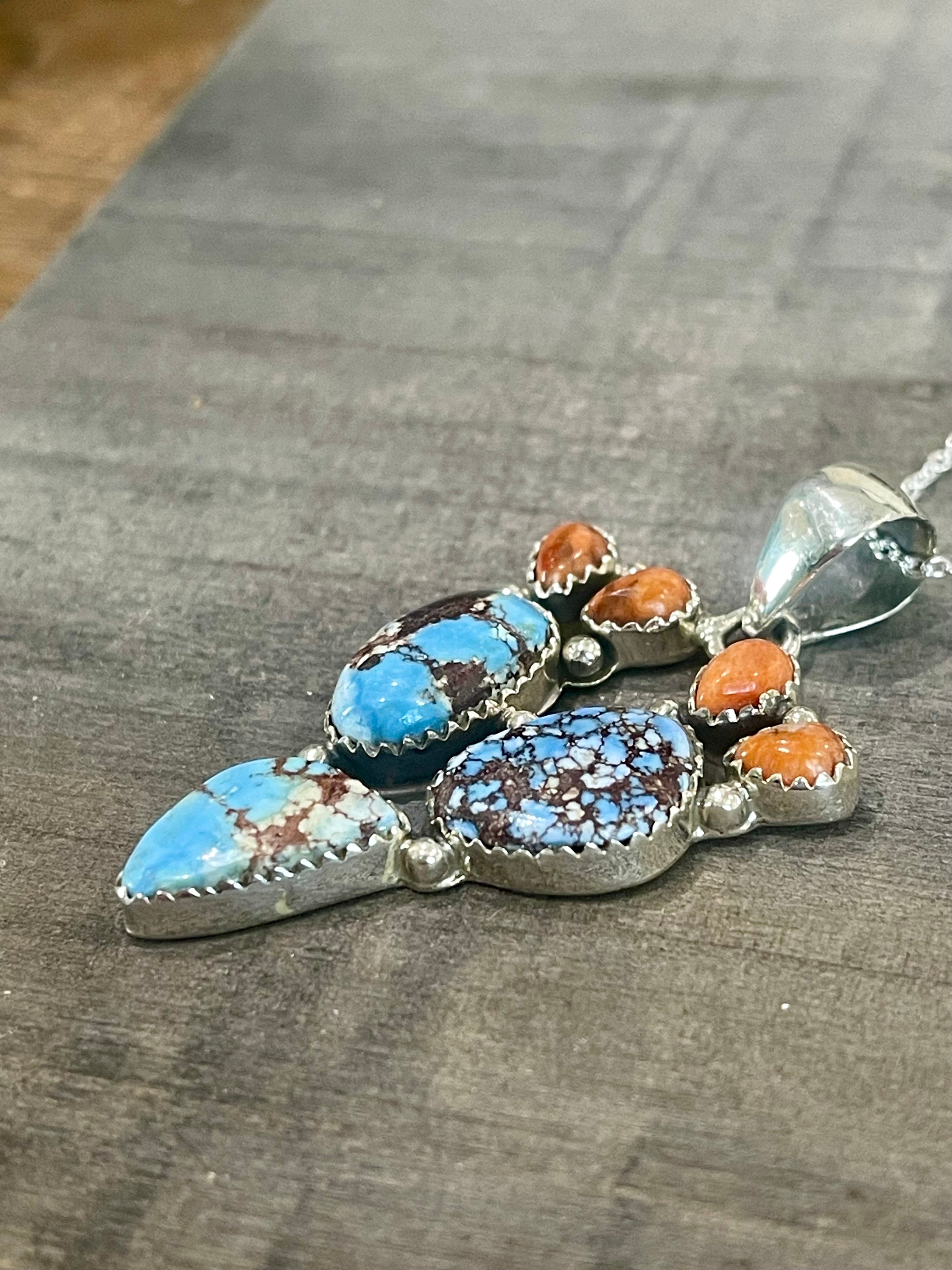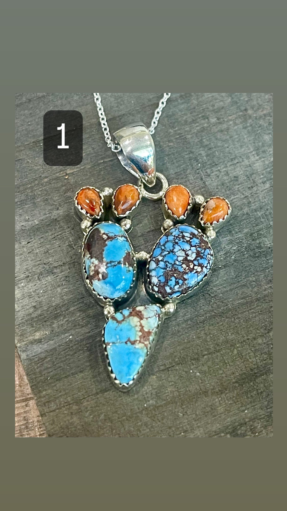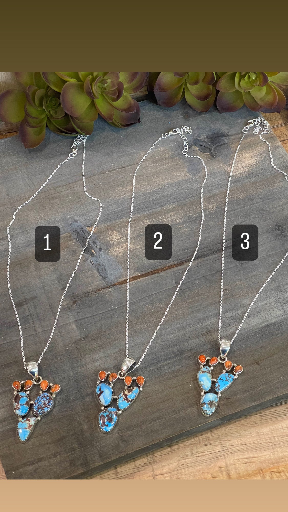 Beautiful necklace. Southwest Handmade Golden Hills & Sterling Silver Prickly Pear Necklace. It measures 19 1/4 inches long with hang while the chain by itself measures 18 inches long but can be adjusted down. Signed by the artist and stamped sterling silver.