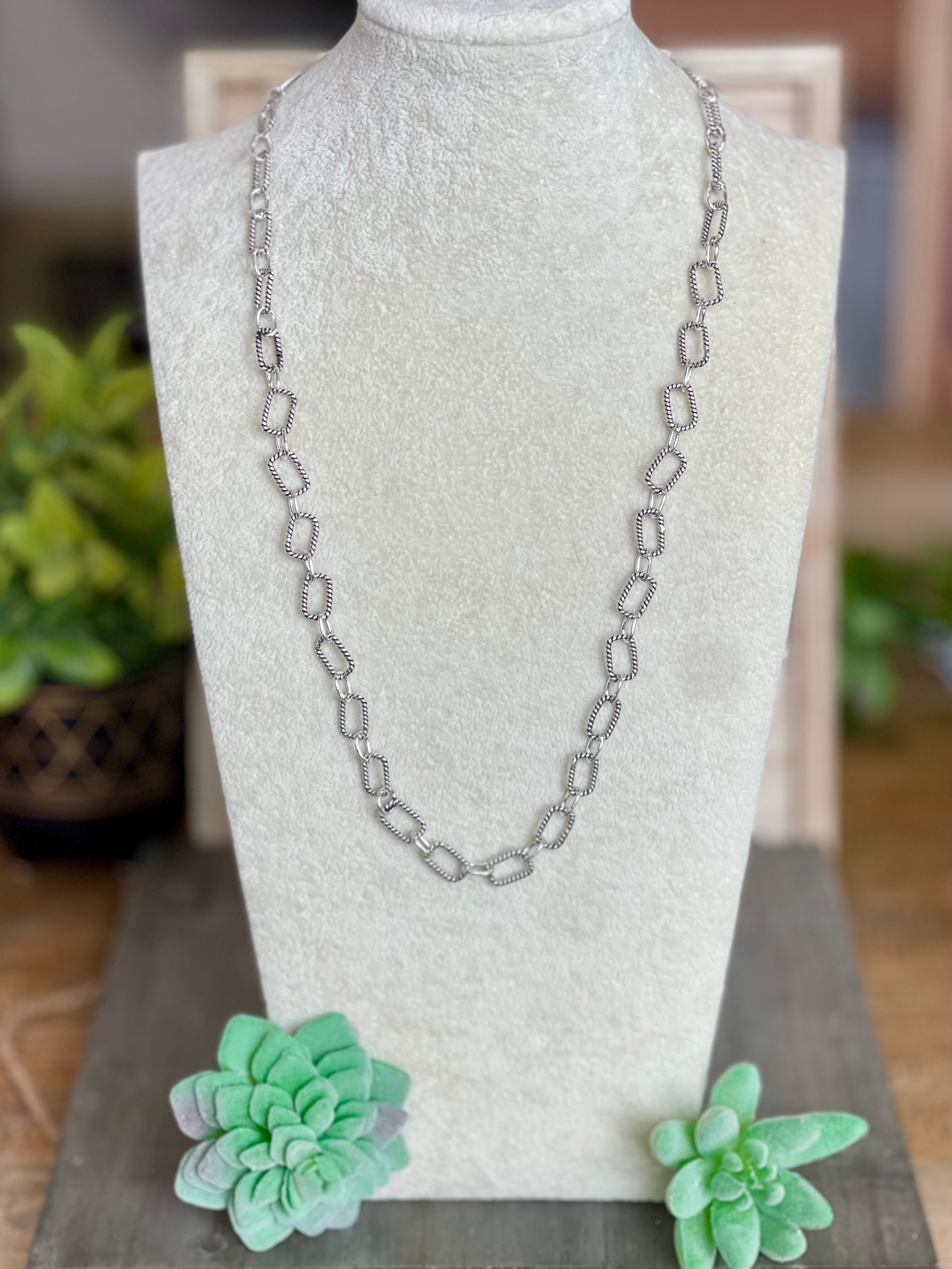 - Beautiful chain necklace. Southwest Handmade Sterling Silver 28 Inch Chain Necklace. It measures 28 inches long. Signed by the artist and stamped sterling silver.