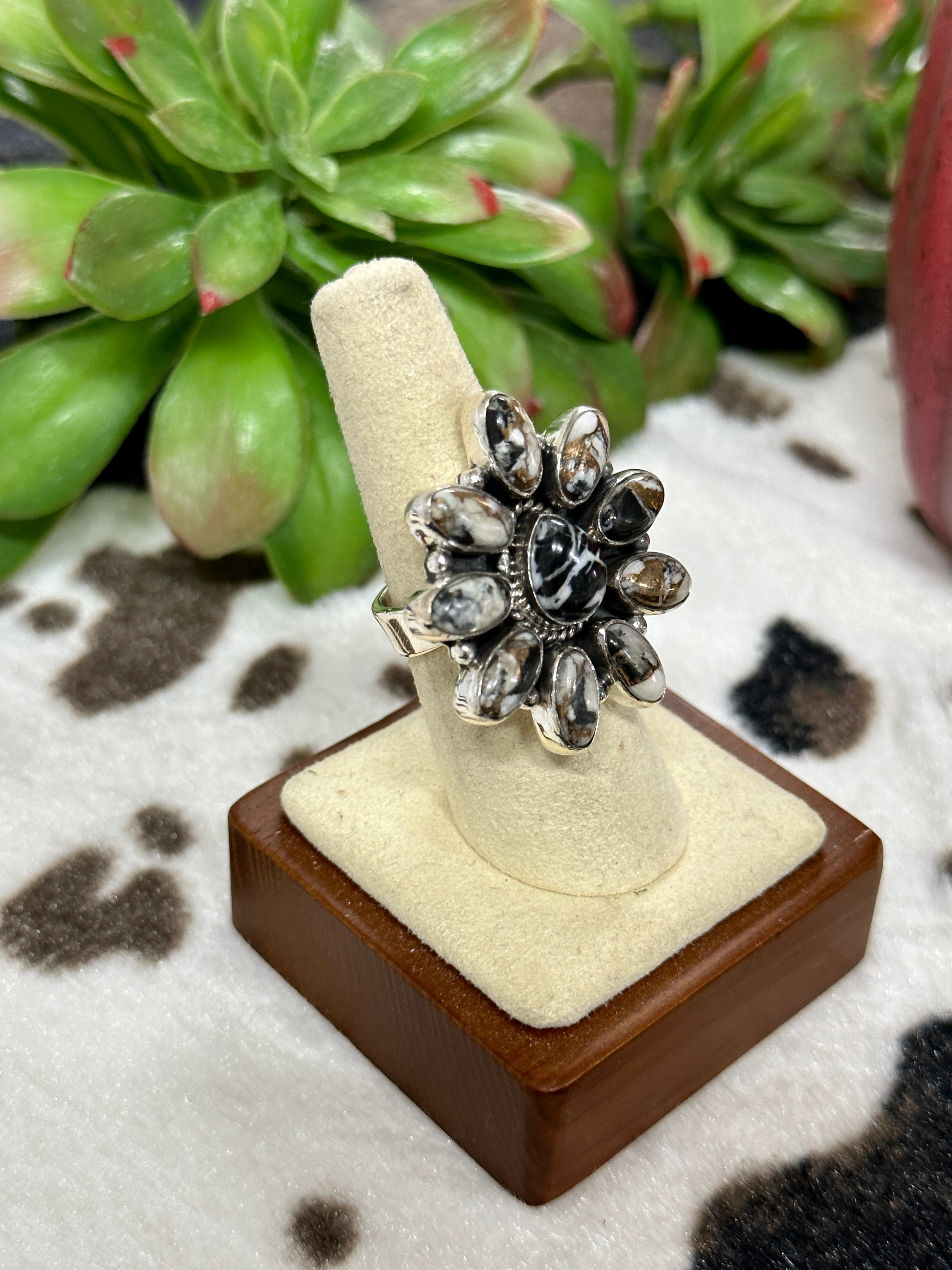 Beautiful cluster ring. Southwest Handmade White Buffalo Mohave & Sterling Silver Cluster Adjustable Ring. It measures 1 3/8 inches long and just over 1 1/4 inch wide. Stones will differ due to natural stones. Signed by the artist and stamped sterling silver.