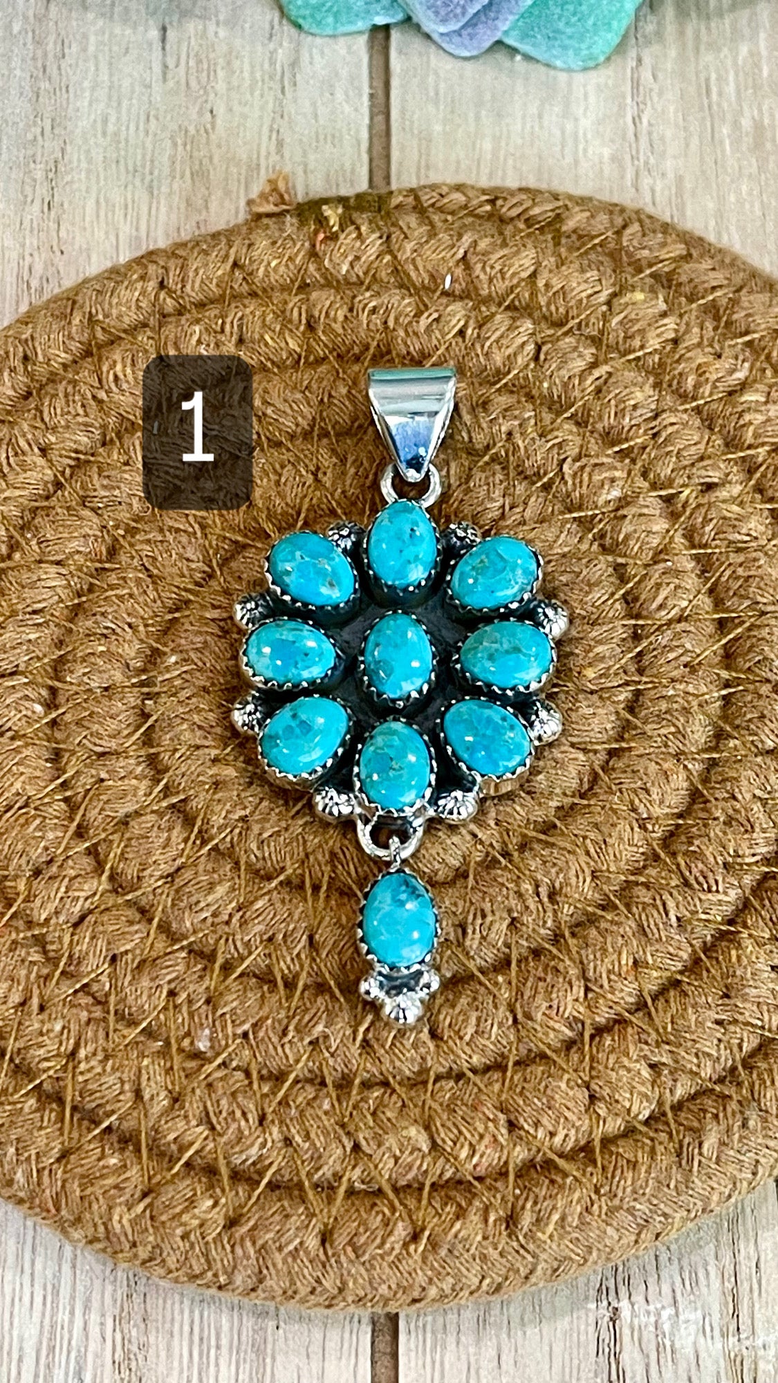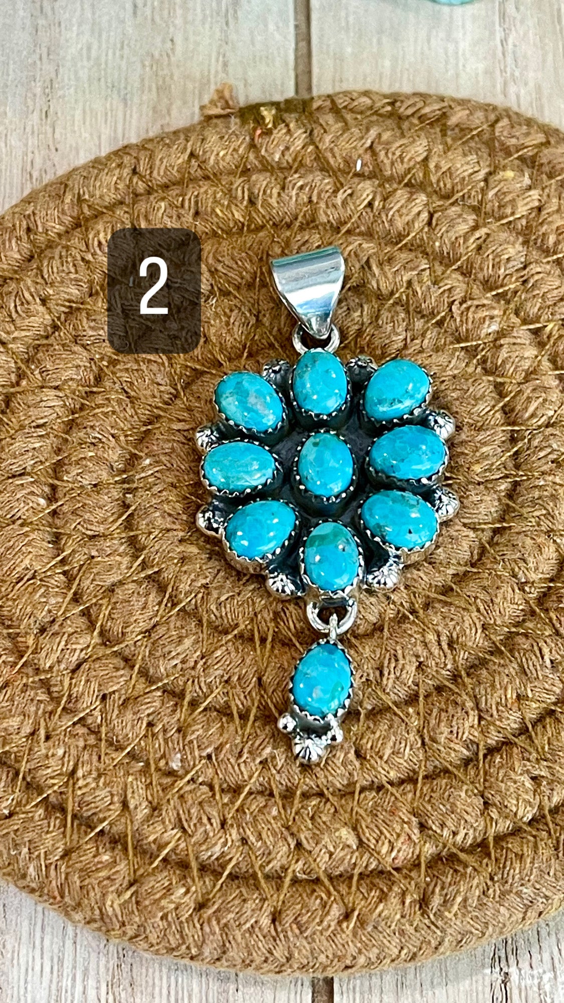 Beautiful craftsmanship. Southwest Handmade Kingman Turquoise & Sterling Silver Cluster Pendant. It measures 2 1/2 inches long and 1 1/8 inches wide. Pendant Only. Signed by the artist and stamped sterling silver.