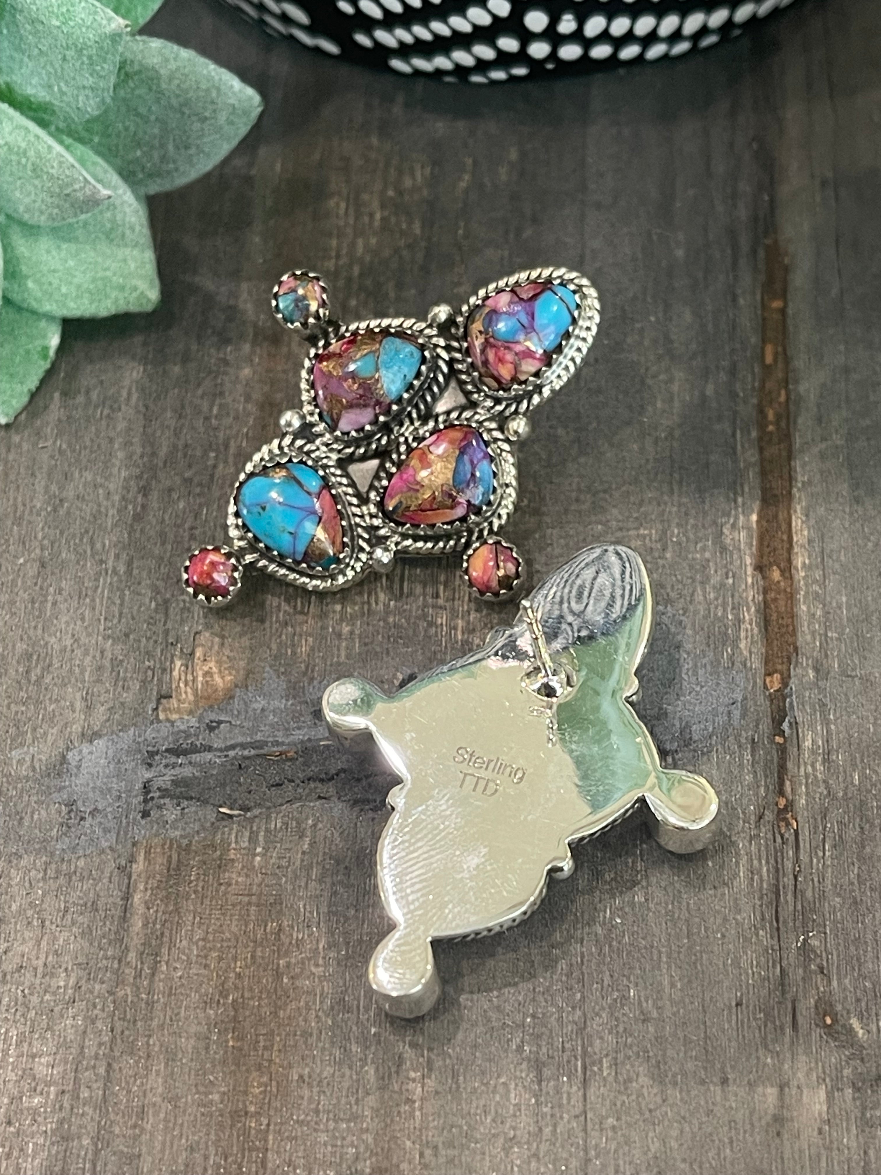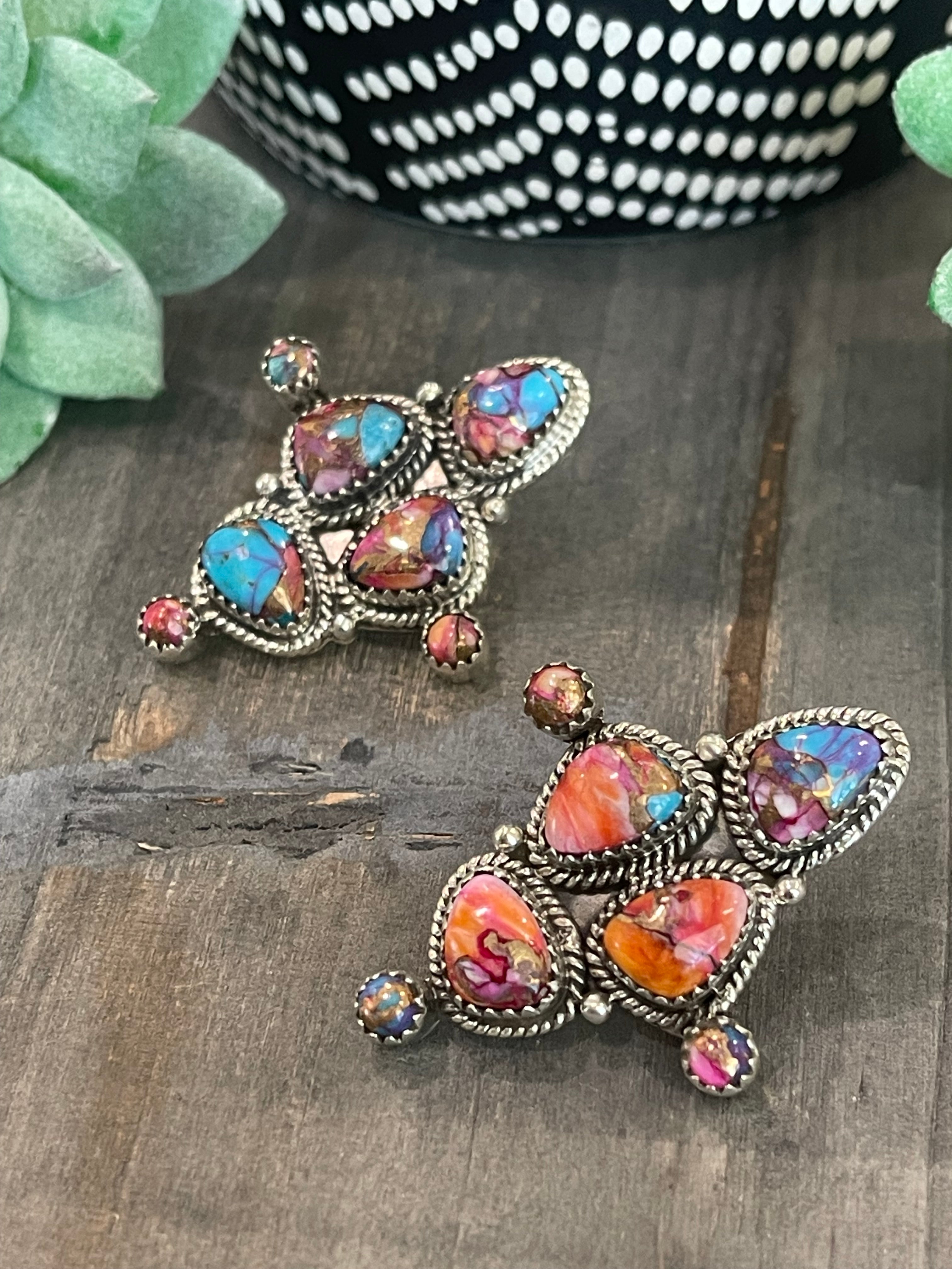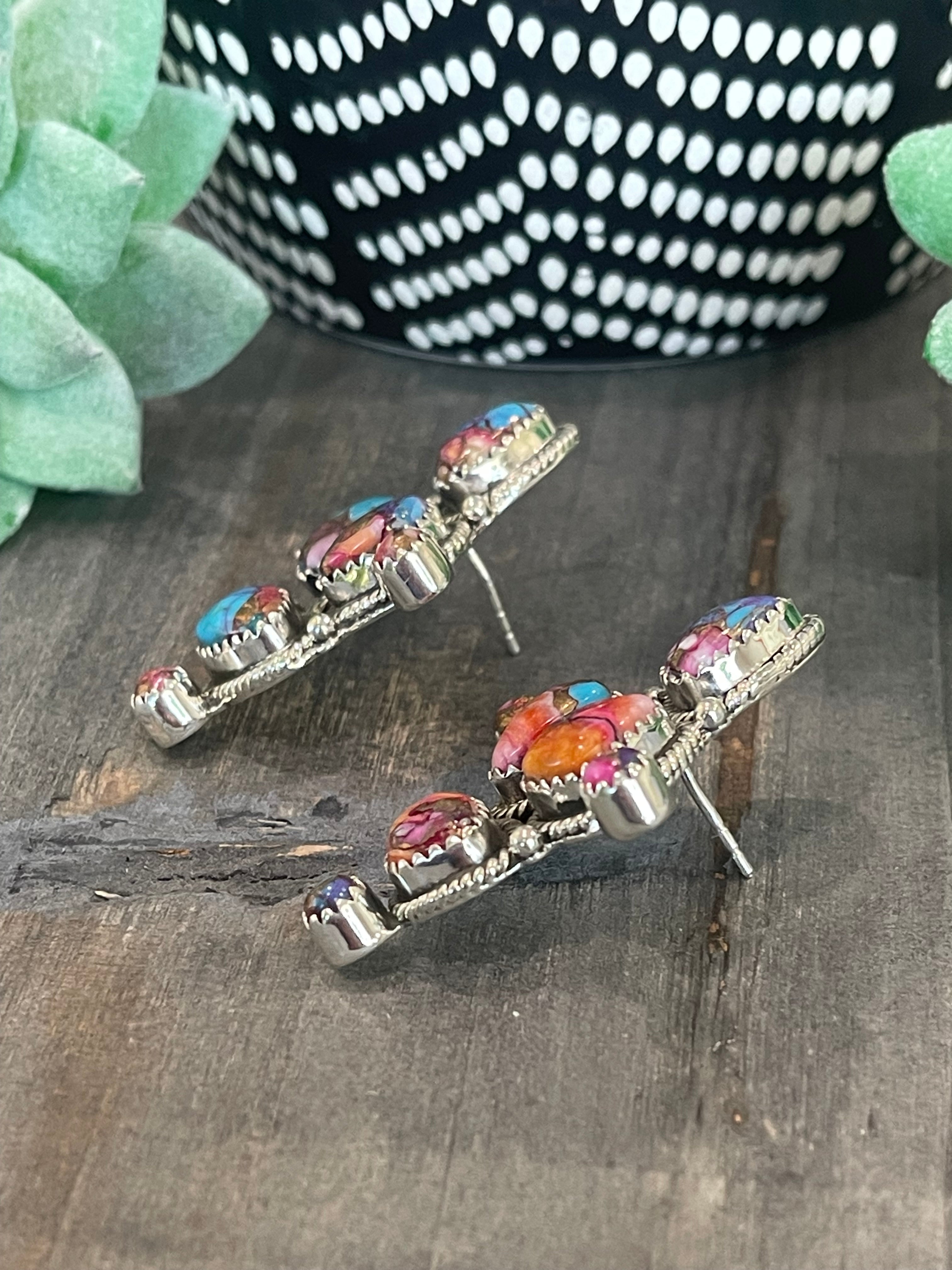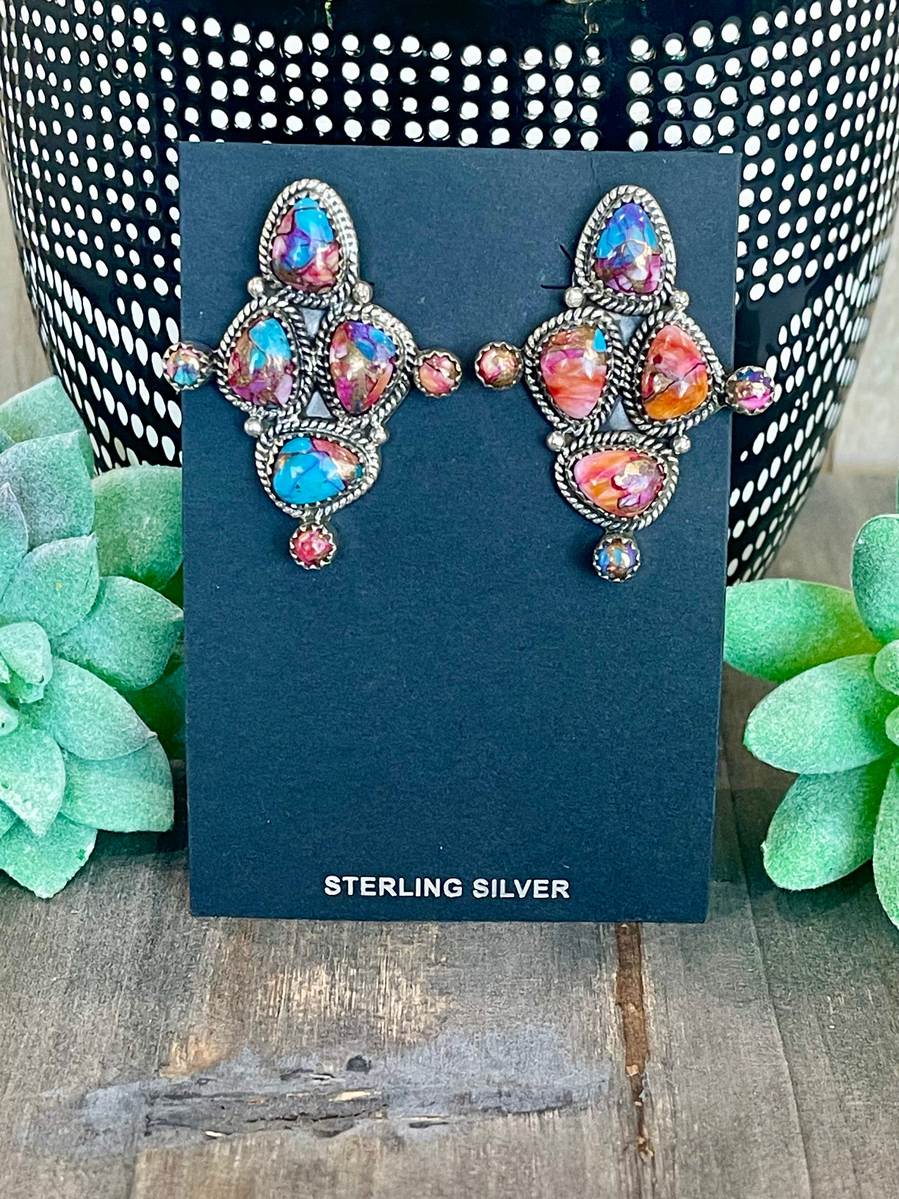 Breathtaking earrings. Southwest Handmade Pink Mohave & Sterling Silver Post Cluster Earrings. It measures 1 5/8 inches long and 1 1/4 inches wide. Signed by the artist and stamped sterling silver.