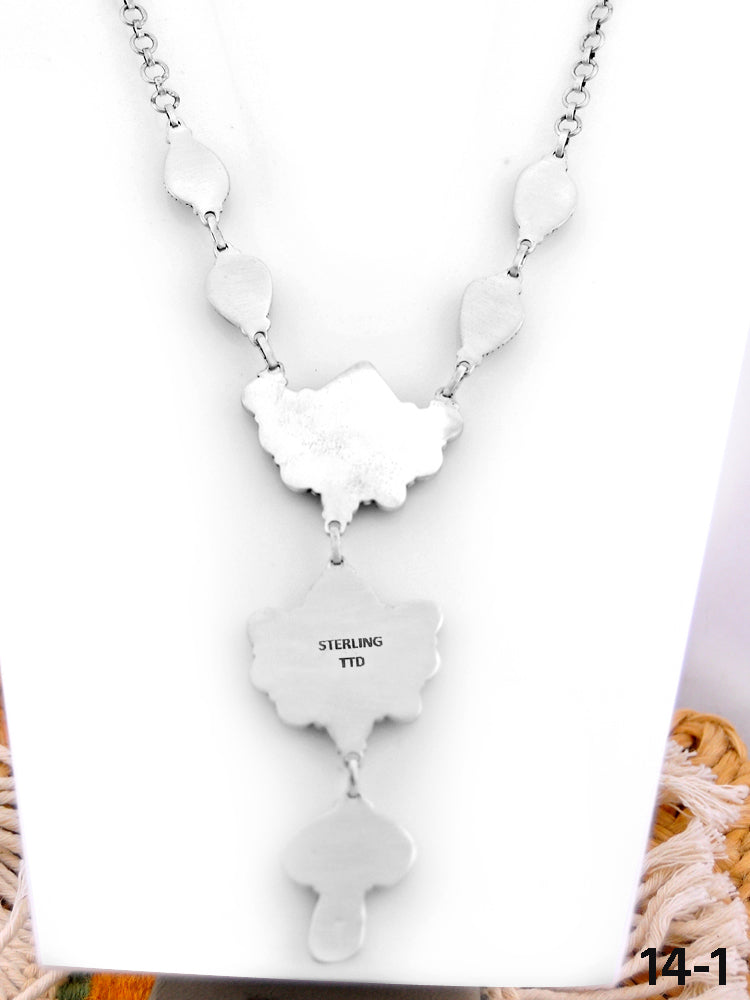 Southwest Made Black Jack Turquoise & Sterling Silver Necklace. It measures 20 inches long with hang while the chain measures 14 inches long, and drop 4 inches, and stones vary, from 5/8 up to 1 1/8 of an inch. Signed by the artist and stamped sterling silver.
