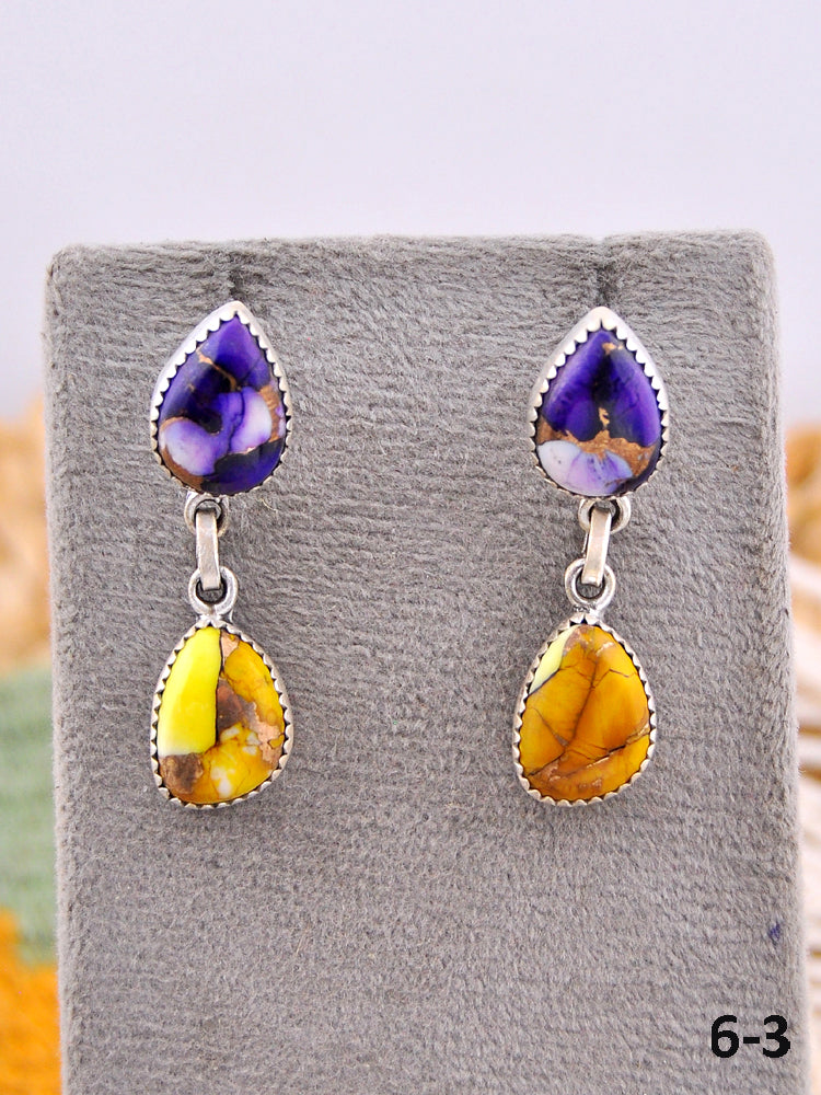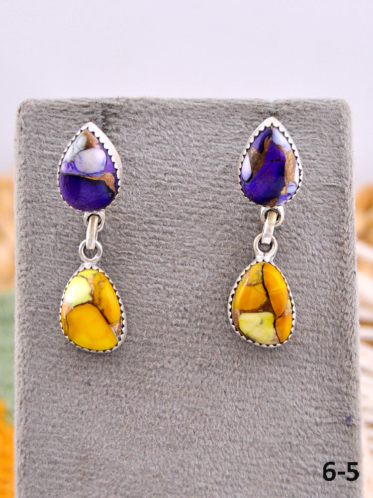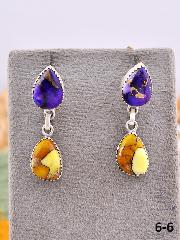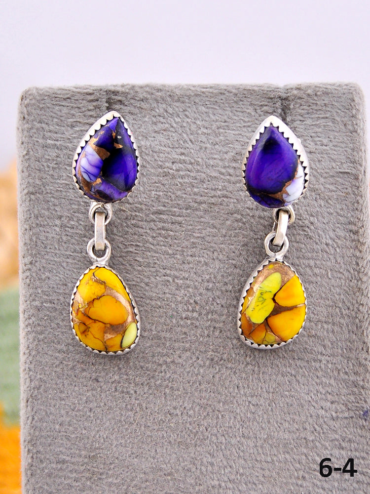 Southwest Made Honey and Grape Dahlia & Sterling Silver Post Earrings. It measures 1 1/8 inches long and 3/8 of an inch wide. Stamped and signed.