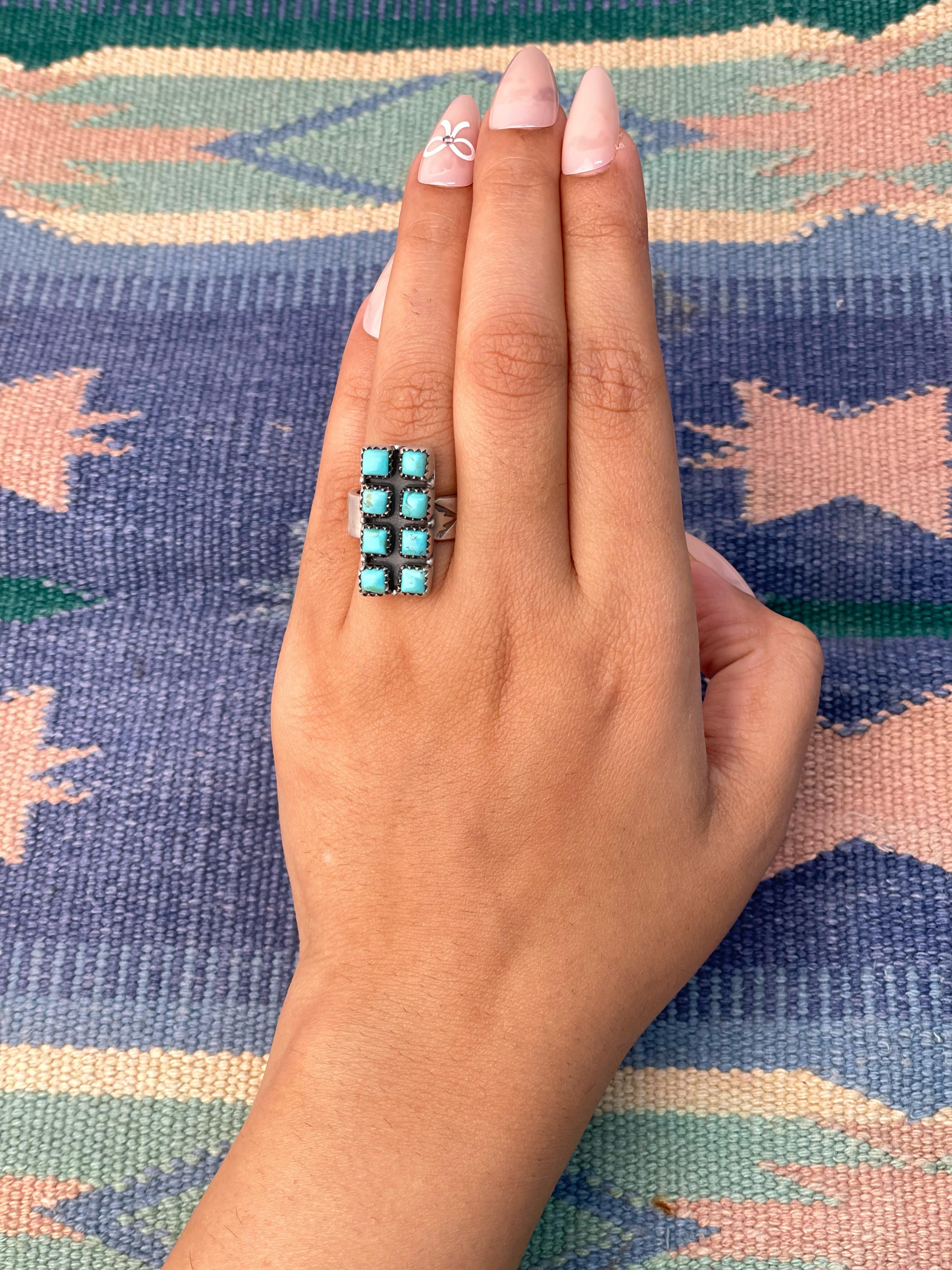 Southwest Made Kingman Turquoise & Sterling Sliver Adjustable Ring. It measures 1 inch long and 1/2 of an inch wide.