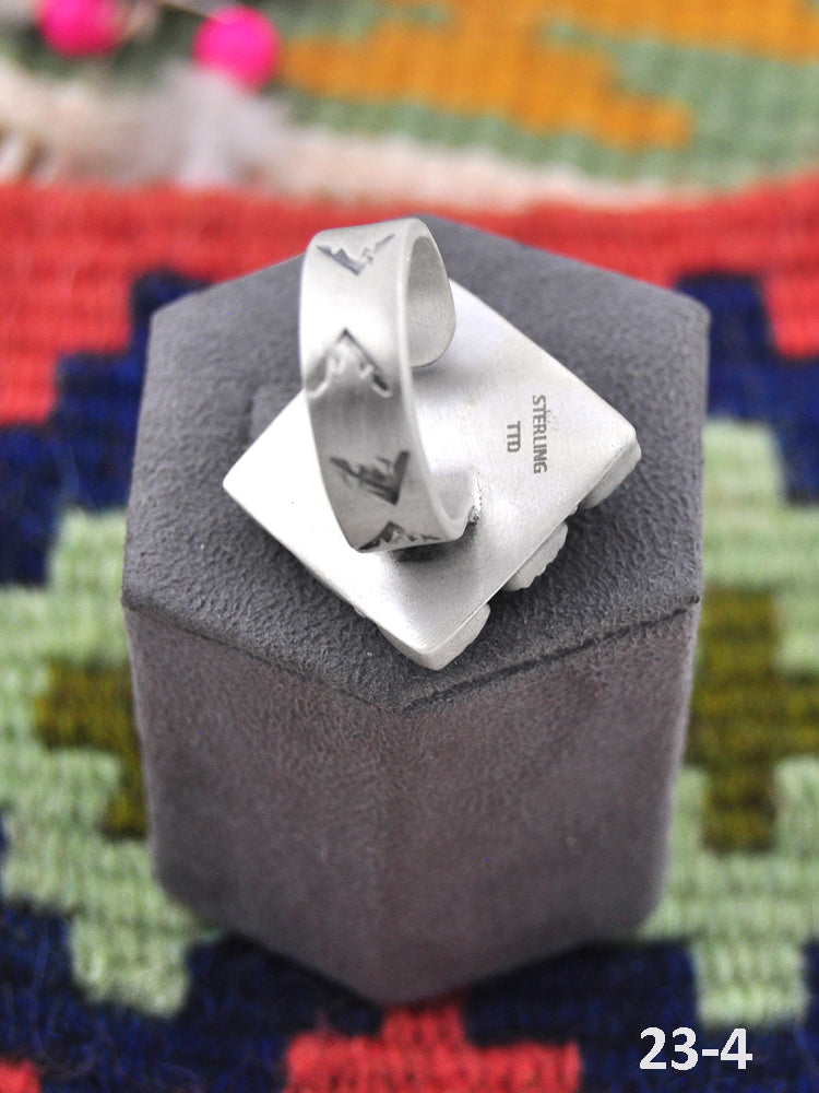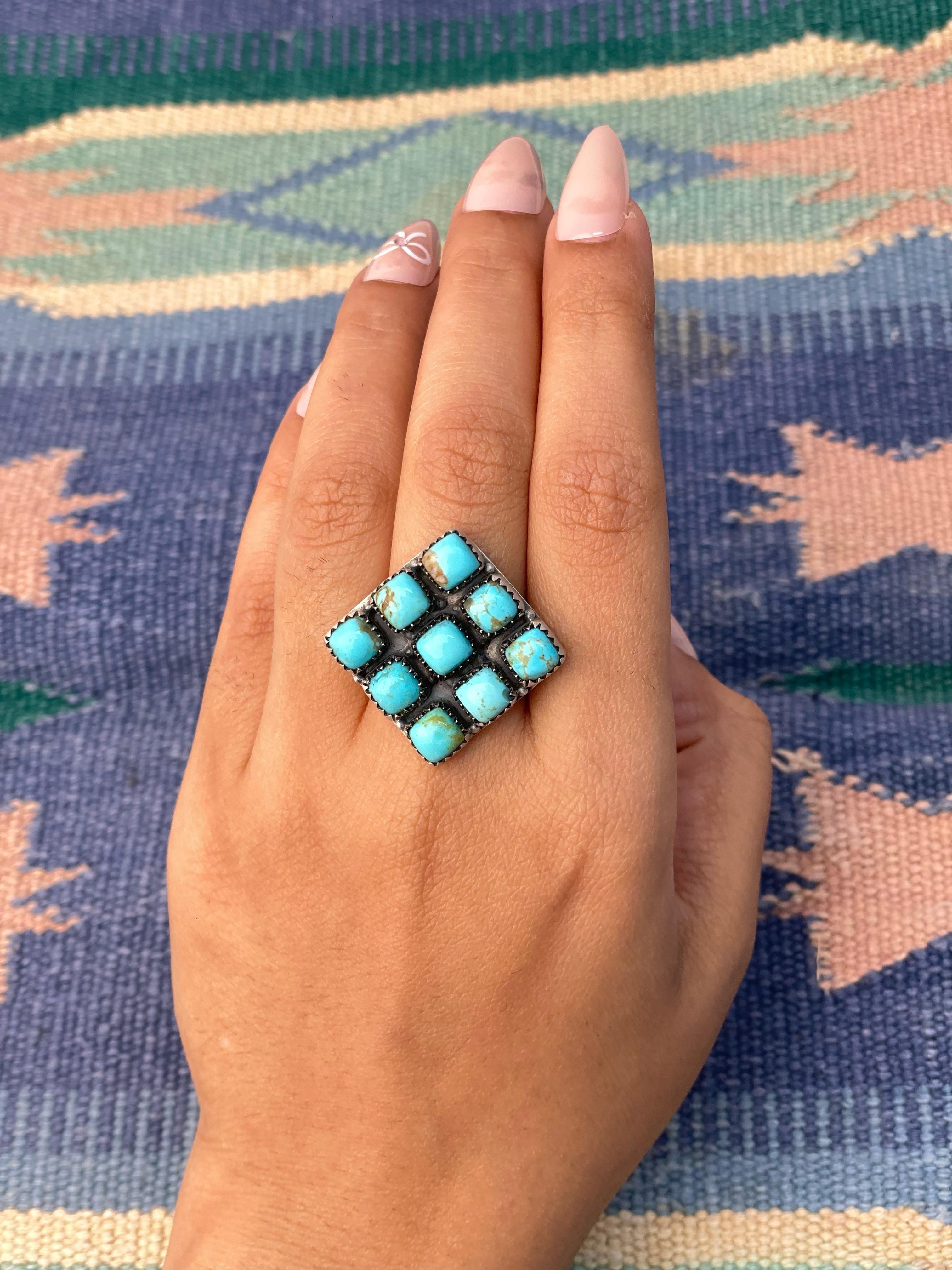 Southwest Made Kingman Turquoise & Sterling Sliver Adjustable Ring. It measures 1 1/4 inches long and 1 1/4 inches wide.