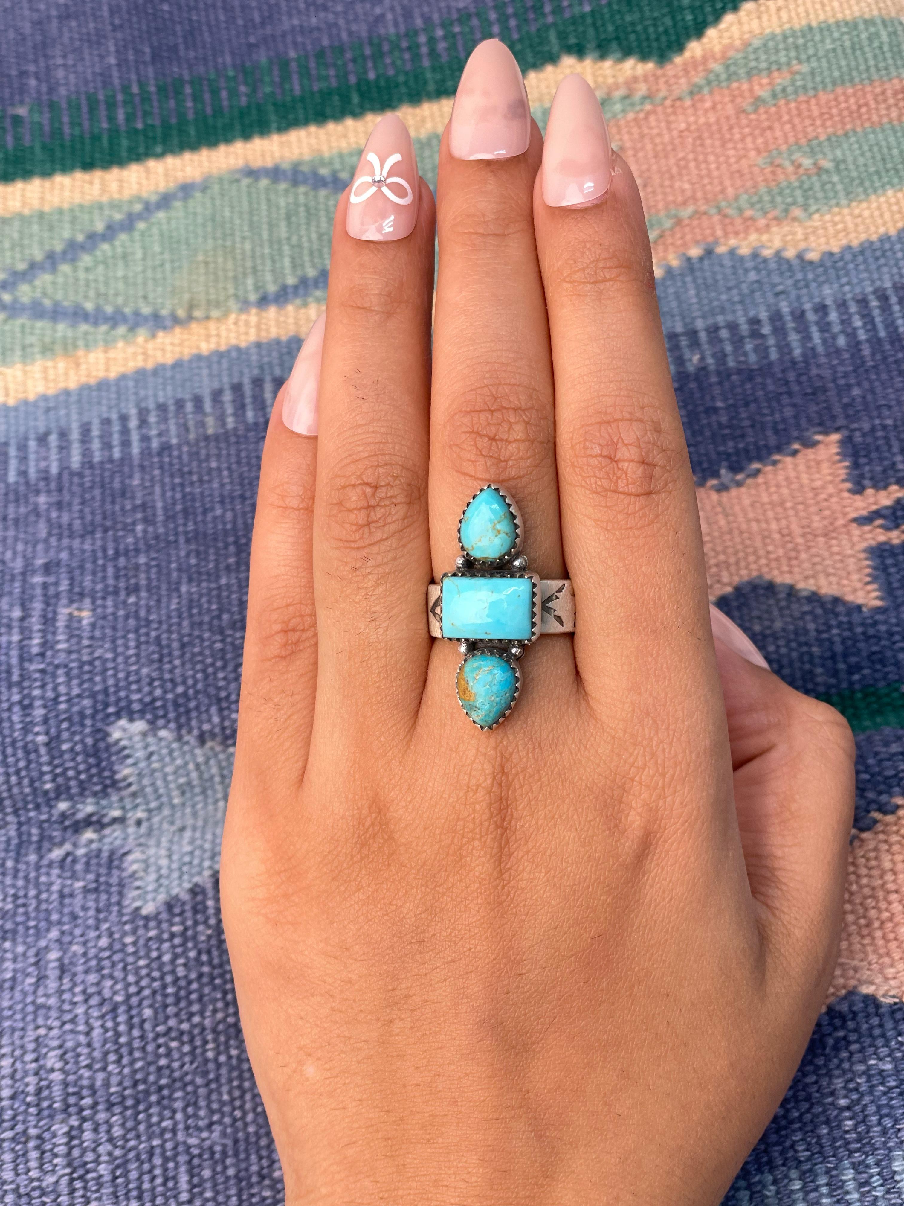 Southwest Made Kingman Turquoise & Sterling Sliver Adjustable Ring. It measures 1 3/8 inches long and 1/2 of an inch wide.