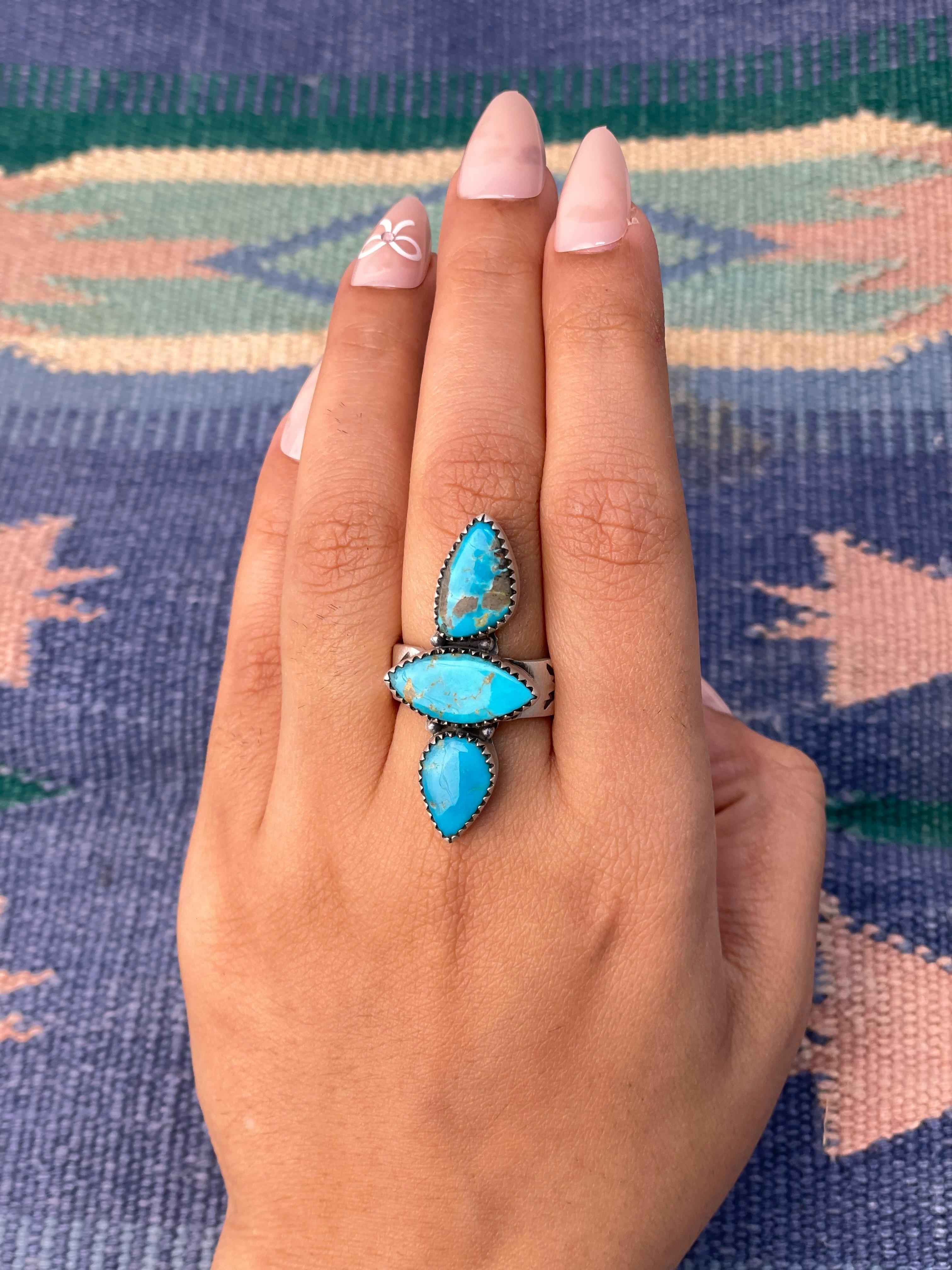 Southwest Made Kingman Turquoise & Sterling Sliver Adjustable Ring. It measures 1 5/8 inches long and 3/4 of an inch wide.