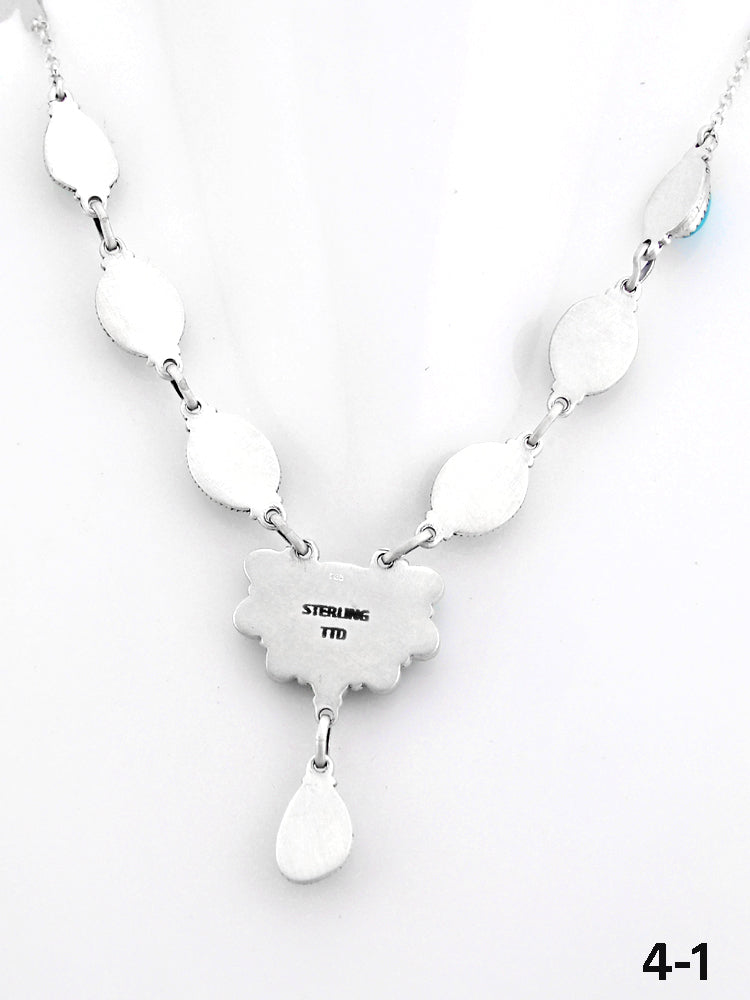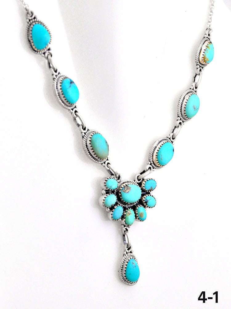 Southwest Made Kingman Turquoise & Sterling Silver Necklace. It measures 24 inches long with hang while the chain measures 20 inches long, with drop 2 inches. Signed by the artist and stamped sterling silver.