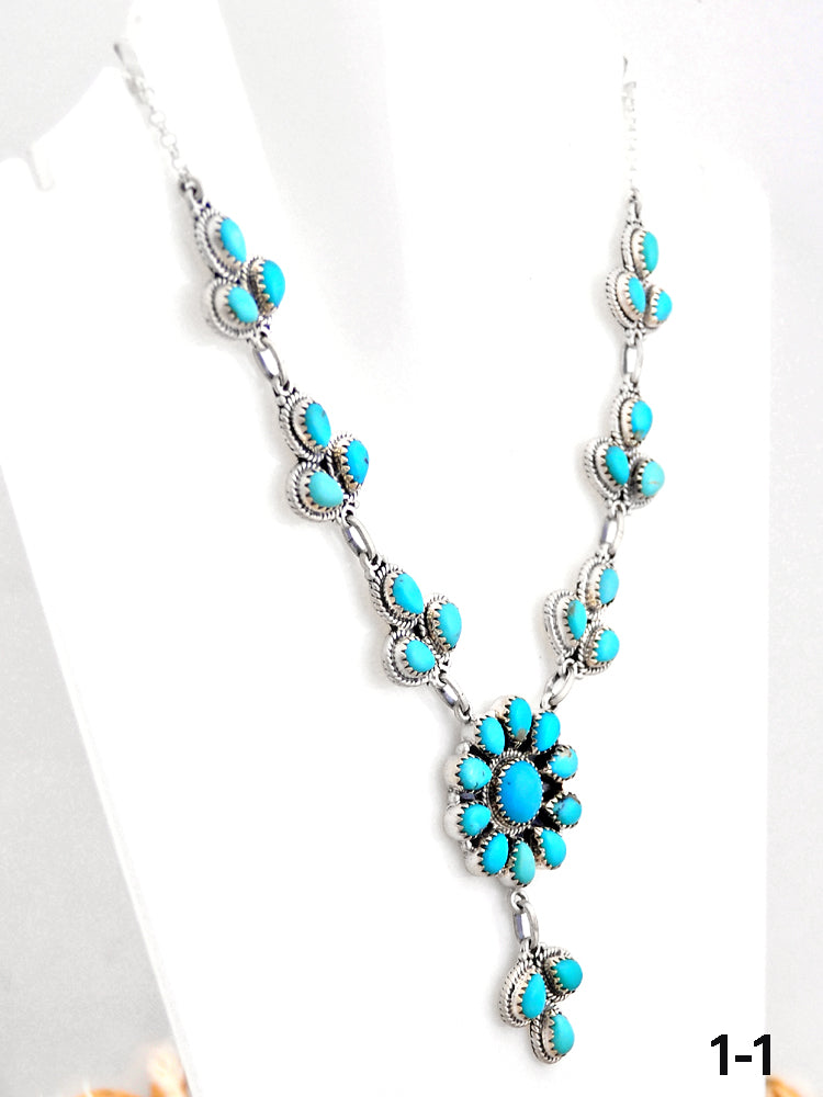 Southwest Made Kingman Turquoise & Sterling Silver Necklace. It measures 25 inches long with hang while the chain measures 21 inches long, with drop 2 1/4 inches. Signed by the artist and stamped sterling silver.