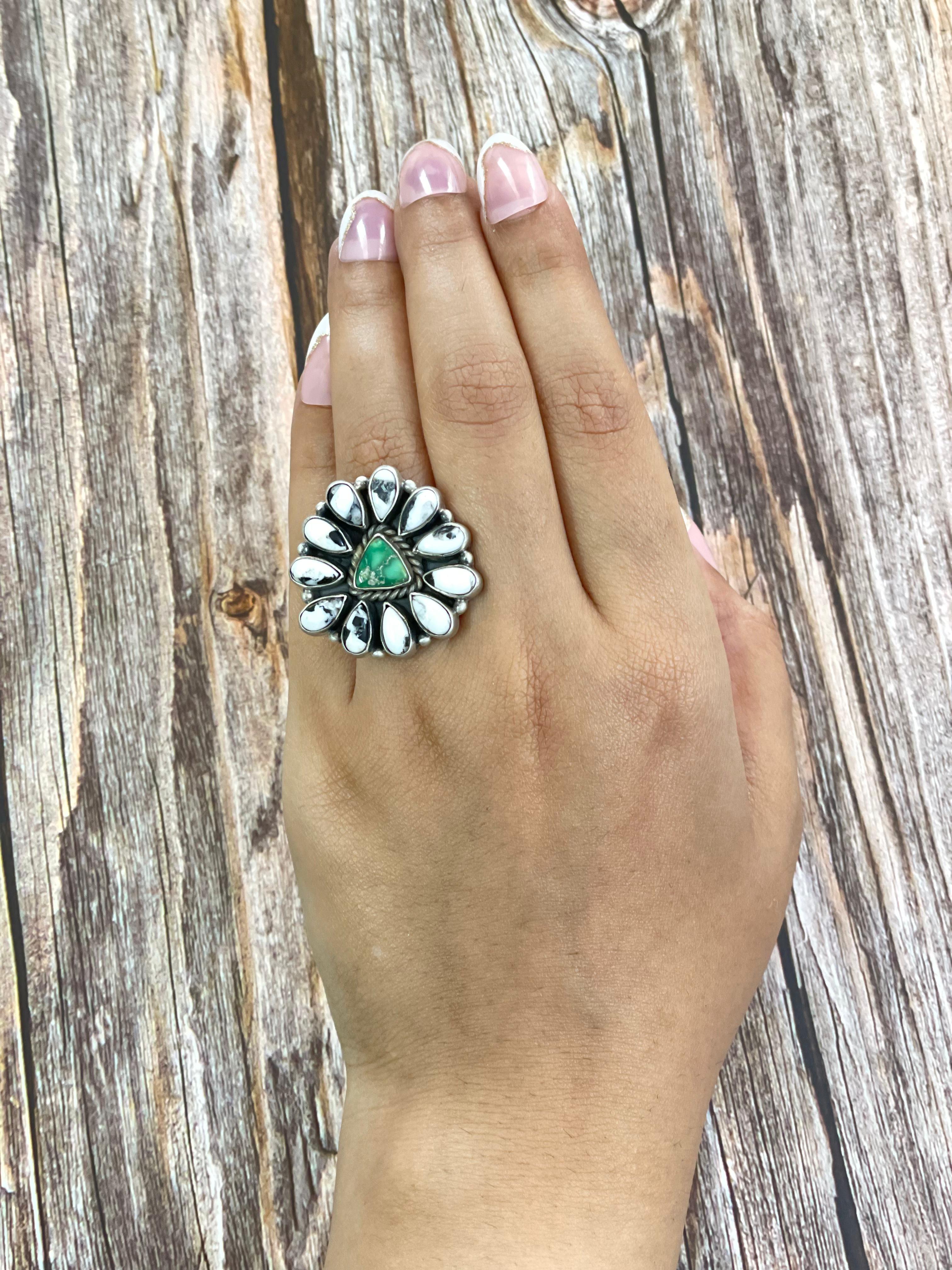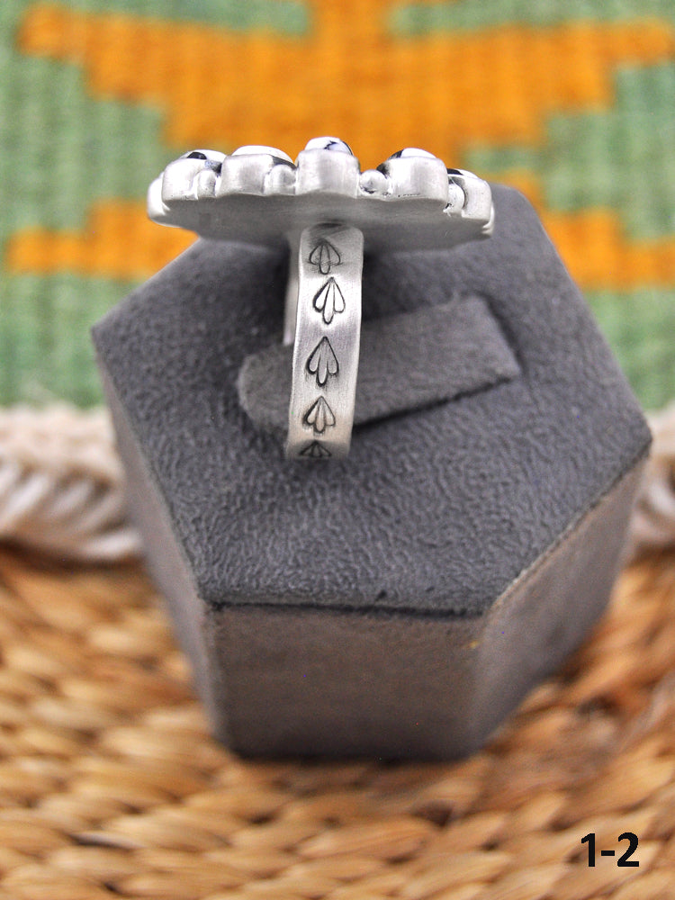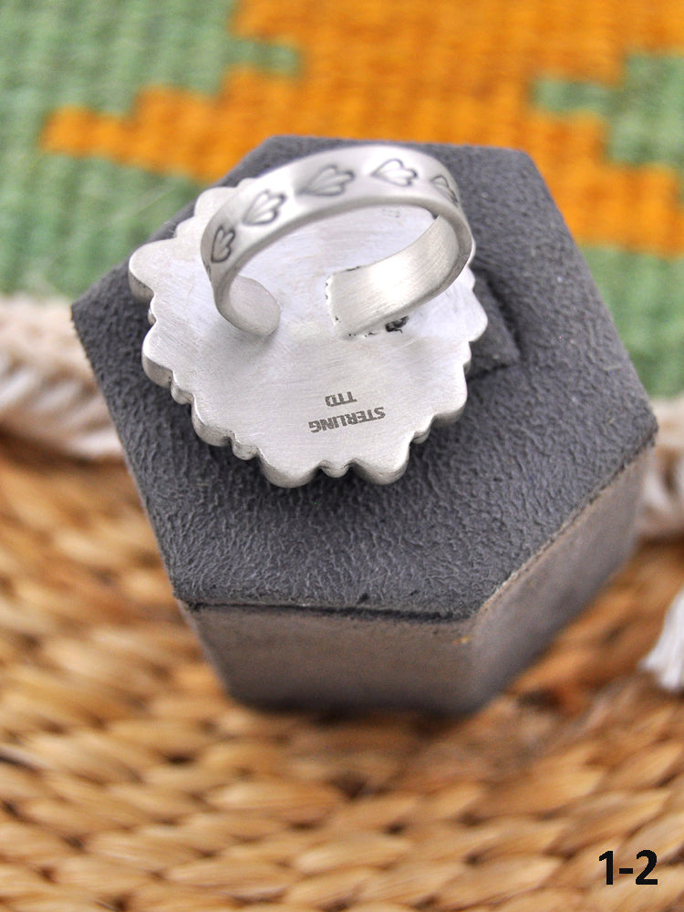 Southwest Made Multi Stone & Sterling Sliver Adjustable Ring. It measures 1 1/4 inches long and 1 1/4 inches wide.