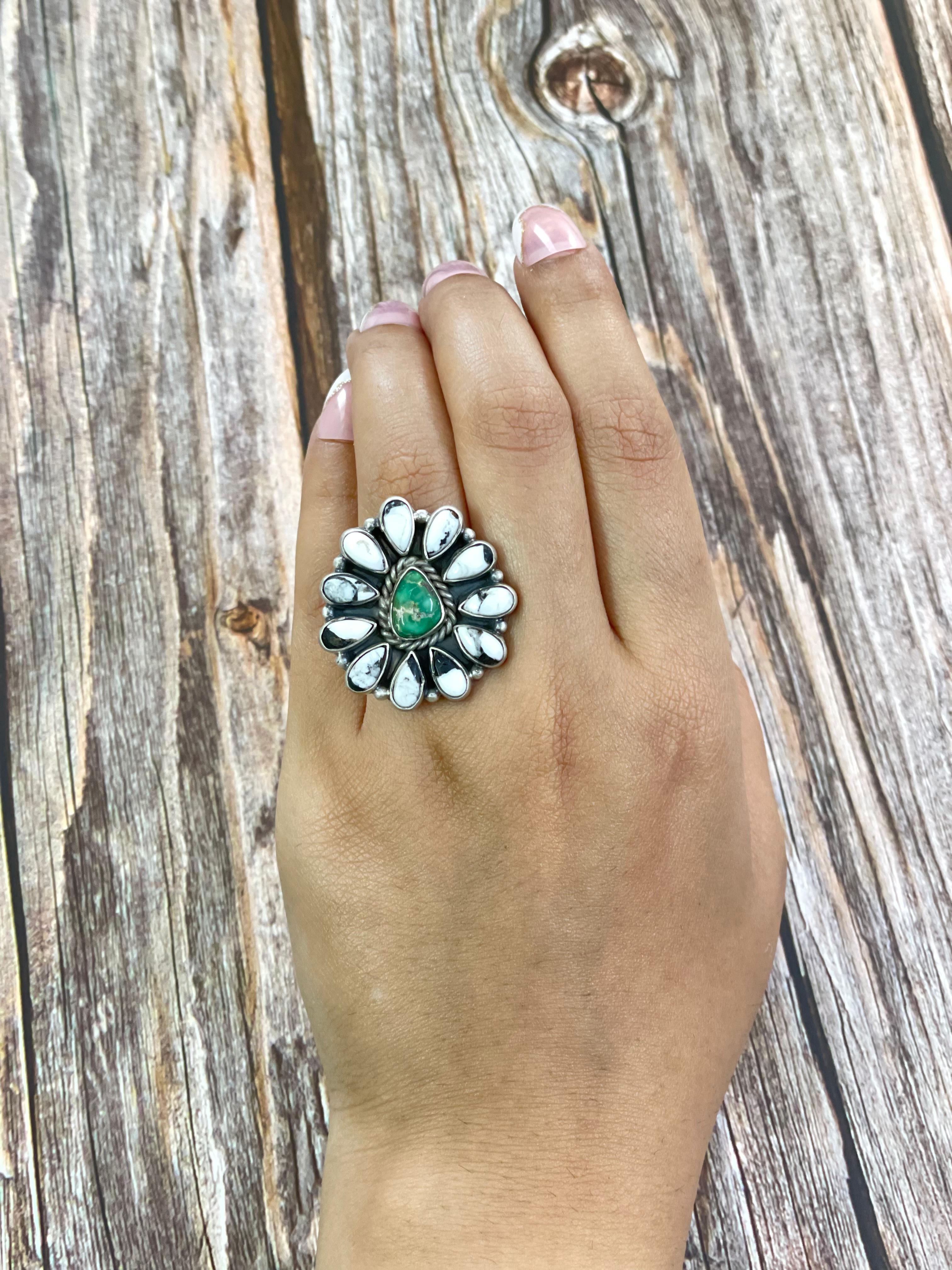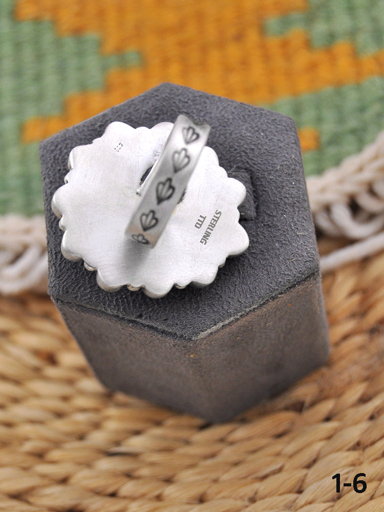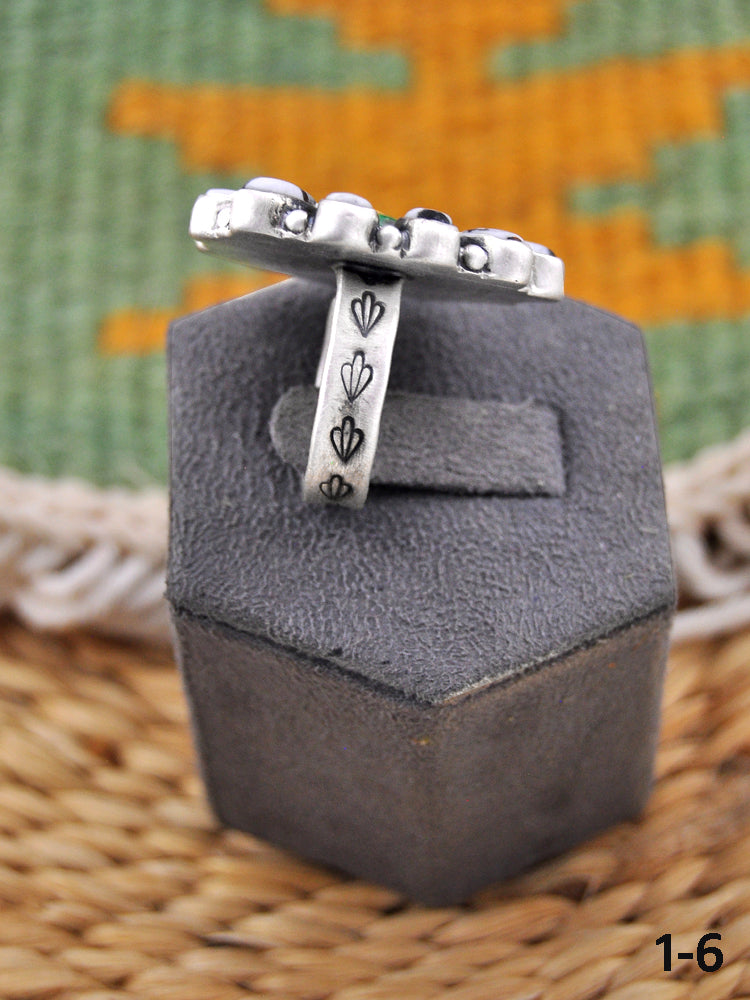 Southwest Made Multi Stone & Sterling Sliver Adjustable Ring. It measures 1 1/4 inches long and 1 1/4 inches wide.