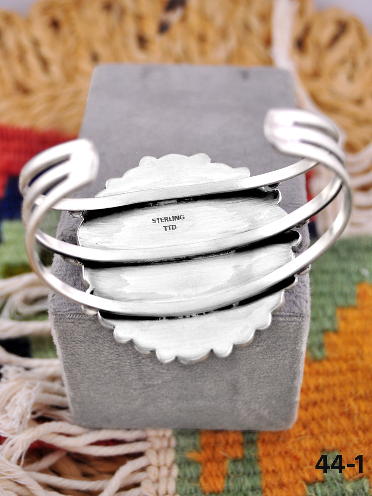 Southwest Made Multi Stone & Sterling Silver Cuff Bracelet. It measures 2 1/8 inches wide with an inside circumference of 6 inches and a gap of 1 inch. Signed by artist and stamped sterling silver. Cuff has flex to it.