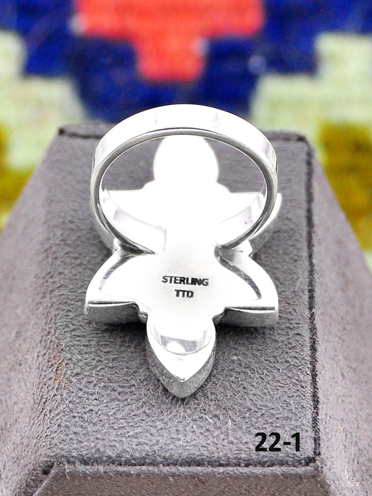 Southwest Made South Hill Turquoise & Sterling Sliver Adjustable Ring. It measures 1 1/2 inches long and 7/8 of an inch wide. Signed by the artist and stamped sterling silver.