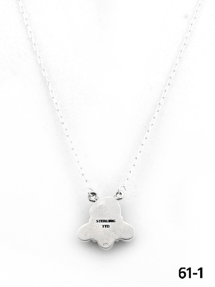 Southwest Made Peacock Dahlia & Sterling Silver Necklace. It measures 18 inches long with hang while the chain measures 17 4/8 inches long. Signed by the artist and stamped sterling silver.