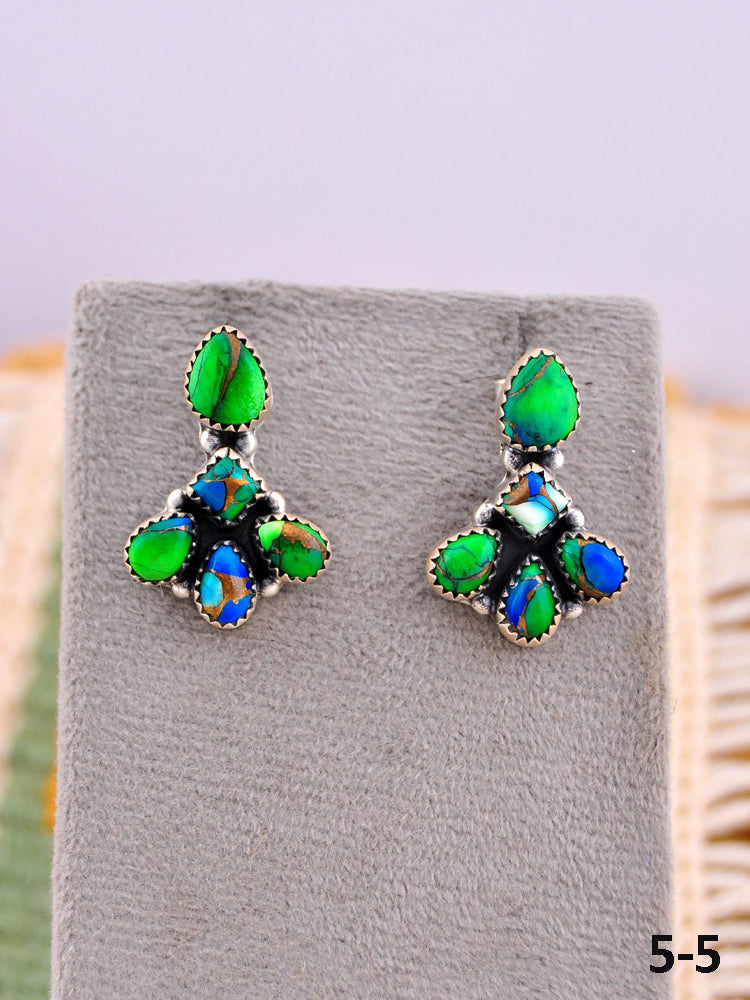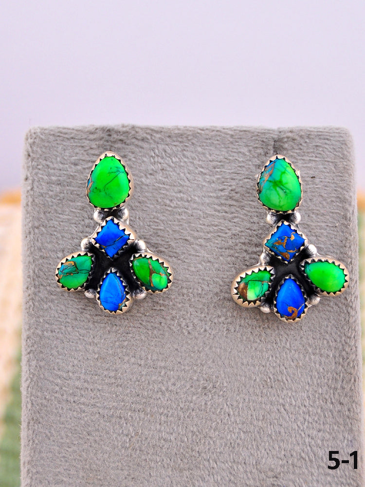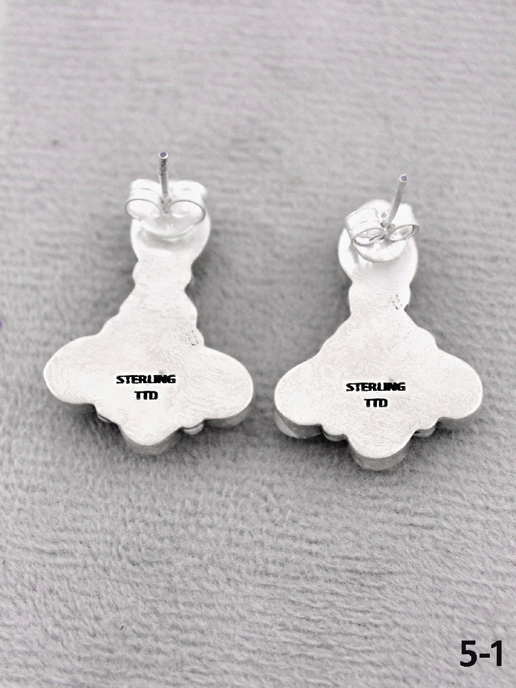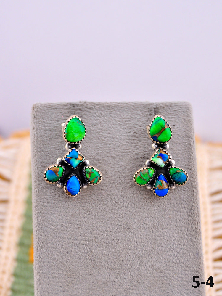 Southwest Made Peacock Dahlia & Sterling Silver Post Earrings. It measures 1 1/4 inches long and 3/4 of an inch wide. Stamped and signed.