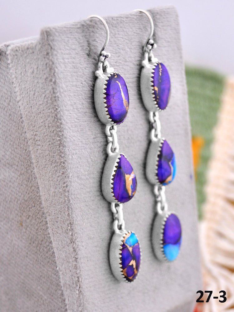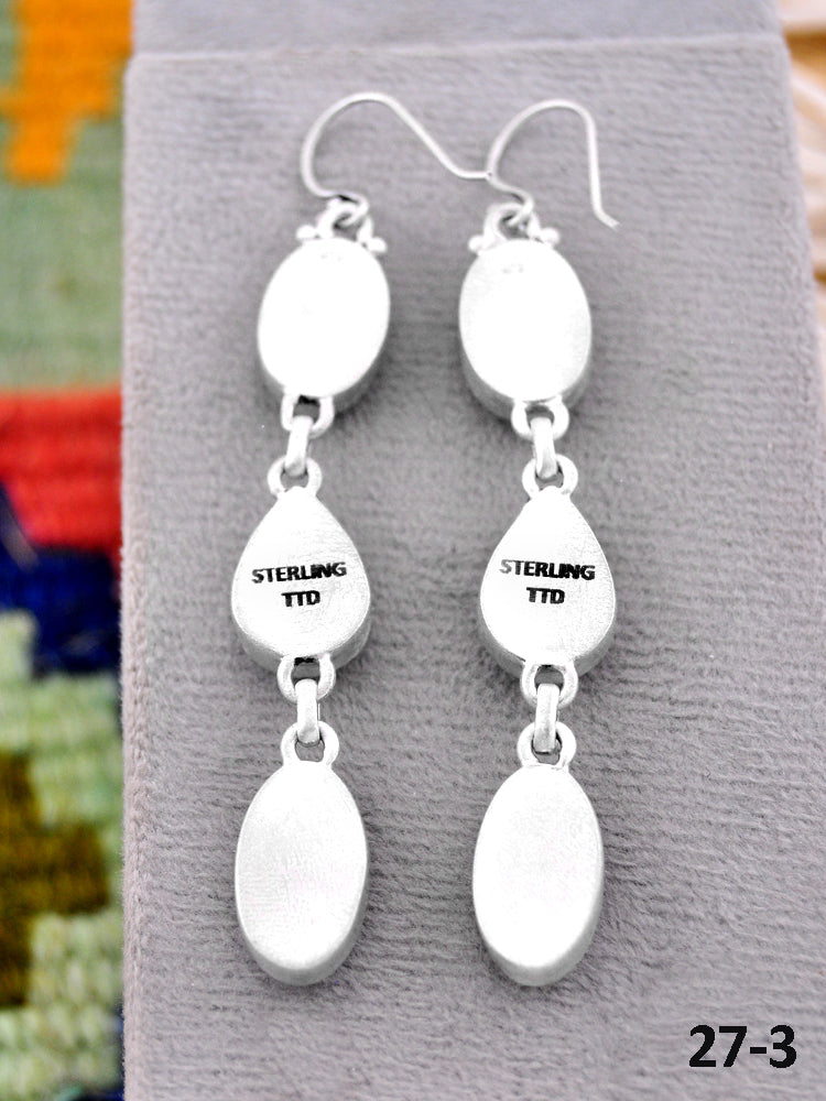 Southwest Made Purple Dahlia & Sterling Silver Hook Dangle Earrings. It measures 3 3/8 inches long and a little over 3/8 of an inch wide. Stamped and signed.