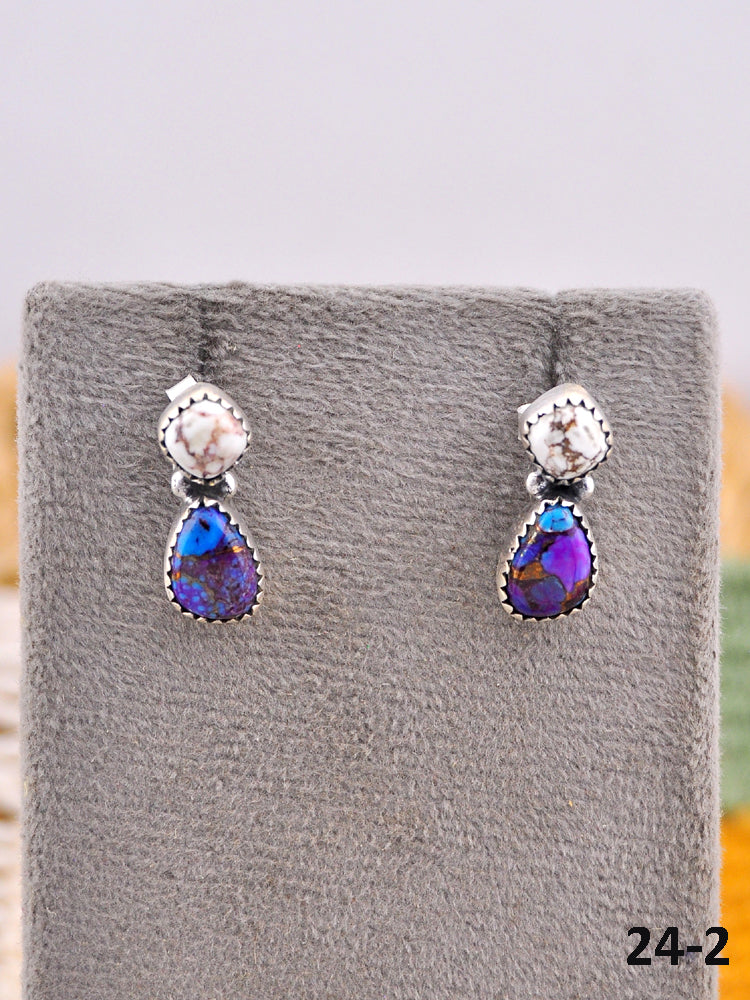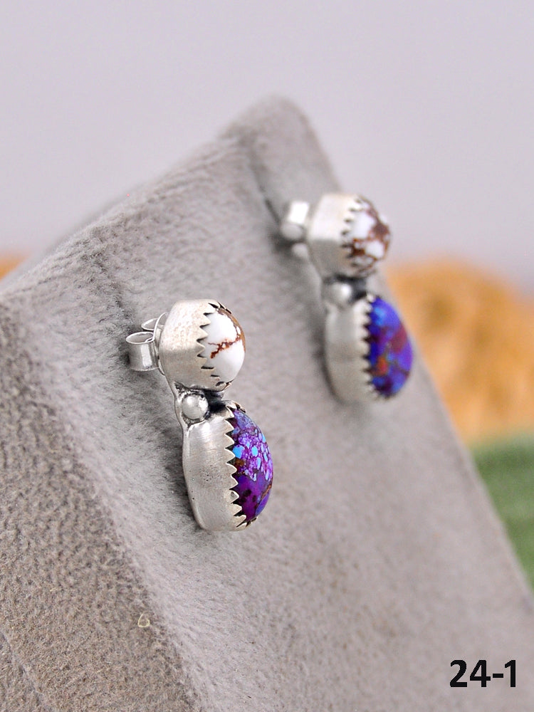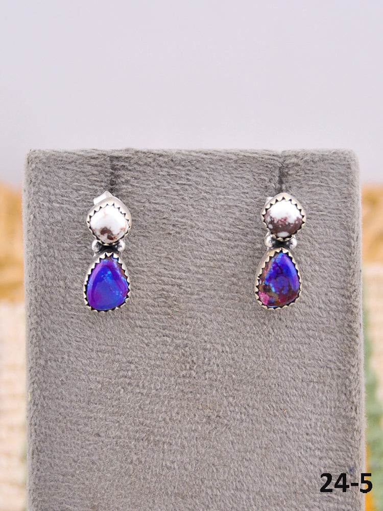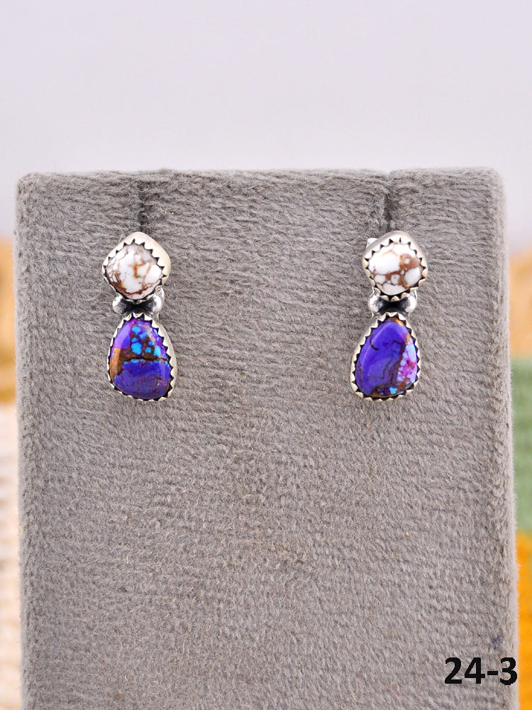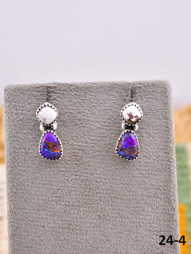 Southwest Made Purple Dahlia with Wild Horse Magnesite & Sterling Silver Post Earrings. It measures 3/4 of an inch long and 1/4 of an inch wide. Stamped and signed.
