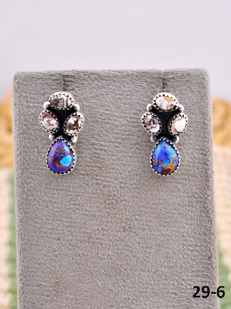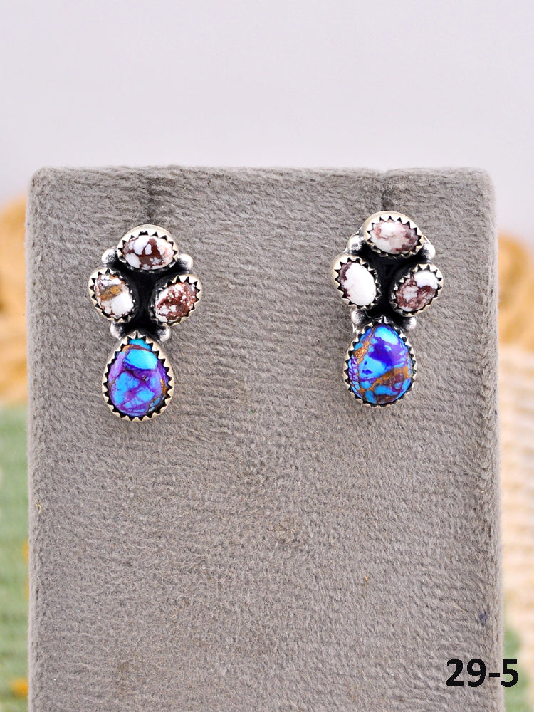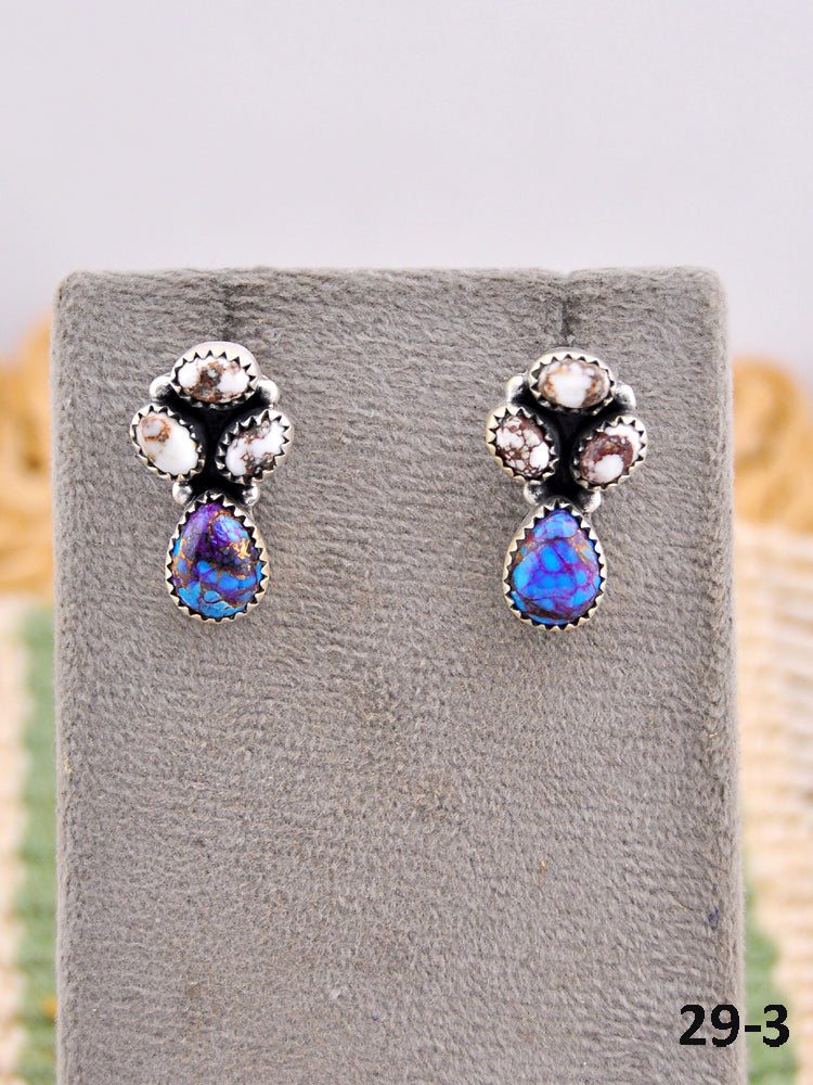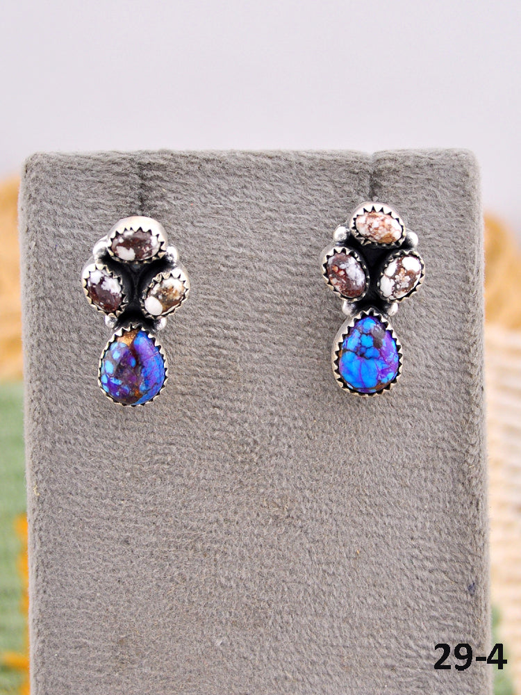 Southwest Made Purple Dahlia with Wild Horse Magnesite & Sterling Silver Post Earrings. It measures 1 inch long and 1/2 of an inch wide. Stamped and signed.