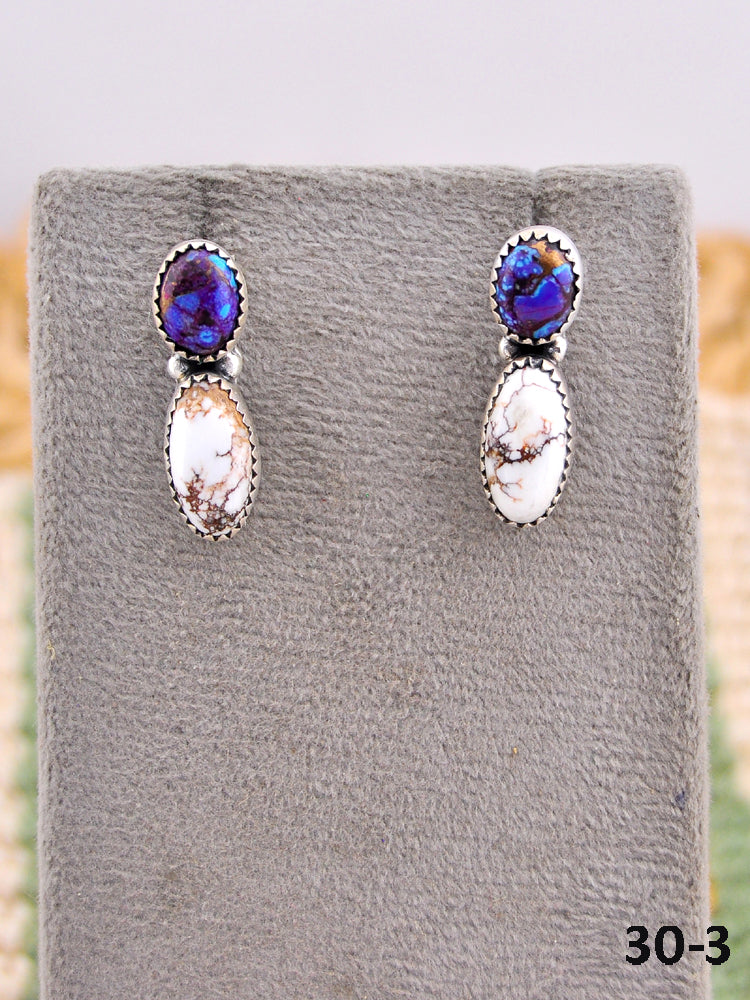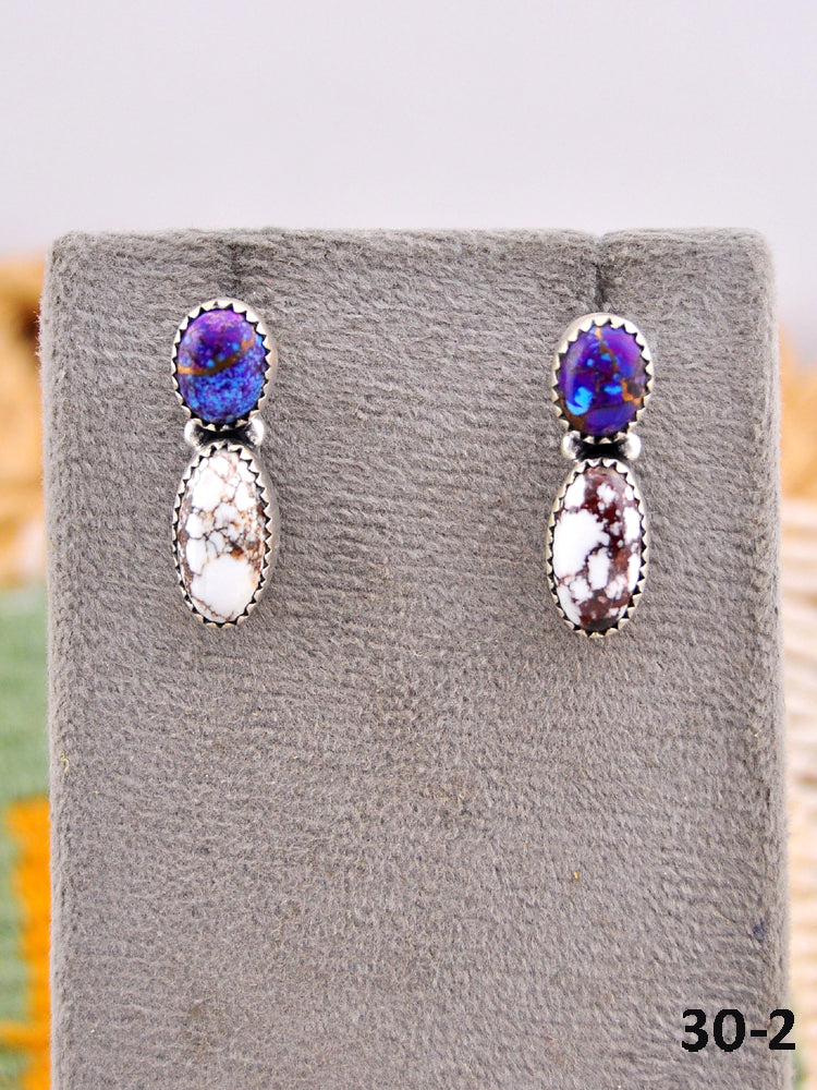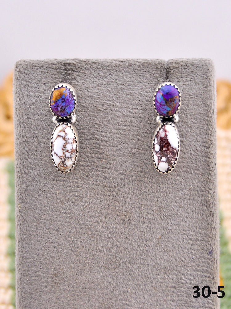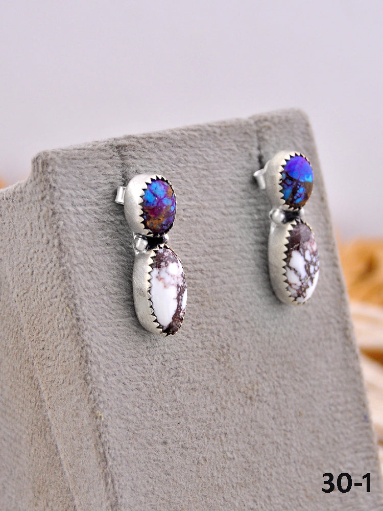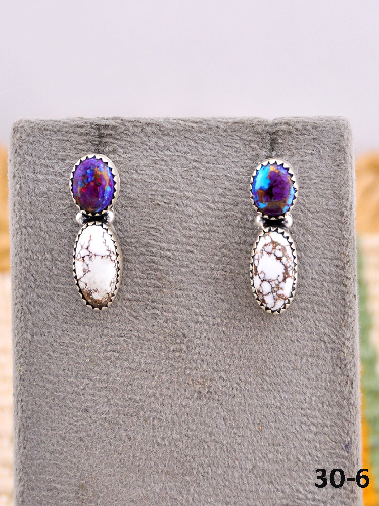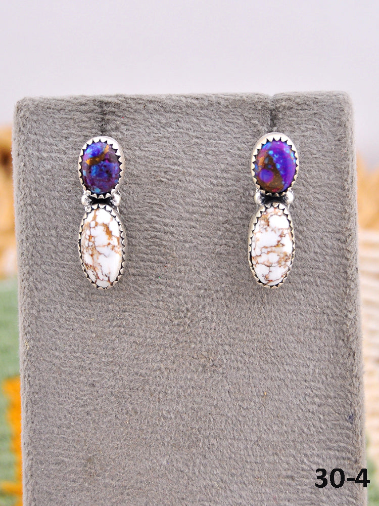 Southwest Made Purple Dahlia with Wild Horse Magnesite & Sterling Silver Post Earrings. It measures 1 inch long and 3/8 of an inch wide. Stamped and signed.