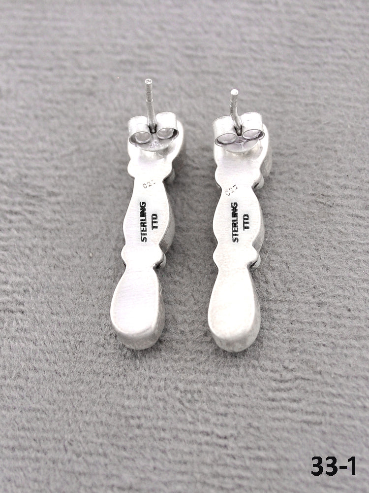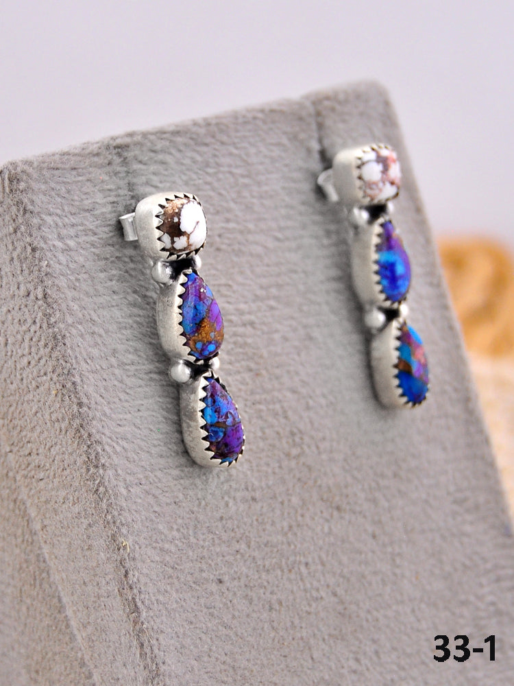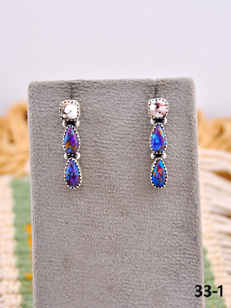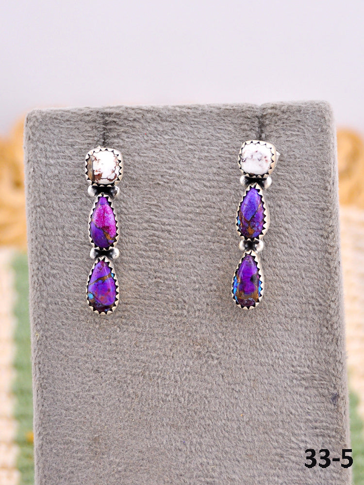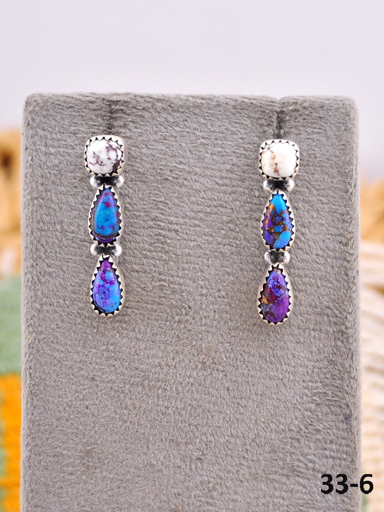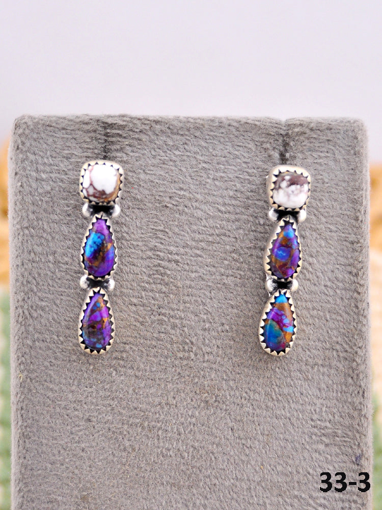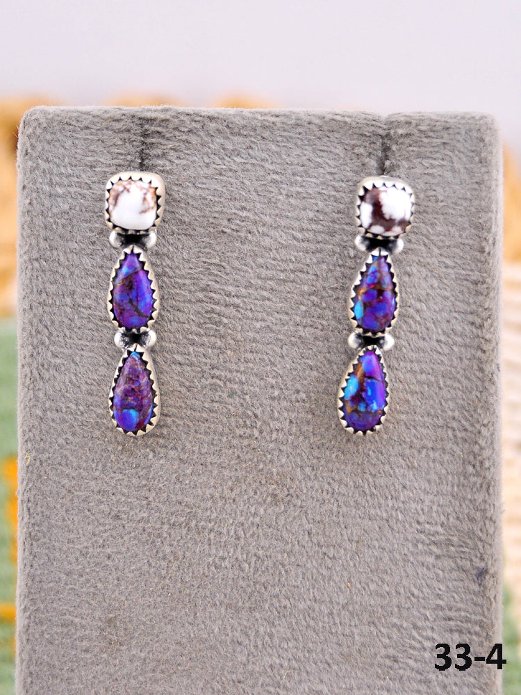 Southwest Made Purple Dahlia with Wild Horse Magnesite & Sterling Silver Post Earrings. It measures 1 1/4 inches long and 1/4 inches wide. Stamped and signed.