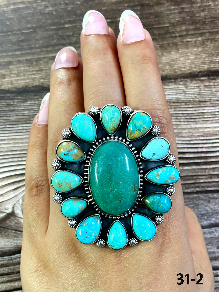 Southwest Made Royston Turquoise & Sterling Sliver Adjustable Ring. It measures 2 3/8 inch long and 2 1/8 inch wide.