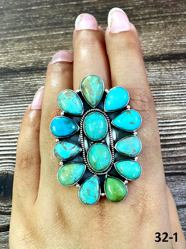 Southwest Made Royston Turquoise & Sterling Sliver Adjustable Ring. It measures 2 3/8 inch long and 1 5/8 inch wide.