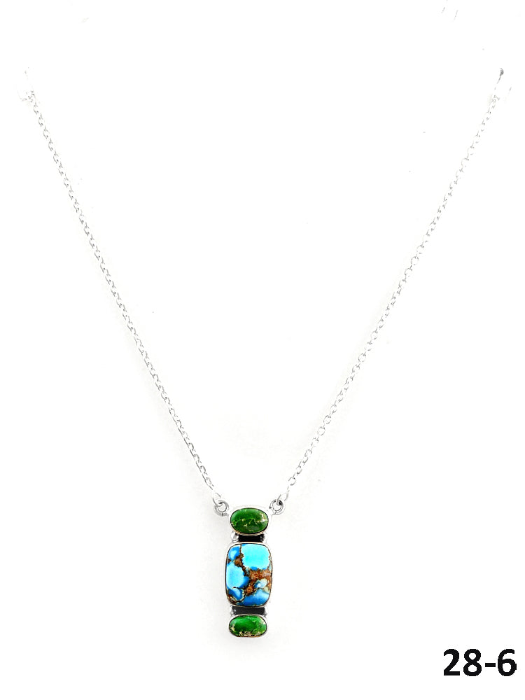 Southwest Made Sonoran Gold, Golden Hills & Sterling Silver Necklace. It measures just over 20 inches long with hang while the chain measures 18 inches long. Signed by the artist and stamped sterling silver.