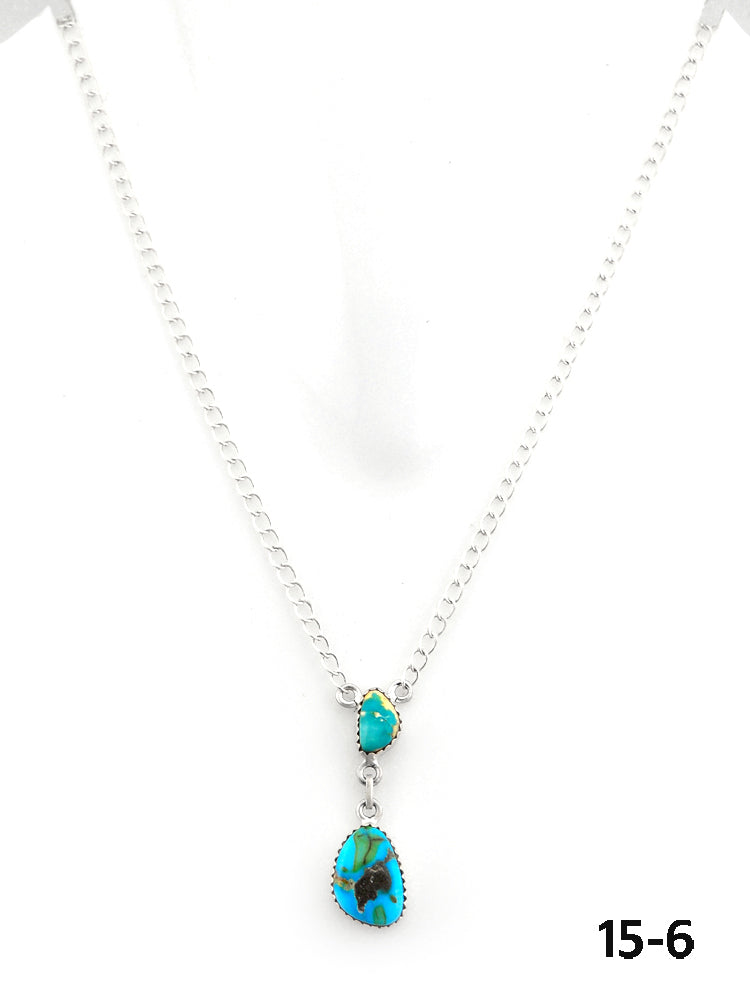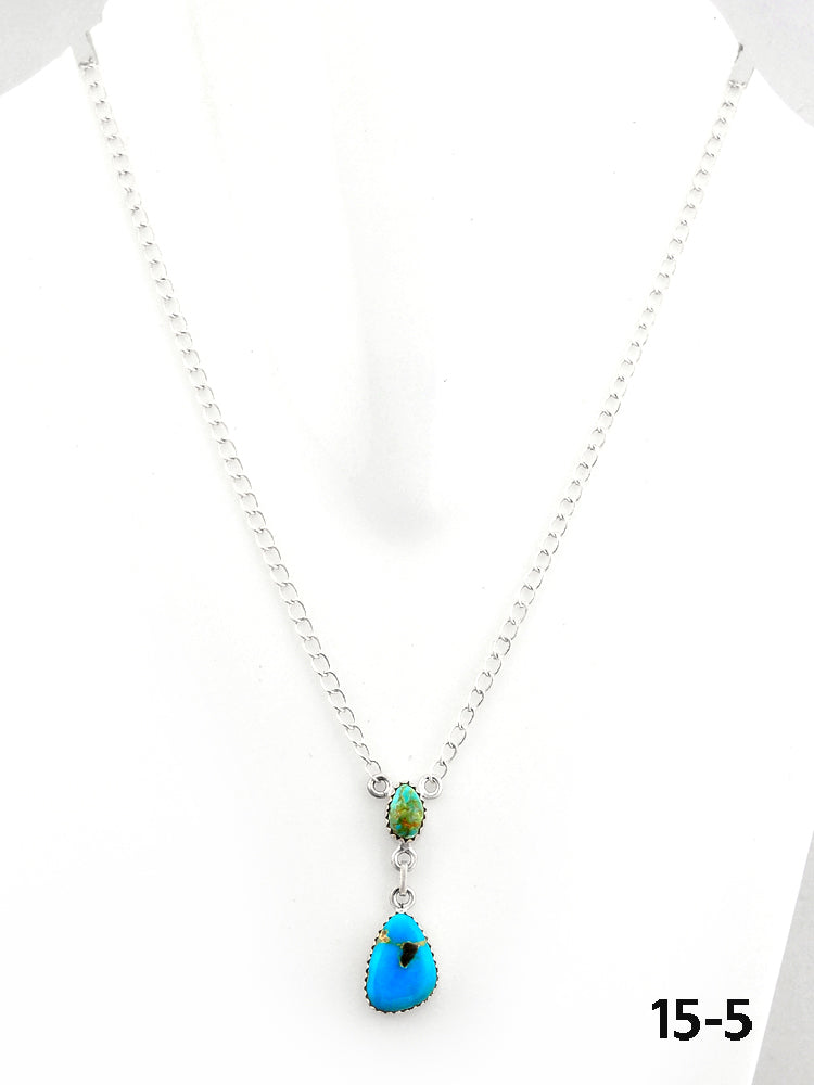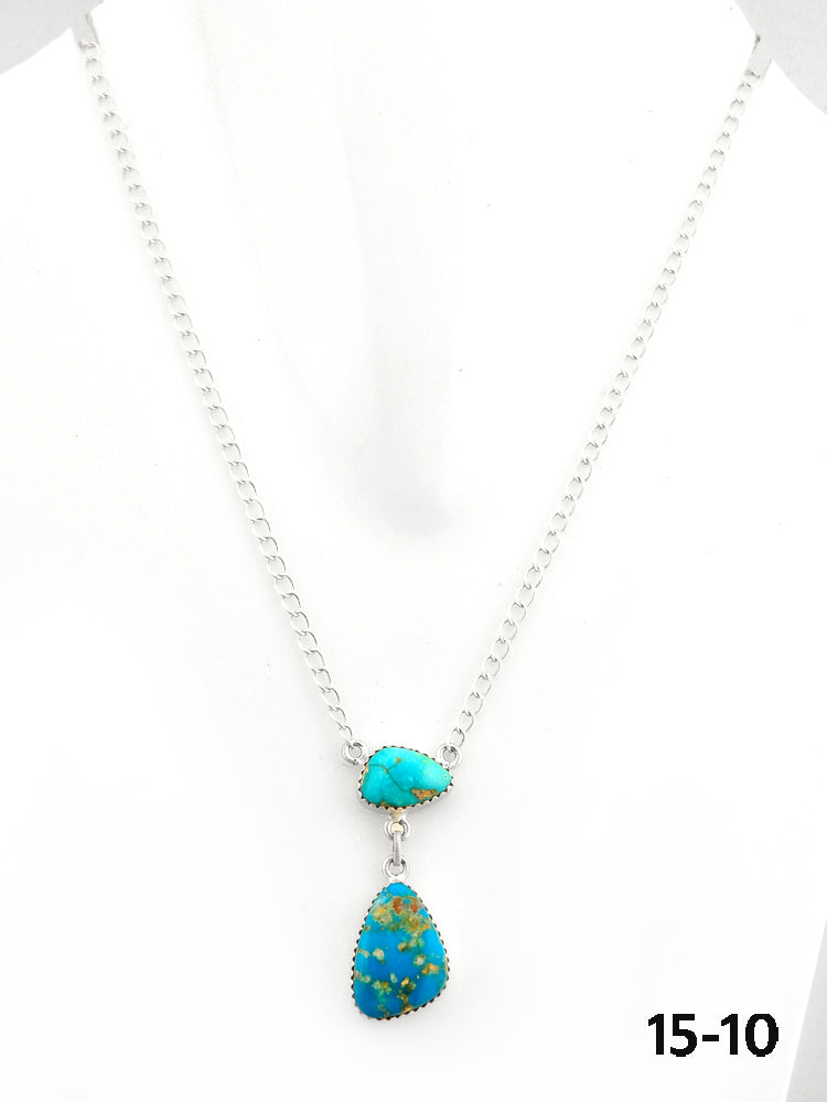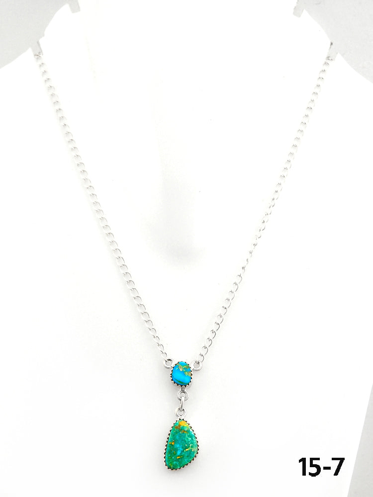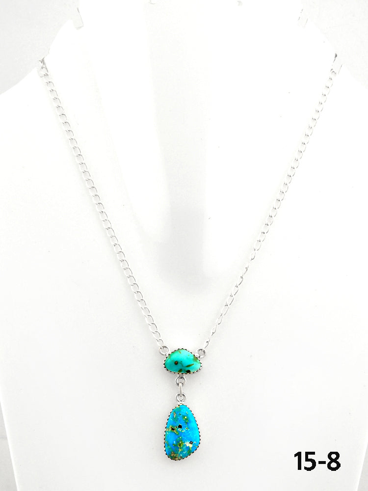 Southwest Made South Hill Turquoise & Sterling Silver Necklace. It measures 21 1/2 inches long with hang while the chain measures 18 inches long along with a drop measuring 1 3/4. Signed by the artist and stamped sterling silver.