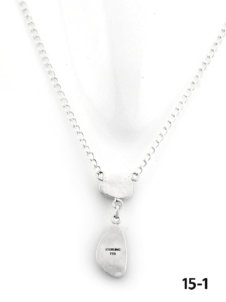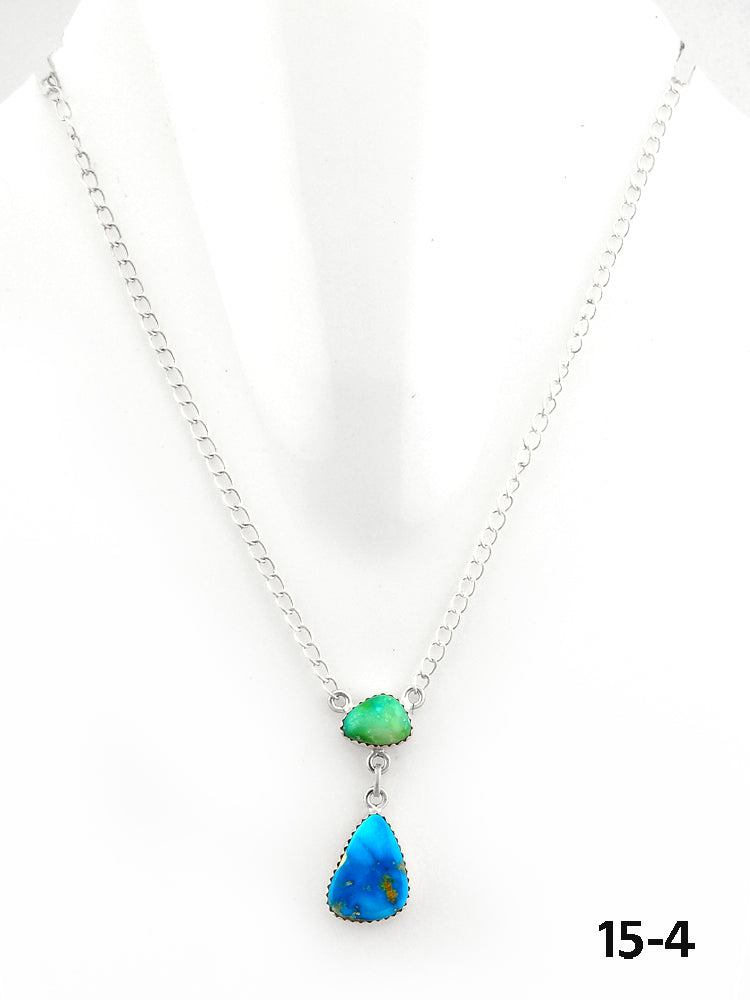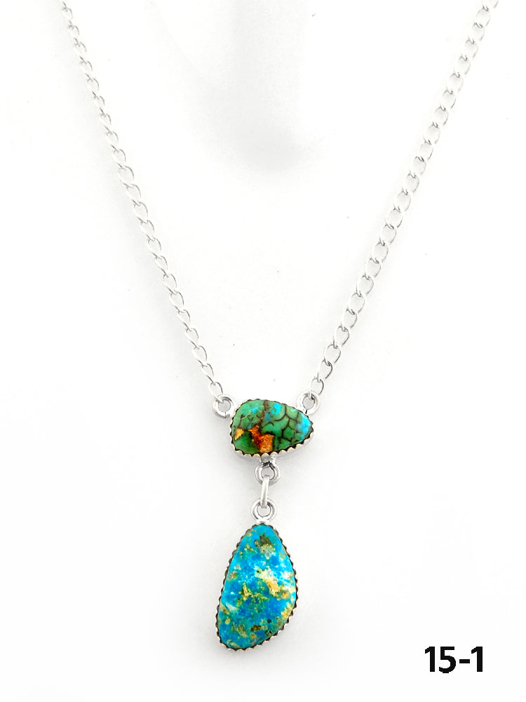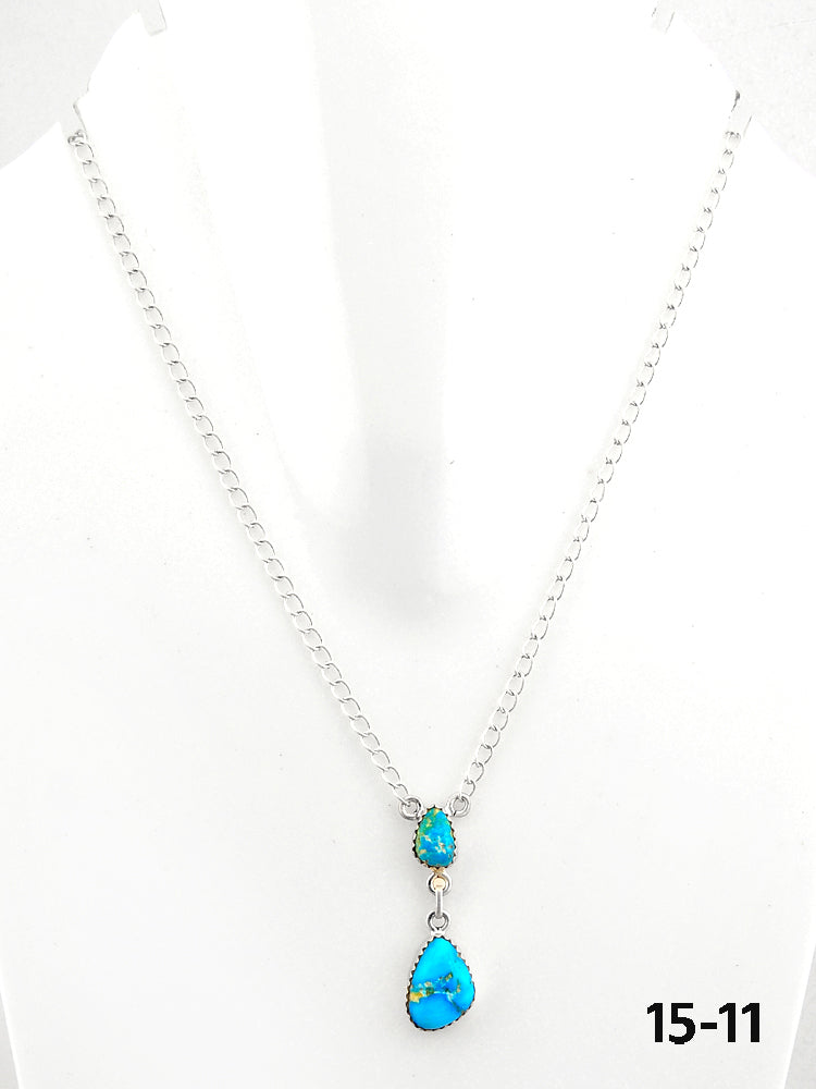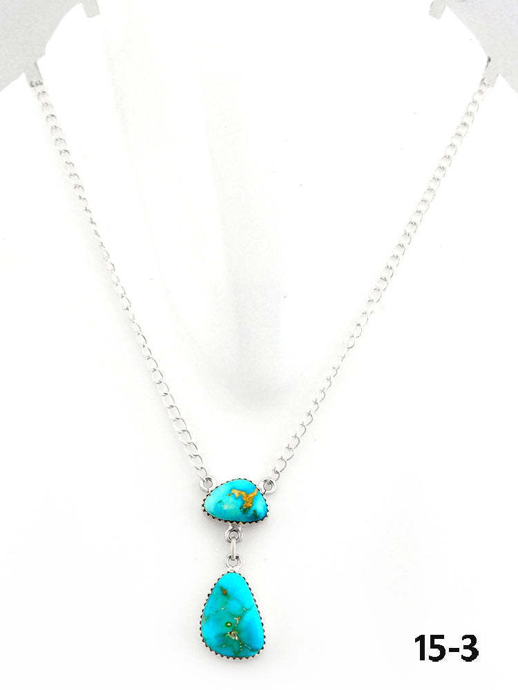 Southwest Made South Hill Turquoise & Sterling Silver Necklace. It measures 21 1/2 inches long with hang while the chain measures 18 inches long along with a drop measuring 1 3/4. Signed by the artist and stamped sterling silver.