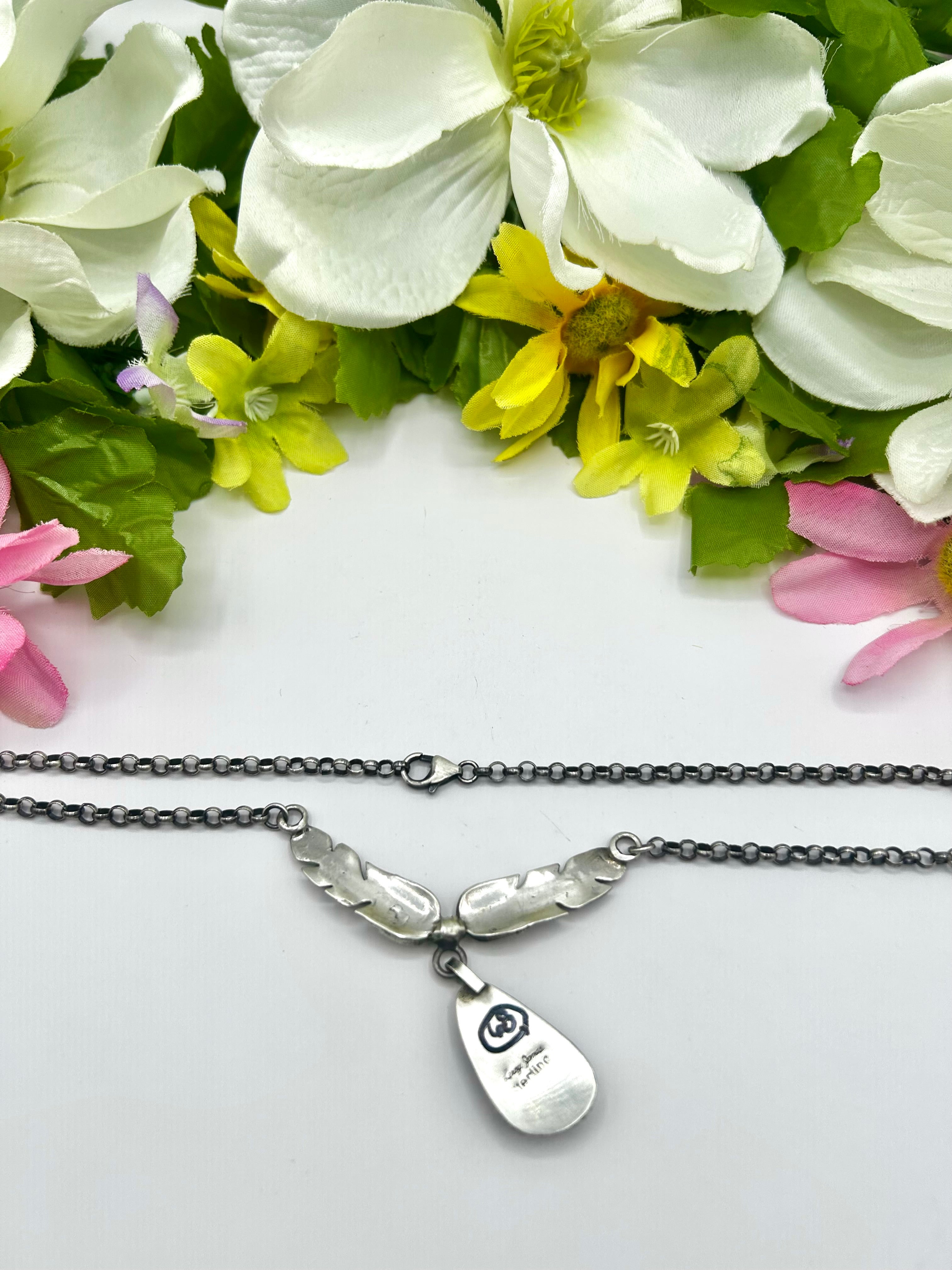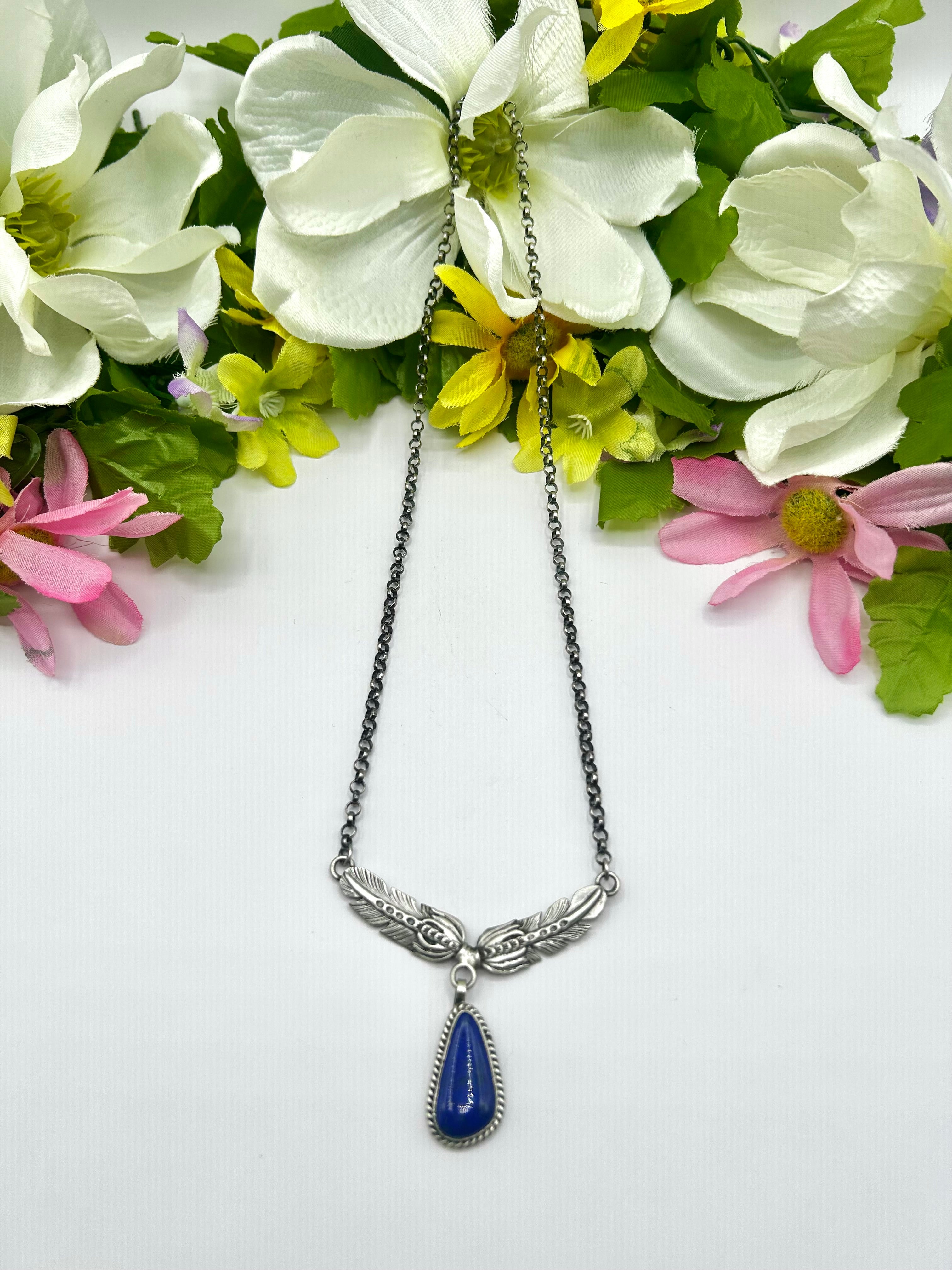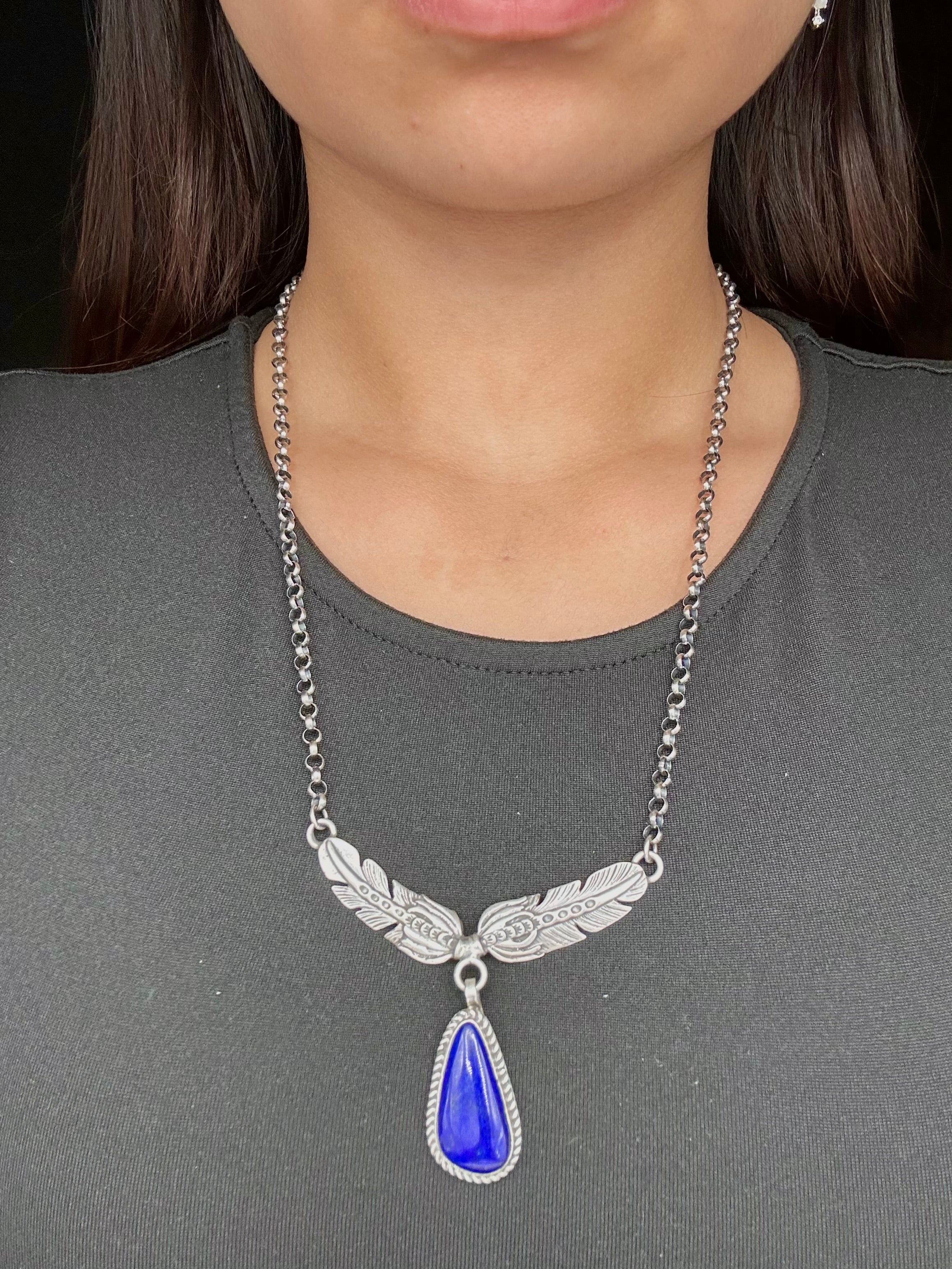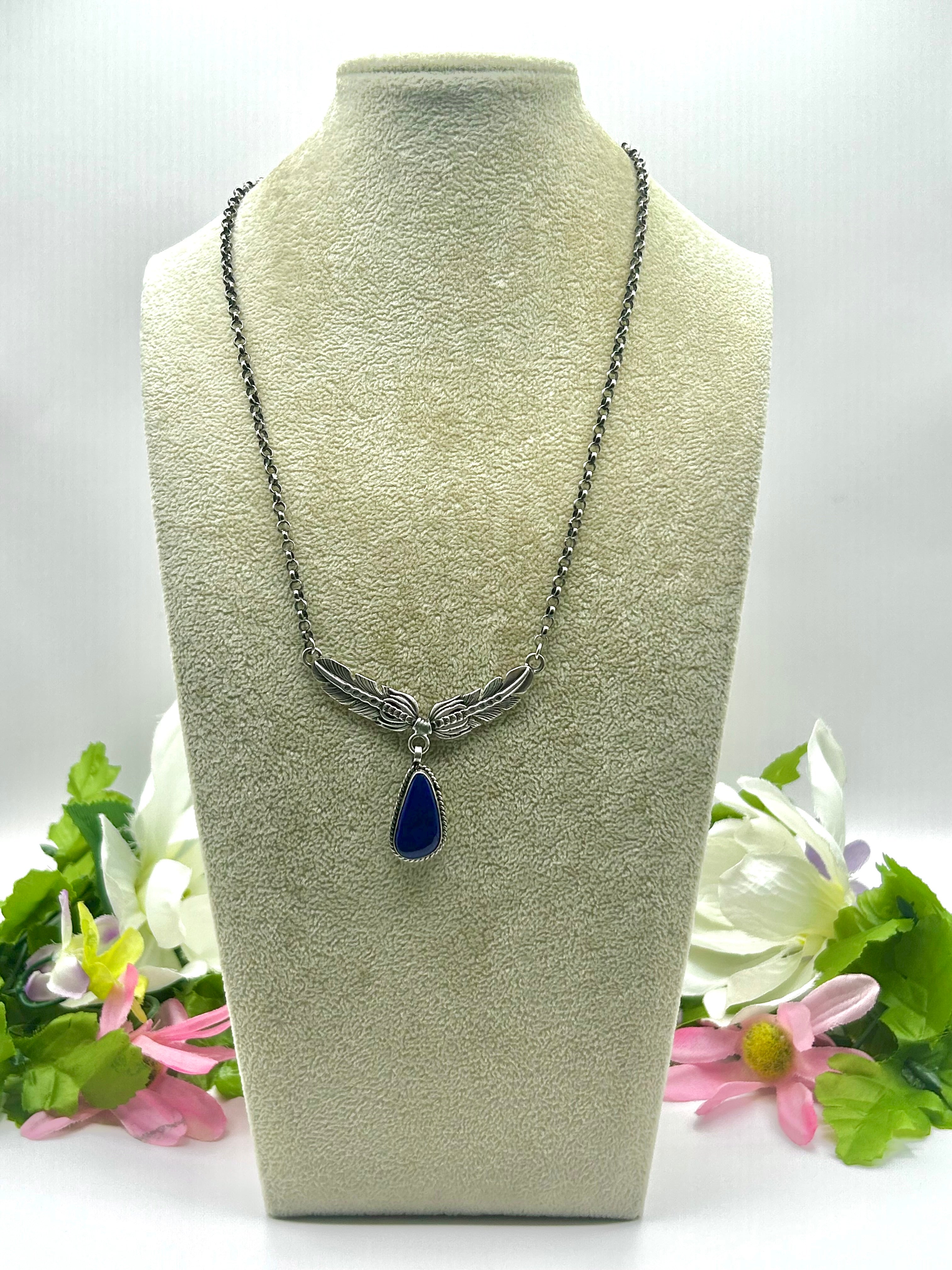 Navajo Made Lapis & Sterling Silver Necklace. It measures 23 inches long with hang while the chain measures 19 inches long. Signed by the artist and stamped sterling silver.