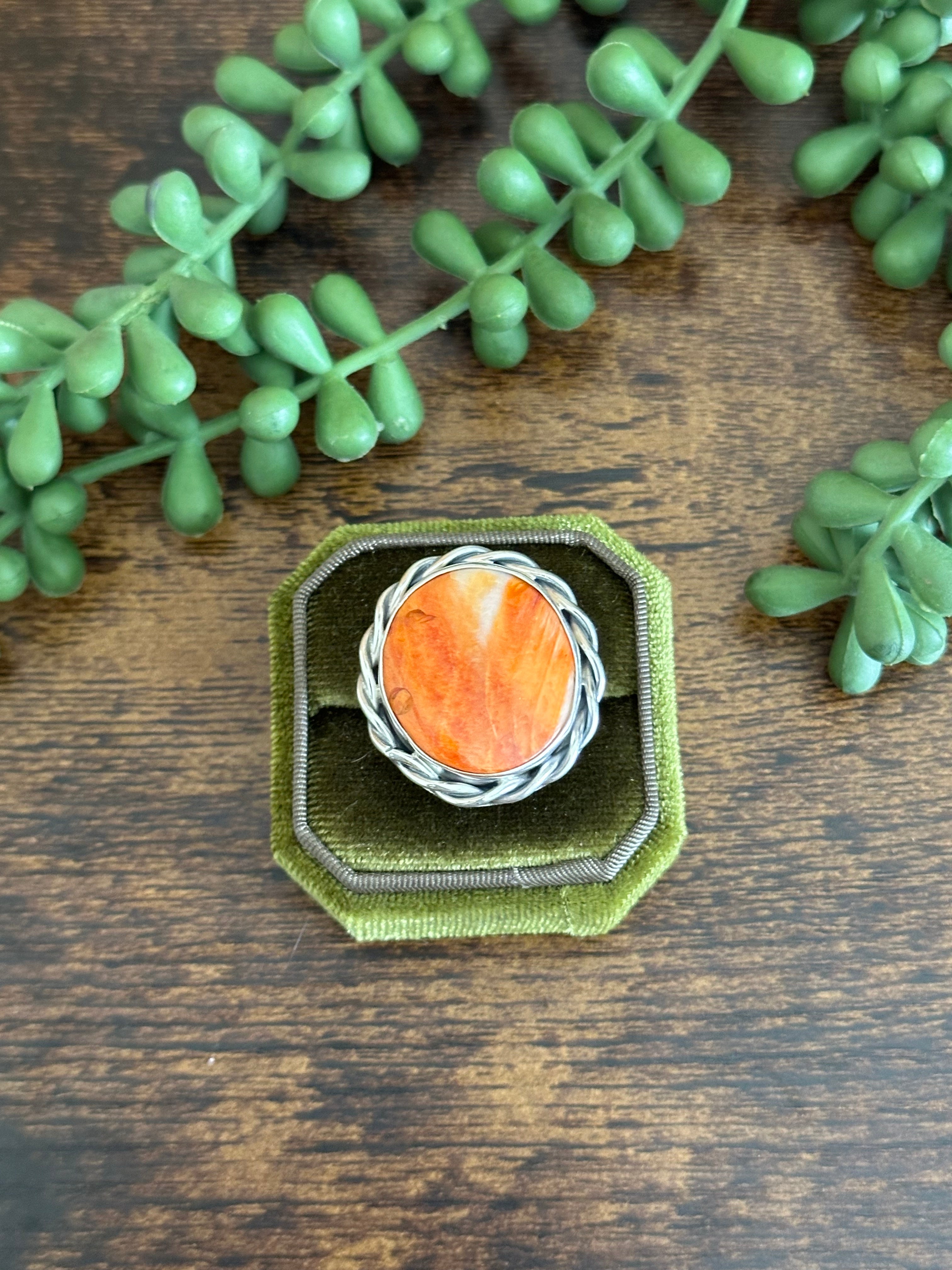 The most stunning ring. Navajo Handmade Spiny Oyster & Sterling Silver Ring Size 10.25. It measures 1 1/4 inches long and 1 1/8 inches wide. Stamped sterling silver and signed.