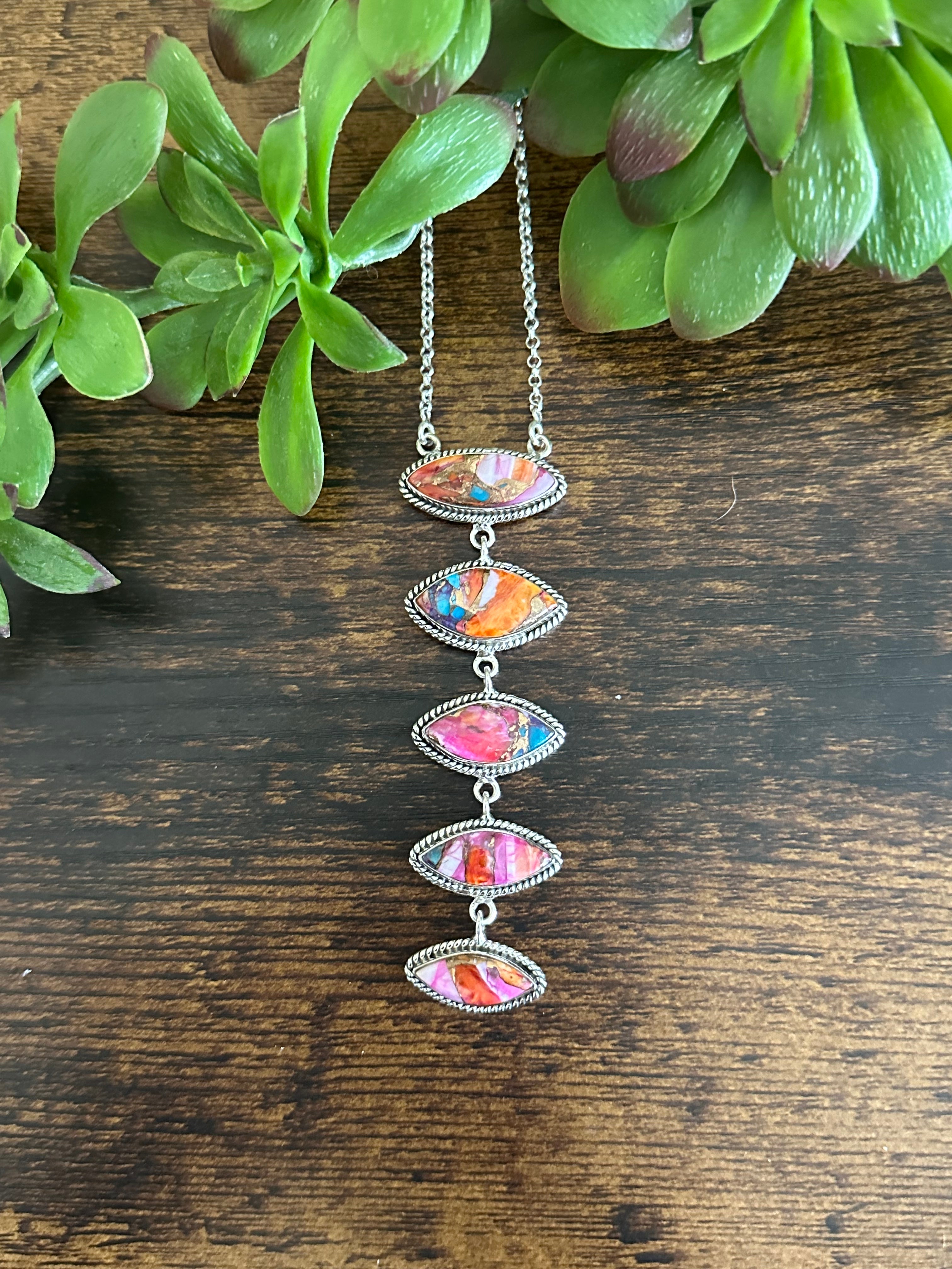 Beautiful necklace. Southwest Made Mohave Turquoise & Sterling Silver Necklace. It measures 28 inches long with hang while the chain by itself measures 20 inches long. Signed by the artist and stamped sterling silver.