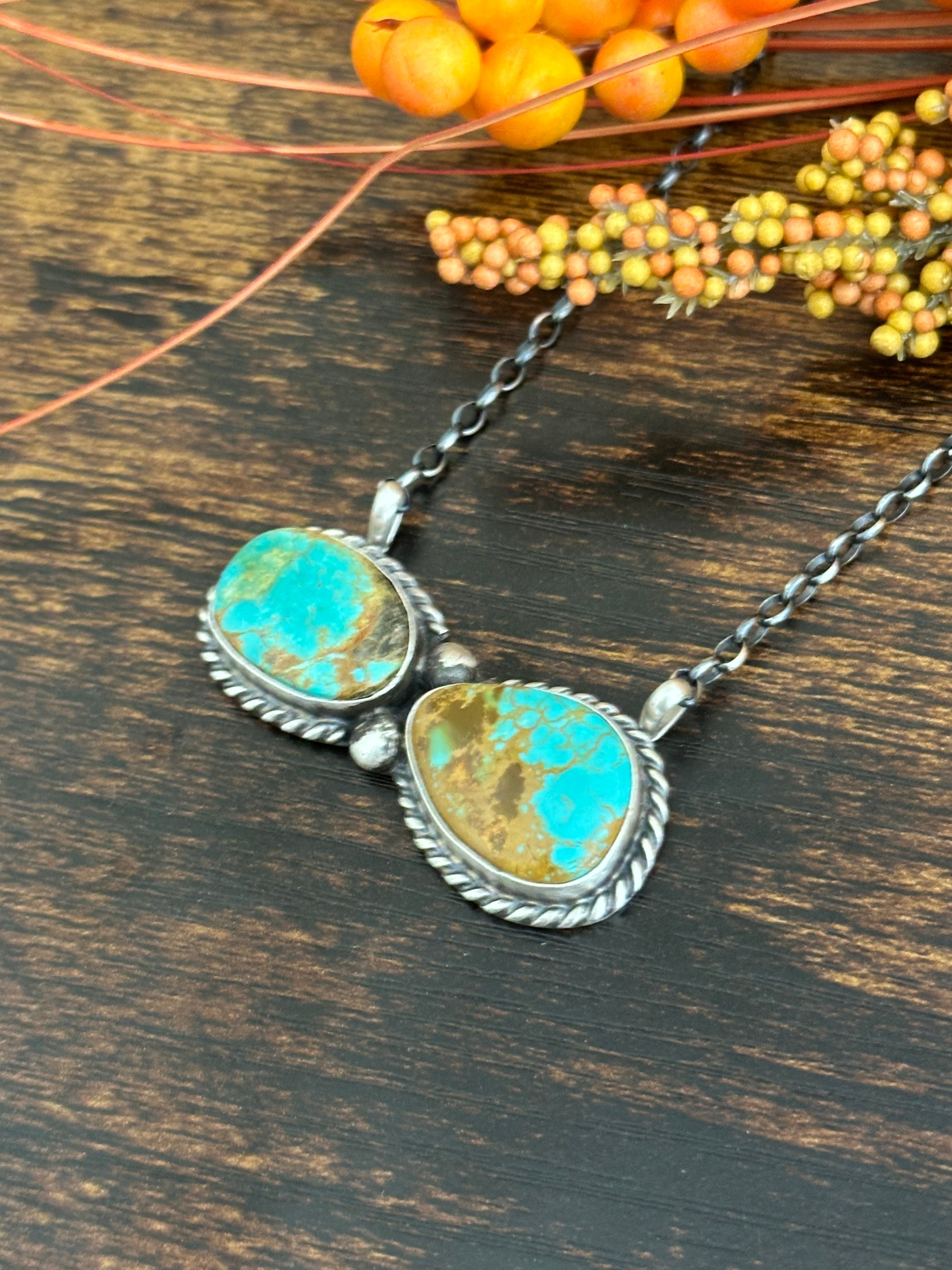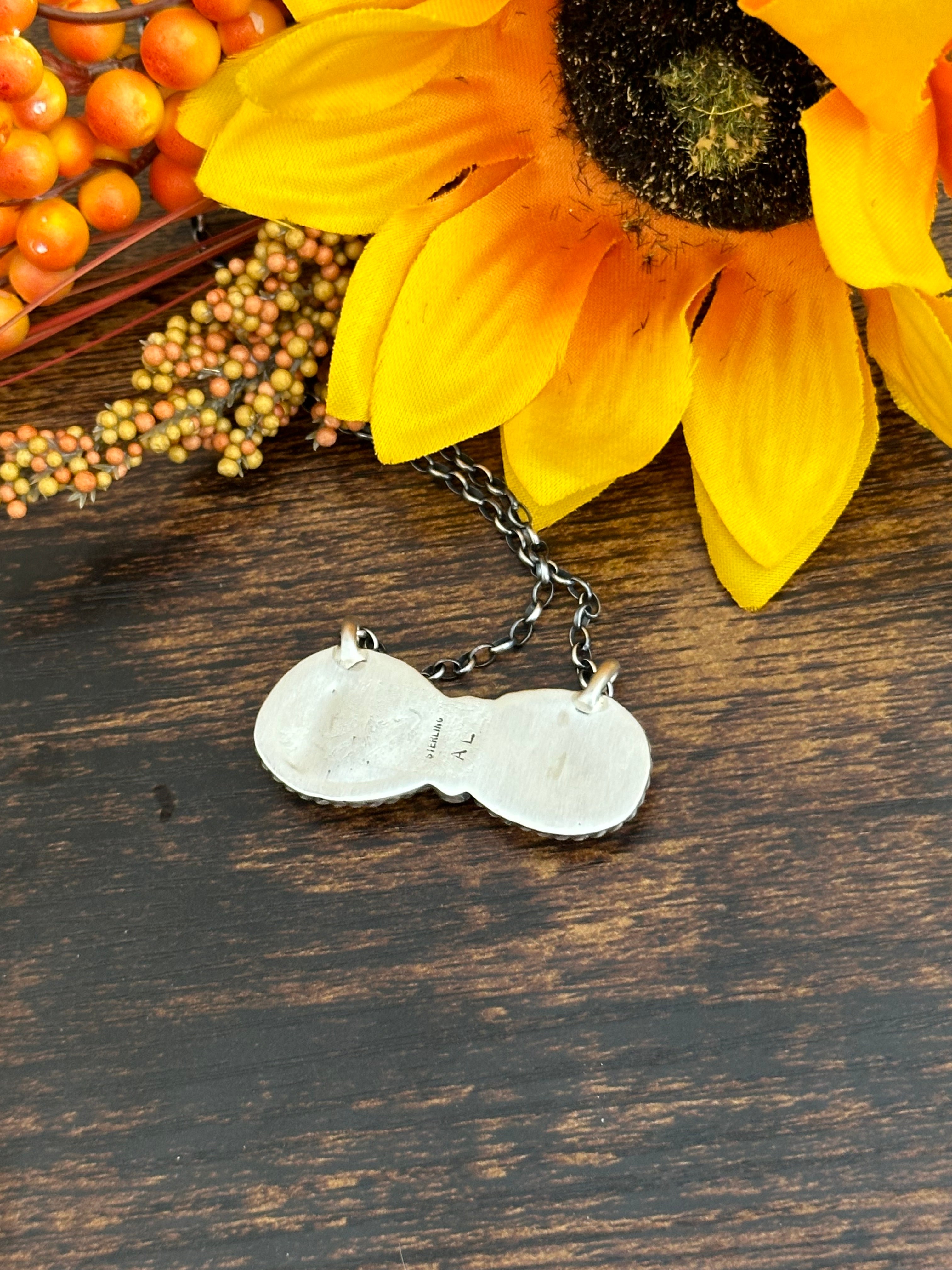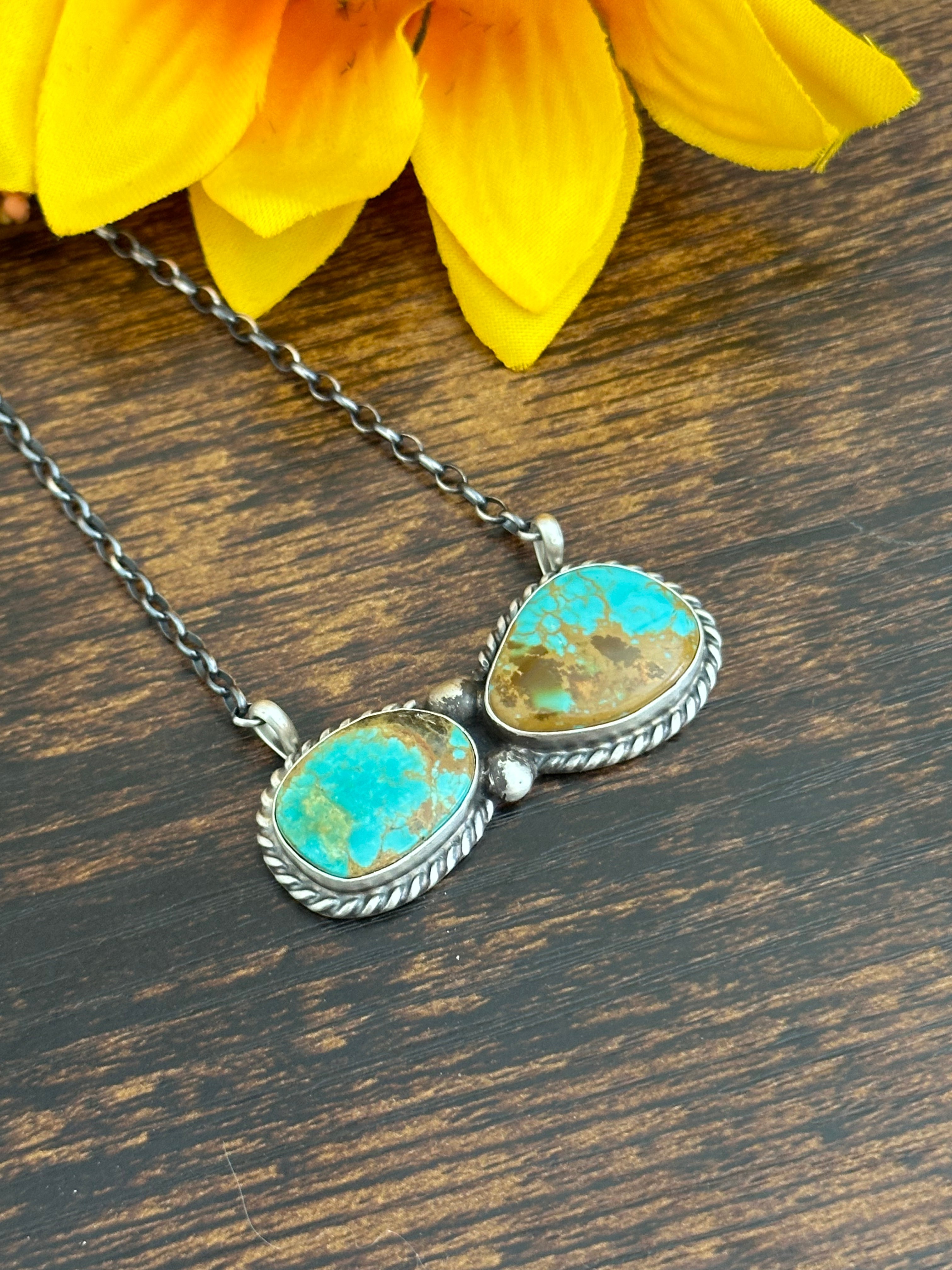 Beautiful necklace. Augustine Largo Royston Turquoise & Sterling Silver Necklace. It measures 17 1/2 inches long with hang while the chain by itself measures 16 inches long. Signed by the artist and stamped sterling silver.