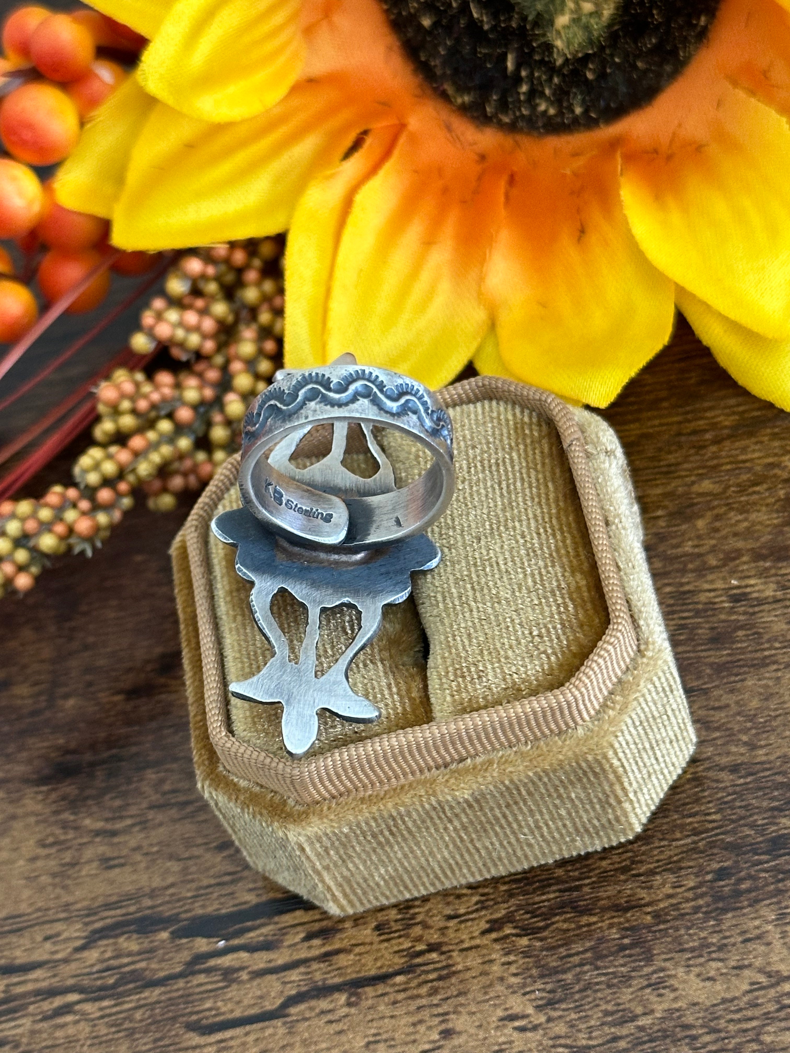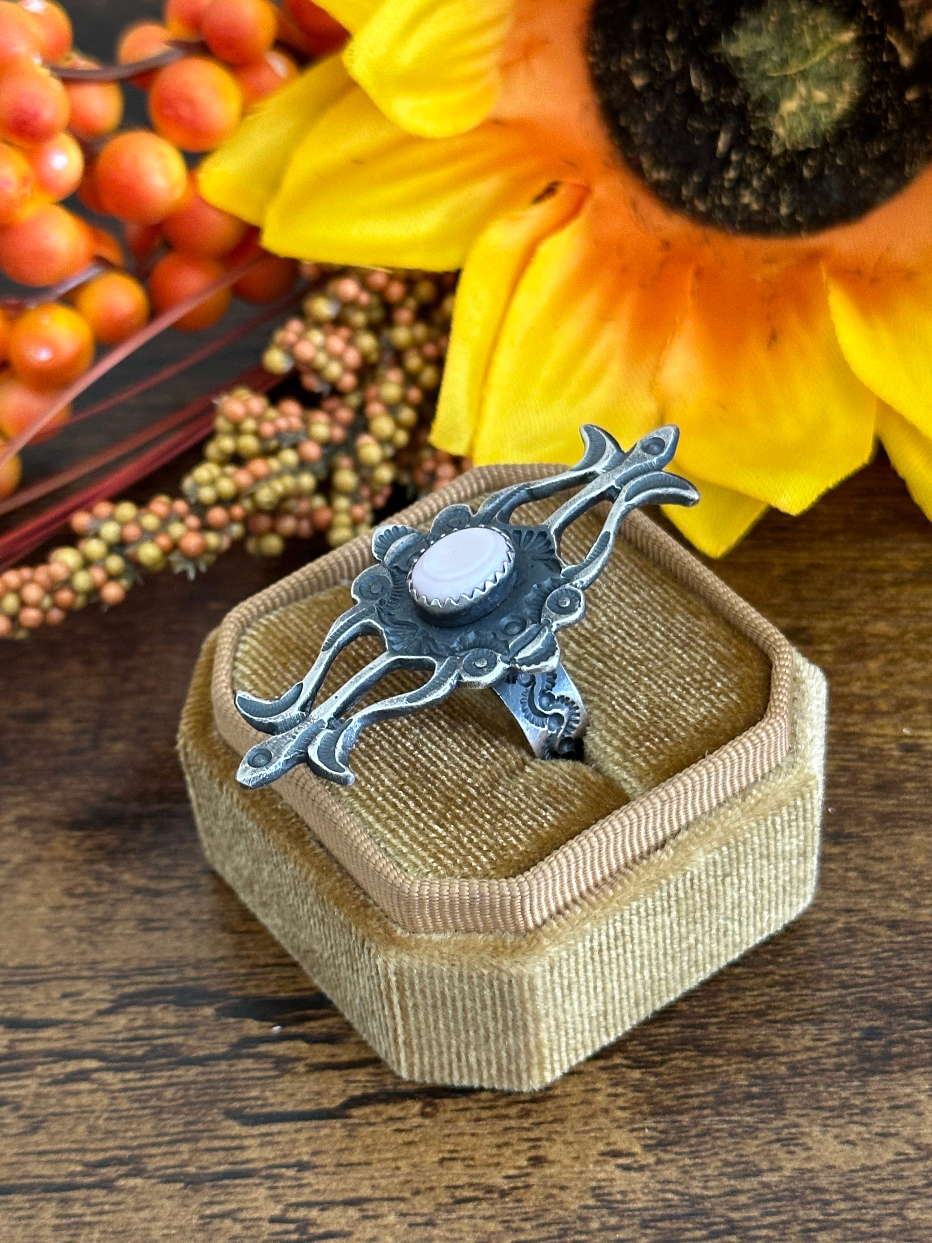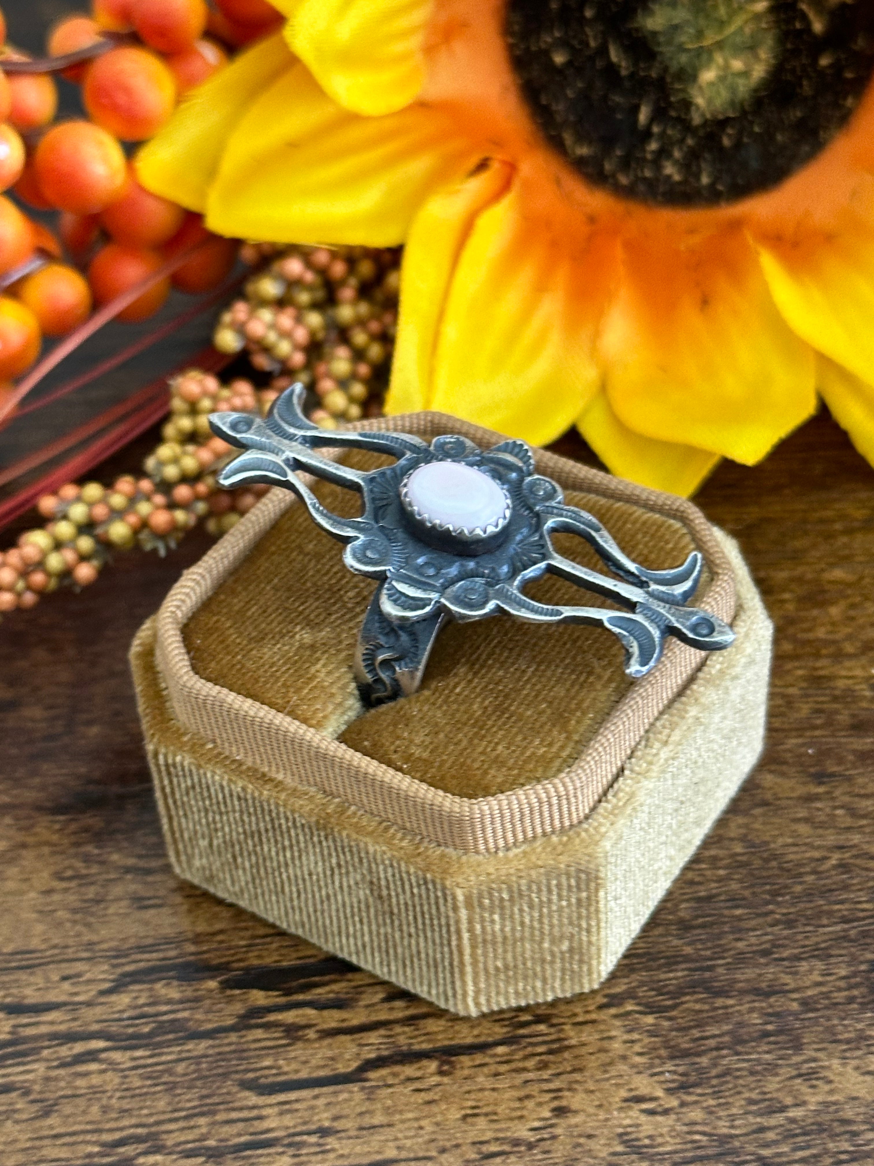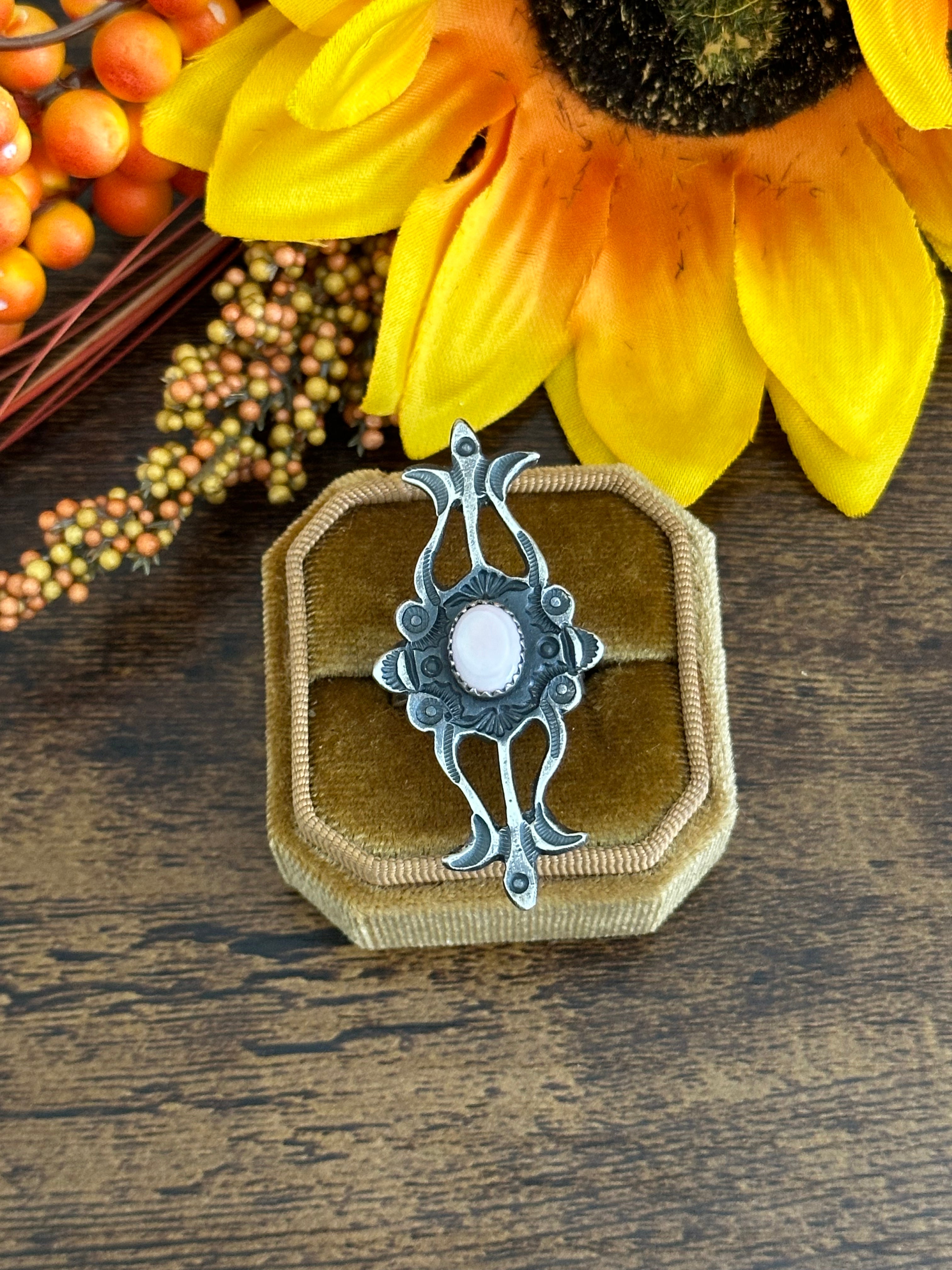 Beautiful Adjustable ring. Kindale Billah Pink Conch & Sterling Silver Adjustable Ring. It measures 2 1/8 inches long and just under 1 inch wide. Signed by the artist and stamped sterling silver.